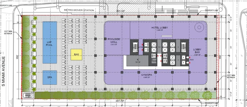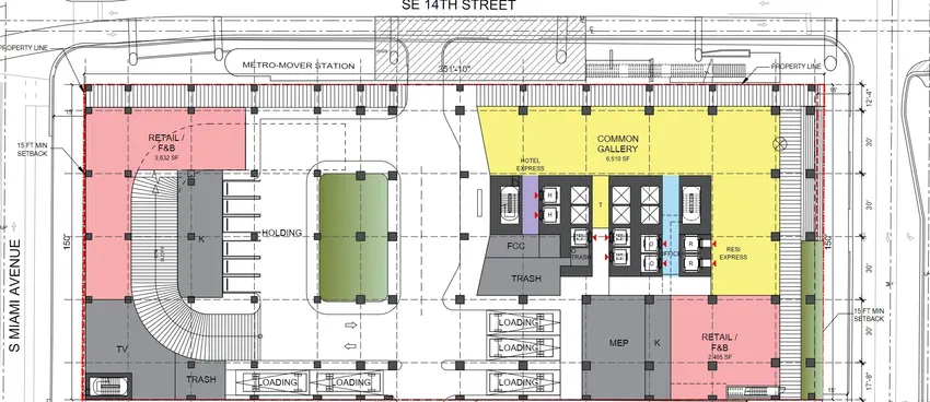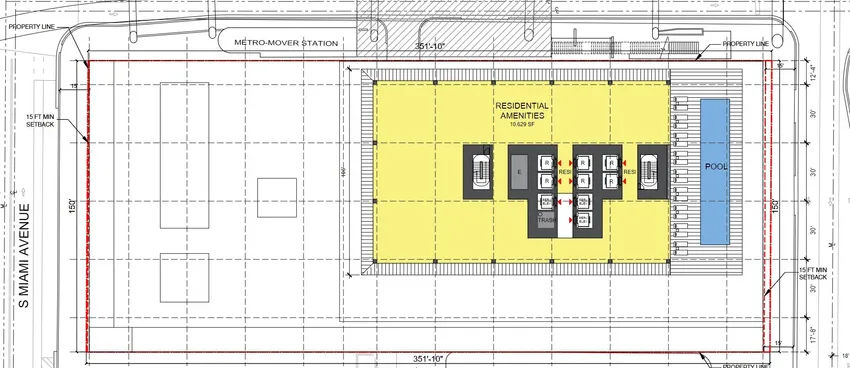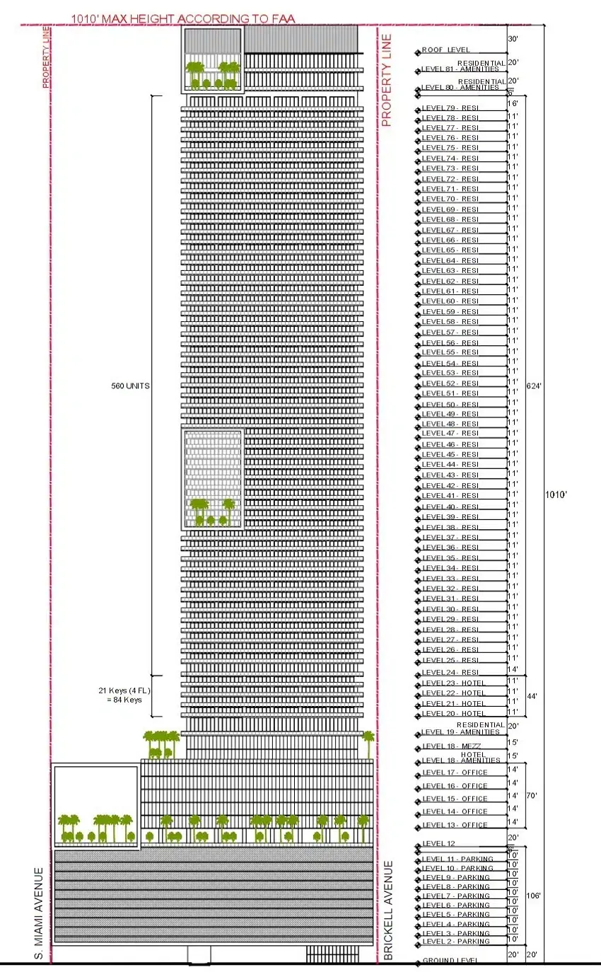 • Предполагаемая высота — 81 этаж / 1 010 футов (308 м), что делает 1414 Brickell Tower одним из самых амбициозных небоскрёбов Майами.