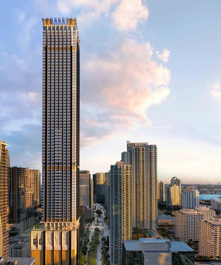 Великолепная 90-этажная башня с фасадом из травертина в цвете слоновой кости и черного глянца, станет архитектурным шедевром и рекордным по высоте (320 метров) жилым строением в Майами. Грациозно демонстрируя инновационное сочетание жилых резиденций с гибридной планировкой для лёгкого преобразования, уникальную дизайнерскую отделку из редких пород дерева и камня с ручной инкрустацией, и услуги клубного отеля.