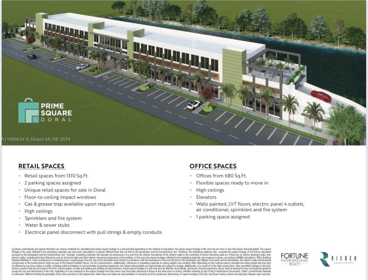 RETAIL SPACES • Retail spaces from 1310 Sq.Ft. • 2 parking spaces assigned • Unique retail spaces for sale in Doral • Floor-to-ceiling impact windows • Gas & grease trap available upon request • High ceilings • Sprinklers and fire system • Water & sewer stubs • Electrical panel disconnect with pull strings & empty conduits OFFICE SPACES • Offices from 680 Sq.Ft. • Flexible spaces ready to move in • High ceilings • Elevators • Walls painted, LVT floors, electric panel 4 outlets, air conditioner, sprinklers and fire system • 1 parking space assigned