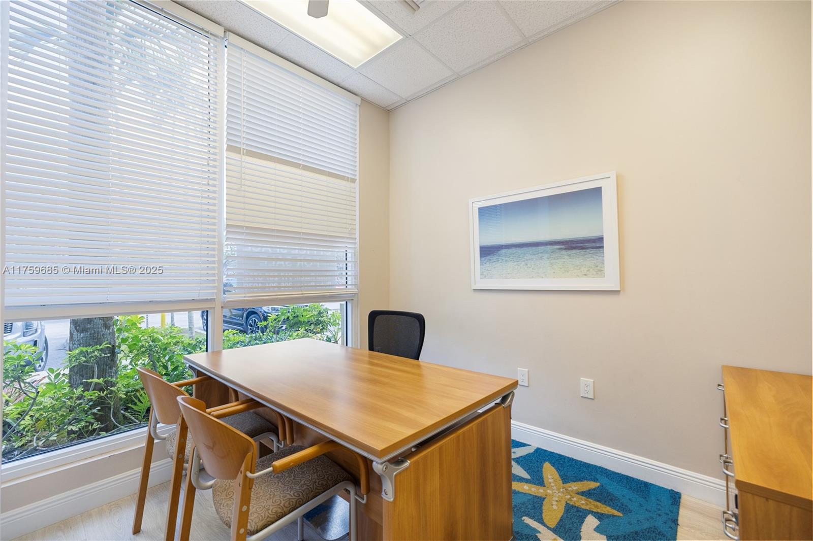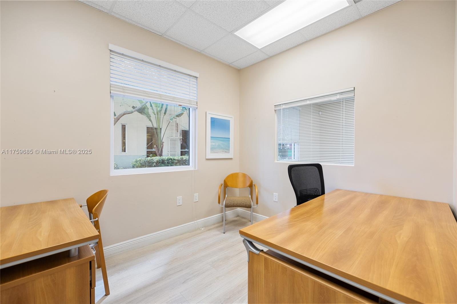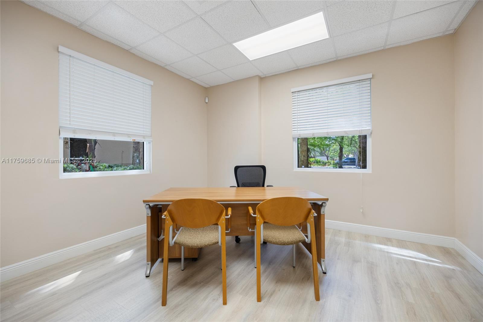 Turnkey Corner Office Condo in Plantation! This 964 sq. ft. professional office is move-in ready and includes furniture in the sale (excluding artwork). The well-designed layout features four private offices, a welcoming reception area, a kitchenette, a private restroom, and a storage room. Elegant wood flooring and large impact windows create a bright, professional atmosphere with storm protection. Additional highlights include a dedicated A/C system, sprinkler system, and a newly replaced roof. Perfect for medical, legal, financial, or professional services, this prime corner unit is located in a thriving business district with ample parking and easy access to major roadways. Don’t miss this rare opportunity to own a fully furnished office in a sought-after commercial area!