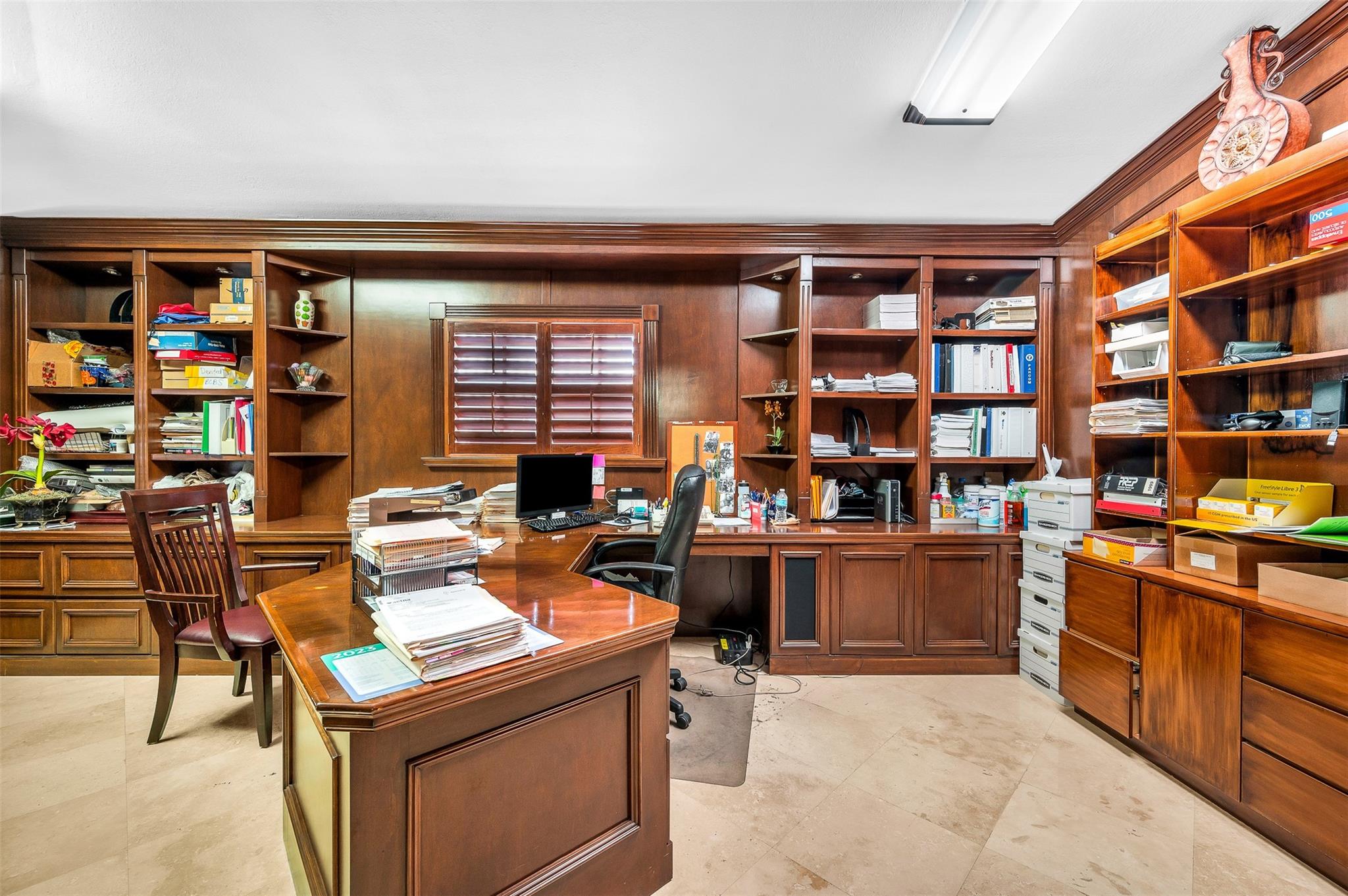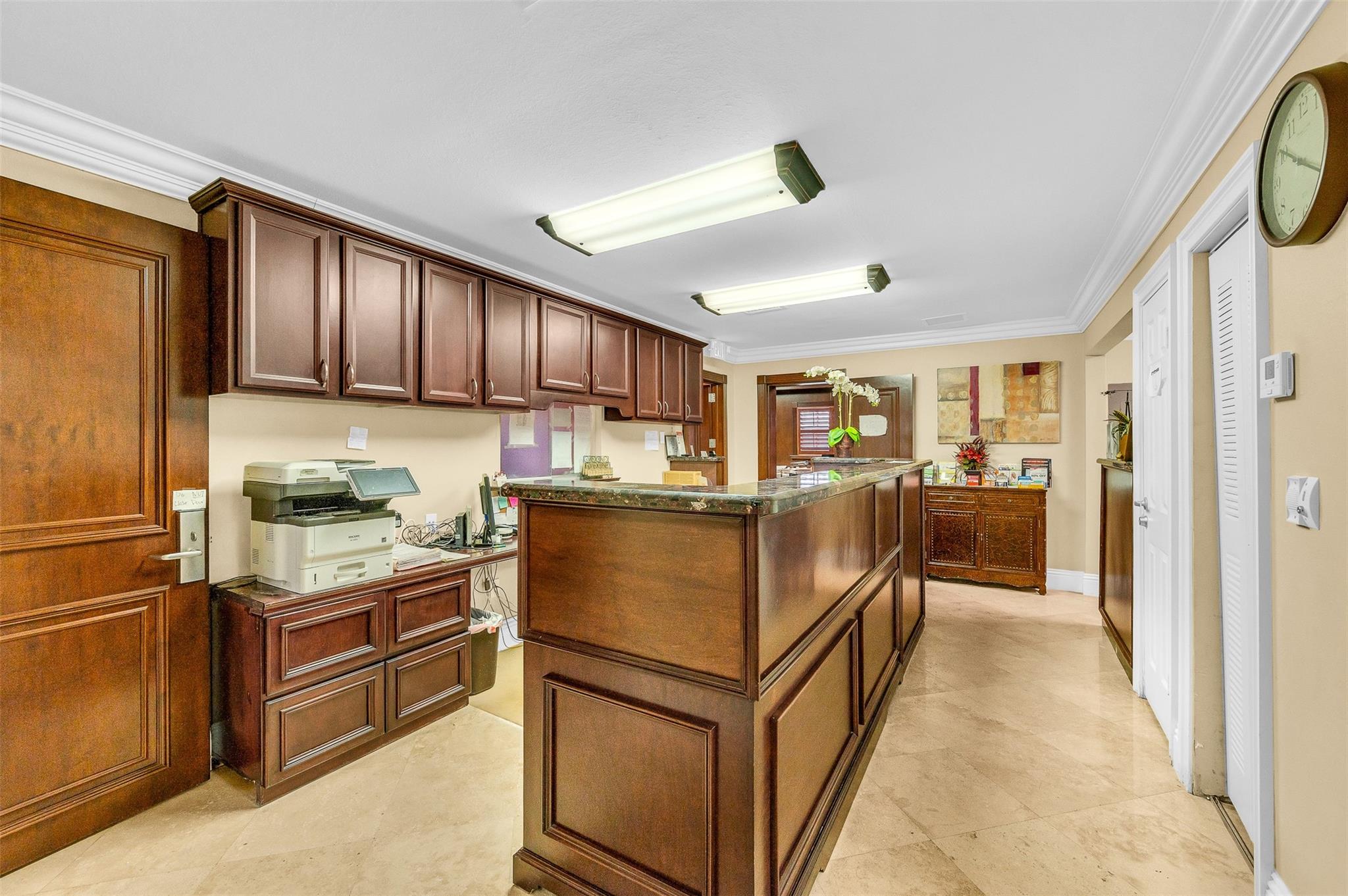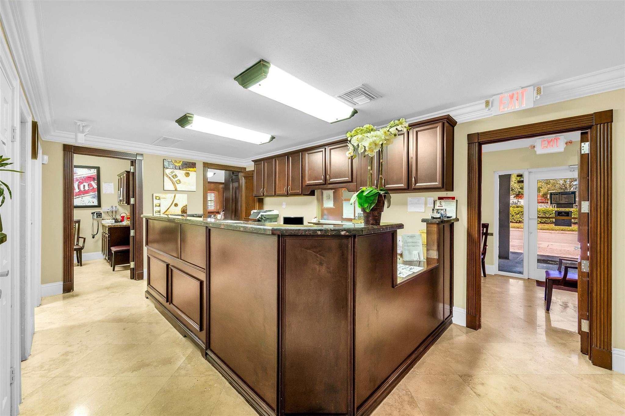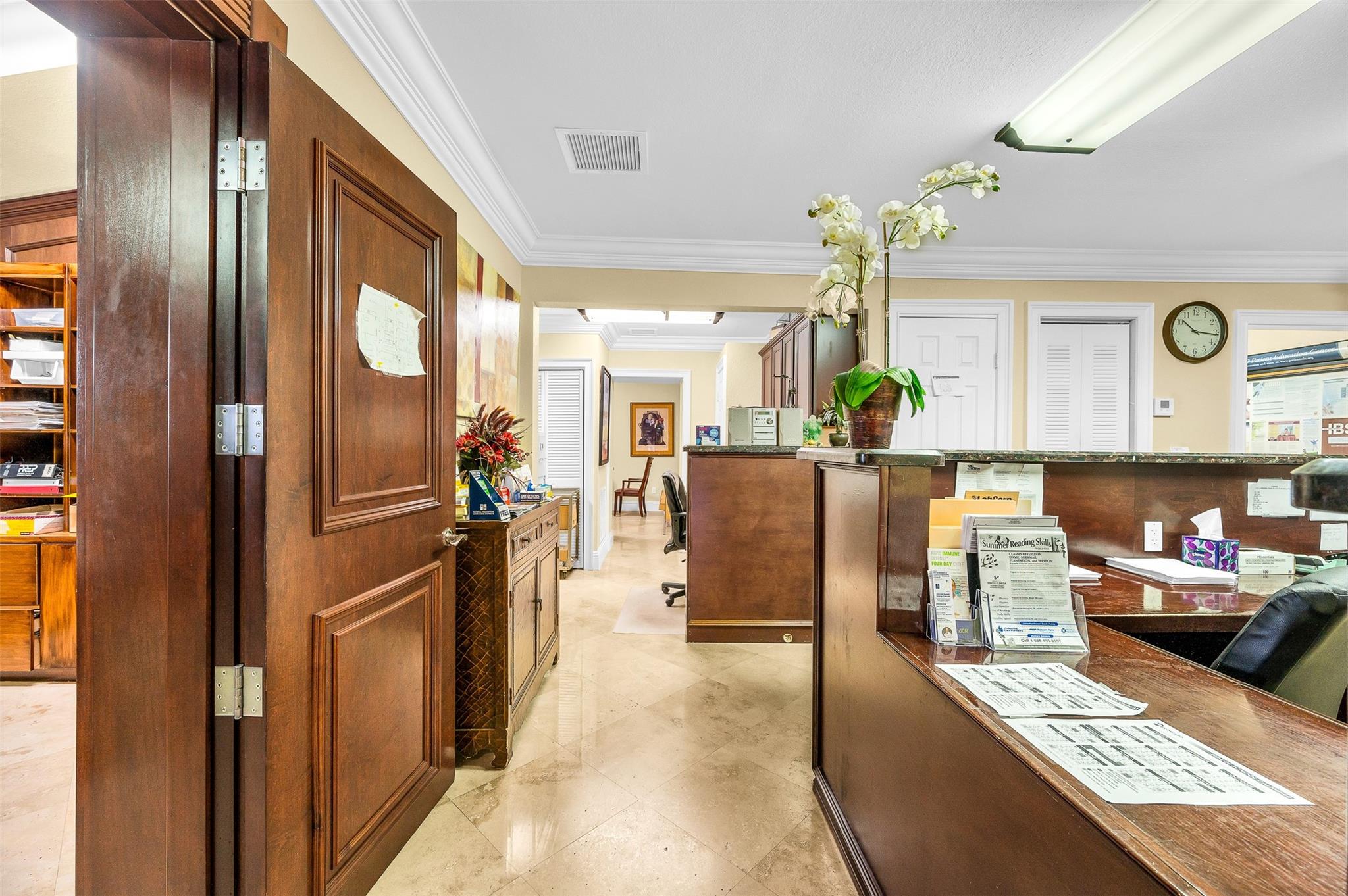 Rarely available Freestanding building. One story building with great floorplan for professional offices, business services, day nursery and civic organizations. Currently used as medical office. SR-7 frontage road on east side of SR-7. Move in ready with travertine marble flooring throughout, custom wooden built outs and cabinetry. Storm shutters. 11 parking spaces including one handicap spot. A/C is one year old. Showings by appointment only.