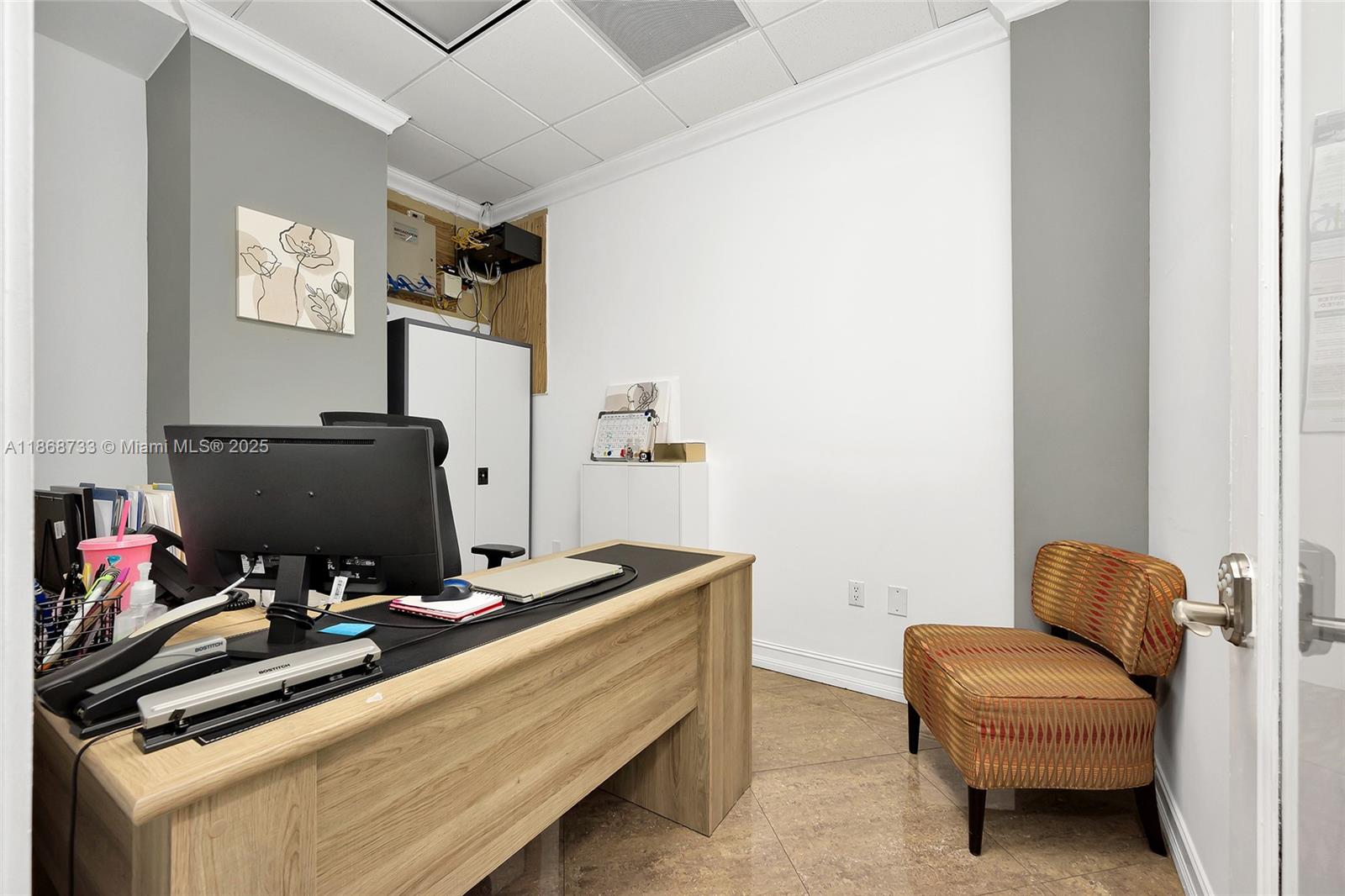 Outstanding opportunity to acquire 2 adjacent, fully built-out offices. While currently separated, these units can be easily combined to create a larger, cohesive workspace. The space is designed with upscale finishes throughout, featuring elegant waiting areas, well-appointed conference rooms, and multiple private offices. Each unit is equipped with its own separate AC unit. Units boast drop ceilings and impact-resistant windows. This offering also includes seven premium-covered parking spaces located on the 2nd floor, providing excellent accessibility. This property is fully finished and designed with an upscale professional image.Ideal for future growth or expansion for a business. Prime location for any business seeking a prestigious office presence