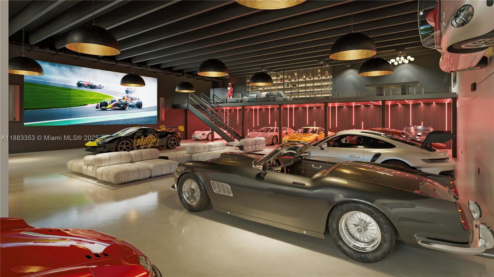 PERSONAL COLLECTION WAREHOUSE. Designed by Strang Architecture, the 2021 build-out offers luxury finishes throughout. 4300 sq. feet plus and additional 700 sq. feet divided into two mezzanines. The image gallery shows conceptual renderings showcasing how the current space can be easily modified with minor details into a gallery-style venue suitable for: Exotic cars, Rare art, Fine wine collections. The building’s solid concrete construction and extensive security features ensure the safety of valuable assets. It is also located away from the coastline, protecting contents from corrosive salt air.