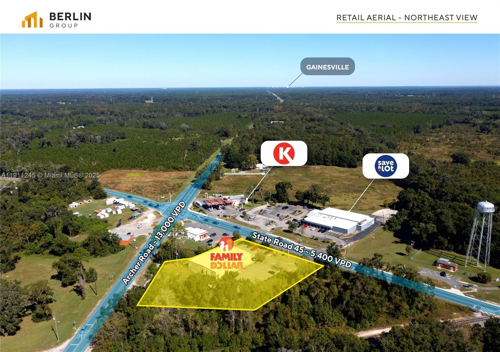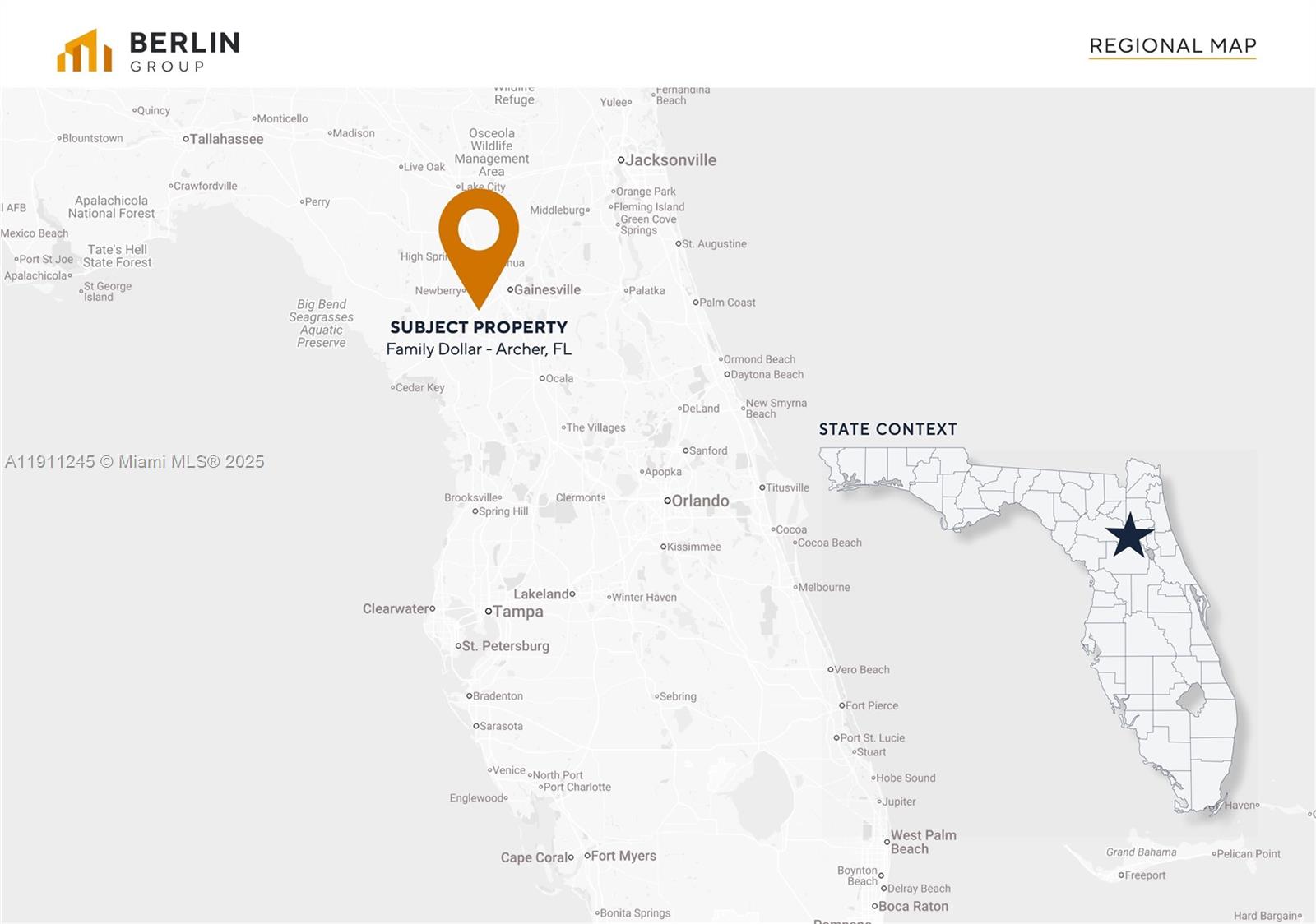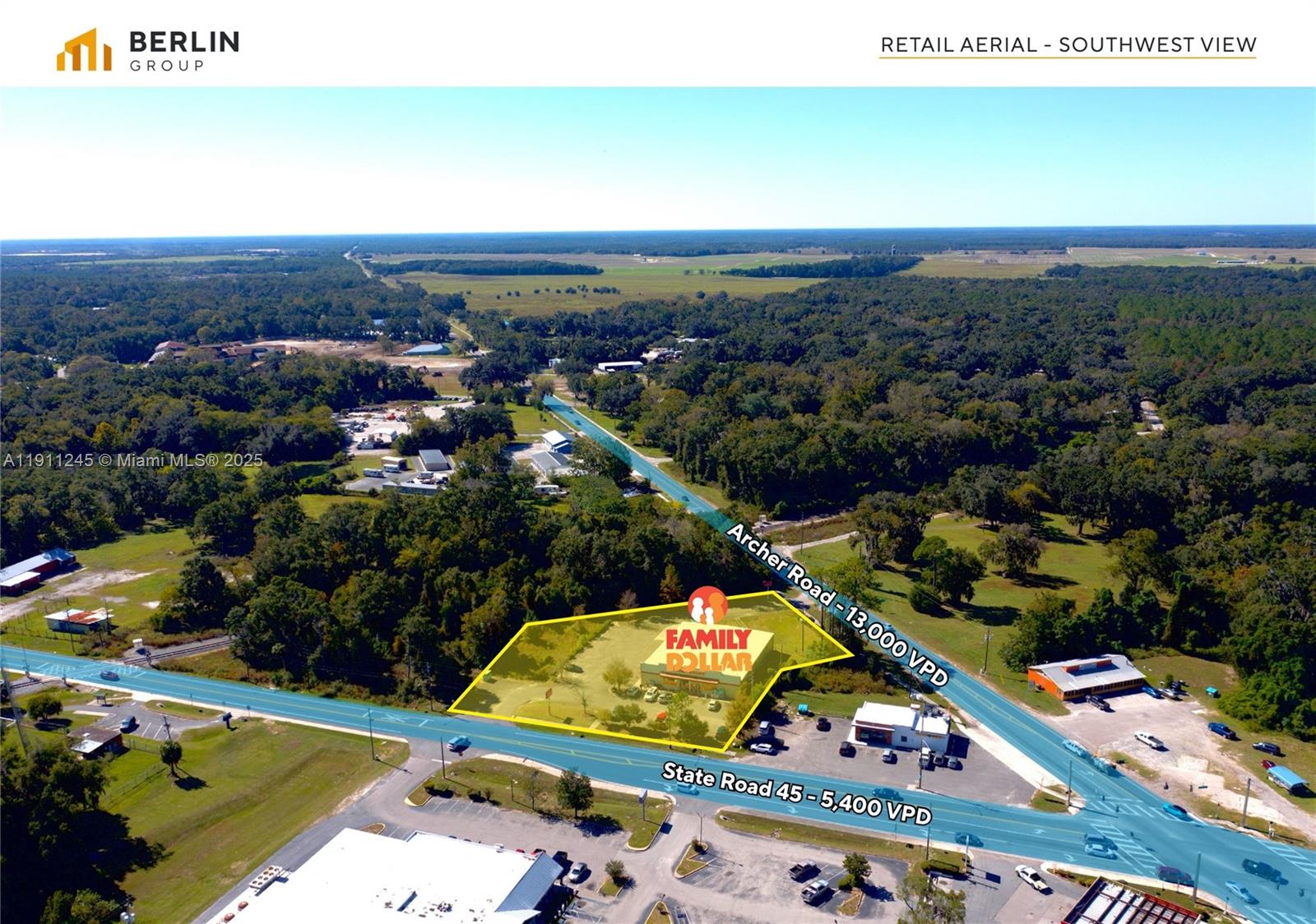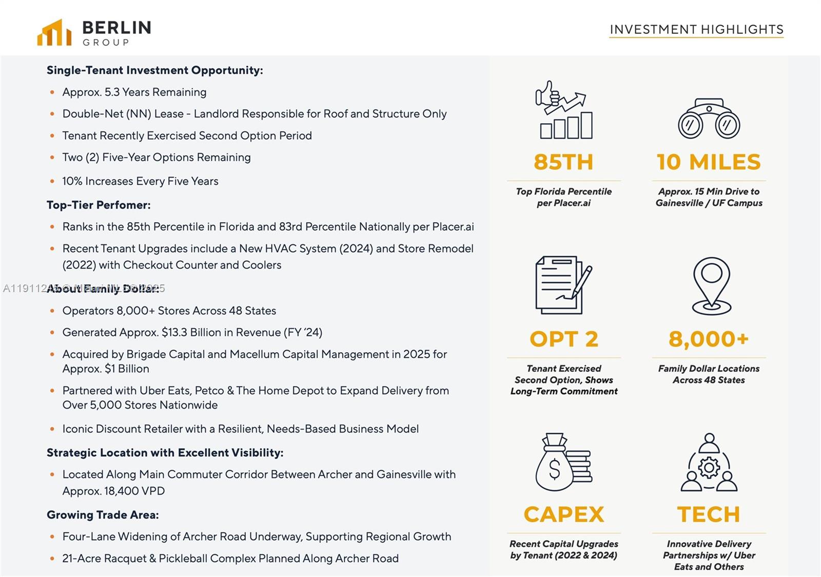 The subject property is a Family Dollar in Archer, FL, just outside Gainesville. This location ranks in the 85th percentile in Florida and 83rd percentile nationally per Placer.ai, placing it among the top-performing Family Dollar stores in the country. This exceptional ranking underscores a high-traffic, resilient trade area with a consistent draw from the broader Gainesville metro. The tenant recently exercised its second option period, demonstrating a clear long-term commitment to the site. The property is leased on a Double-Net (NN) basis with over five years remaining and 10% rent increases at each option period, providing dependable and growing income.