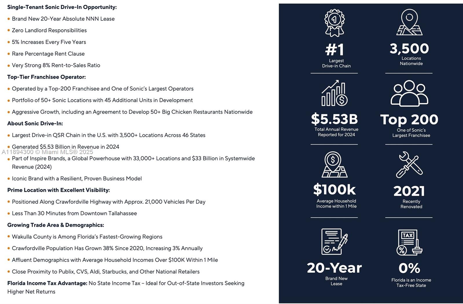 Berlin Group is pleased to present this Sonic-leased property in Crawfordville, comprising approx. 1,498 square feet with a drive-thru lane and multiple covered carhop stalls. The property benefits from prime frontage along Crawfordville Highway, the market's main commercial corridor with excellent visibility and traffic counts of roughly 21,000 vehicles per day. The asset is secured by a brand-new 20-year absolute NNN lease with a top-200 Sonic franchisee, one of the brand's most successful operators, providing investors with long-term, stable cash flow, and truly passive ownership. Notably, the lease includes a rare percentage rent clause, offering investors potential upside in addition to the base rent.