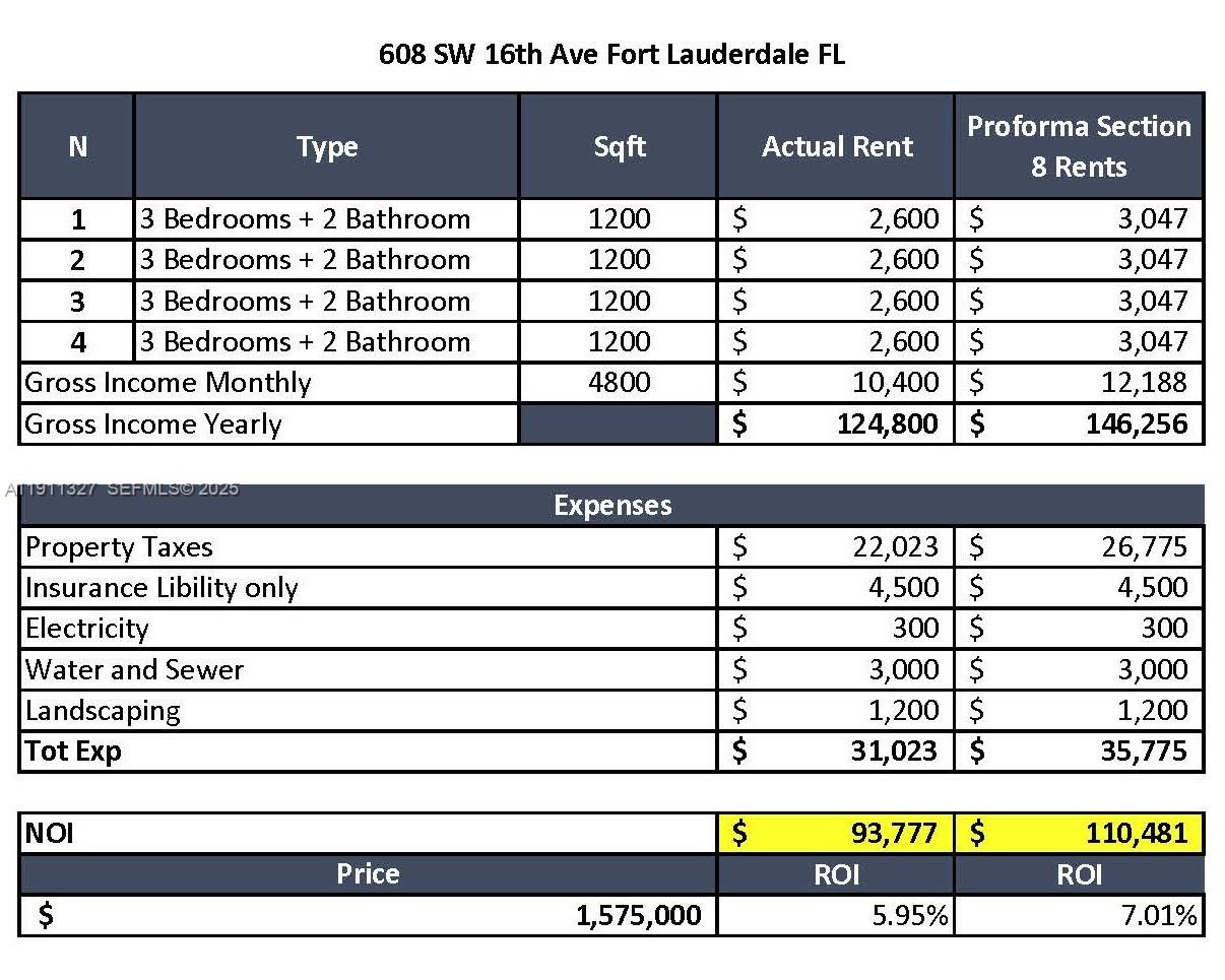 Motivated Seller. This building is perfect for section 8. Section pays for this Zip code $3,047. That brings in $146K gross and about $115K Net. It consist of four units of 3 bedrooms 2 Bathrooms of 1,200 SF each. Two closets of laundry. 6 parking spaces total. Freshly painted . Impact windows. CAP of 7%. 40% of seller financing.