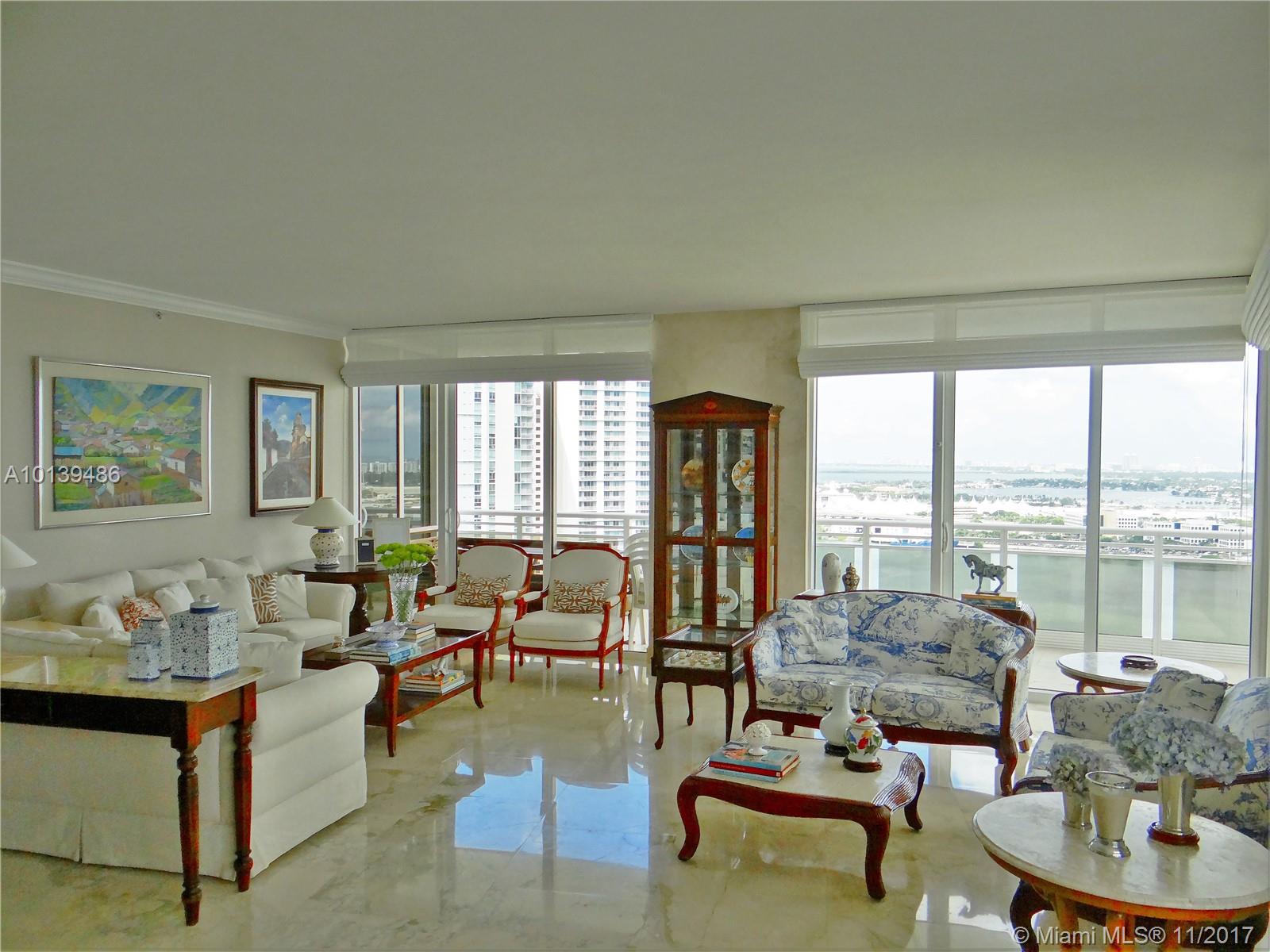 Motivated Seller. Apartment owned and lived by the same family since day one, never rented. Best line (08) at Carbonell Building. This house in the sky was converted from day one into 3 bedrooms and 3.5 bathrooms + office. Amazing water views from every single room; panoramic views of Biscayne Bay, Key Biscayne, Brickell and Miami skyline. Lots natural light. Marble floors throughout, top of the line stainless steel appliances, custom made built-in closets for additional space. Amazing layout. Five-star hotel amenities and services. 2 assigned parking spaces & 2 storage units.