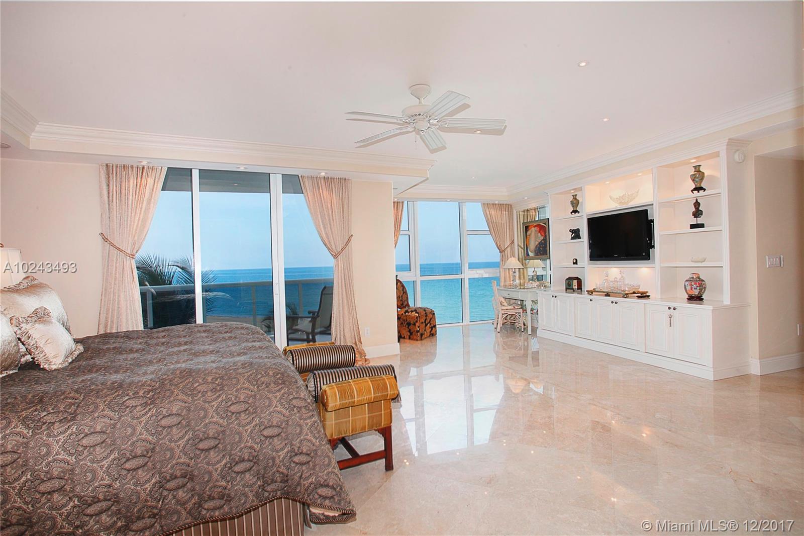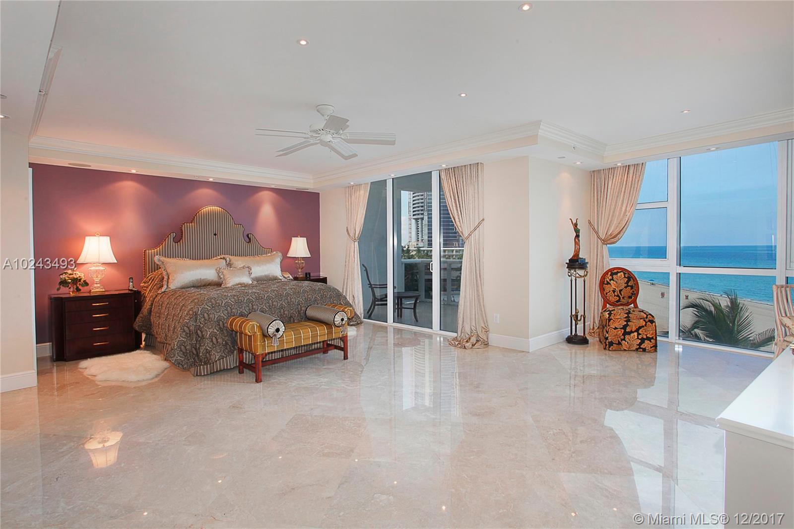 Neighbor to the Porsche Tower. Sweeping ocean views from every room! Priced to sell! For the purchaser who desires perfection! Out of this world and rare Trump Royale 4br/3.5bth (4045sq.ft) Direct oceanfront. This apartment truly captures the magnificence of the ocean and beauty of the beach from the front door and beyond. Polished marble floors, superior electric blinds throughout, built-ins, extensive decorator lighting and customized blue granite bar.