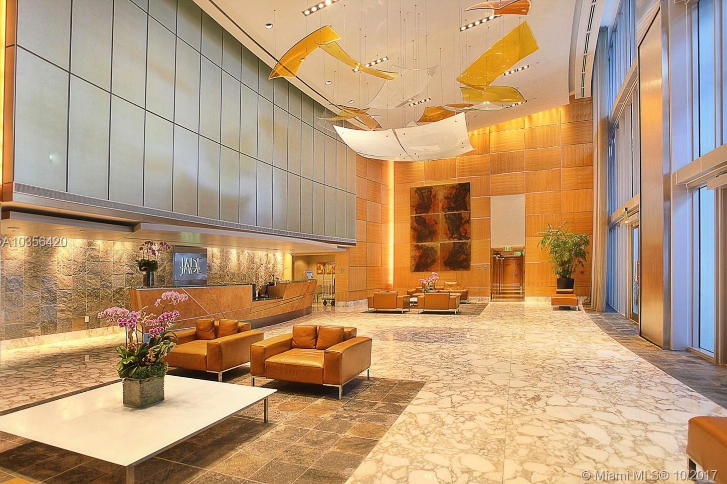 Spectacular views welcome you to this fabulous unit with marble floors. Fabulous gourmet kitchen with black granite counter tops, stainless steel appliances, wine cooler, espresso coffee maker, & plenty of storage.Large bedroom retreat with relaxing views to the open bay, two large walk-in California closets. whirlpool/Spa, double vanities, & separate shower area. Jade was designed for your comfort. You will enjoy State-of-the-art fitness center with views to the pool and bay, Infinity-edge pool with poolside cabanas and towel service, Spa with sauna and steam room, 24 hour concierge, Rooftop sky-lounge, library, media room and observation deck, business center with conference room, racquetball court, on-site restaurant and of course a fabulous location.