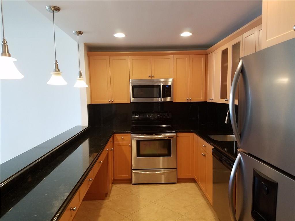 Elegantly Renovated. Central stack with Direct Ocean Views!!! Ceramic Flooring in kitchen, hallway, bathroom, and living room. Laminate flooring in bedroom. 4" baseboard throughout. Oversized bedroom. Reconfigured and enlarged walk-in closets. Smooth walls and ceiling. Stainless steel appliances, with beautiful black granite countertops in kitchen, and recessed lighting. Mosaic tile shower wall, bathtub recently reglazed. Unit just painted with warm beige tones. Cozy and Inviting, feels like home!!!