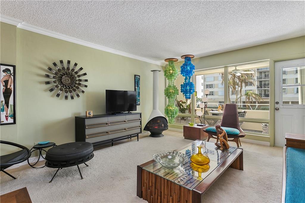 Midcentury perfection is yours in this 1 BR co-op in funky Crane Crest Apartments right on the beach. Gorgeous unit nicely updated w/ Pergo floors, bright white kitchen w/ distinctive Black Mosaic Gold Granite countertops, tastefully modern bath, & deep, comfortable balcony overlooking the ocean. Extra Large storage room & laundry steps from unit. Oceanside pool w/ shaded bbq area, direct beach access. HOA includes cable TV. Complete concrete restoration recently completed. 50% financing available.