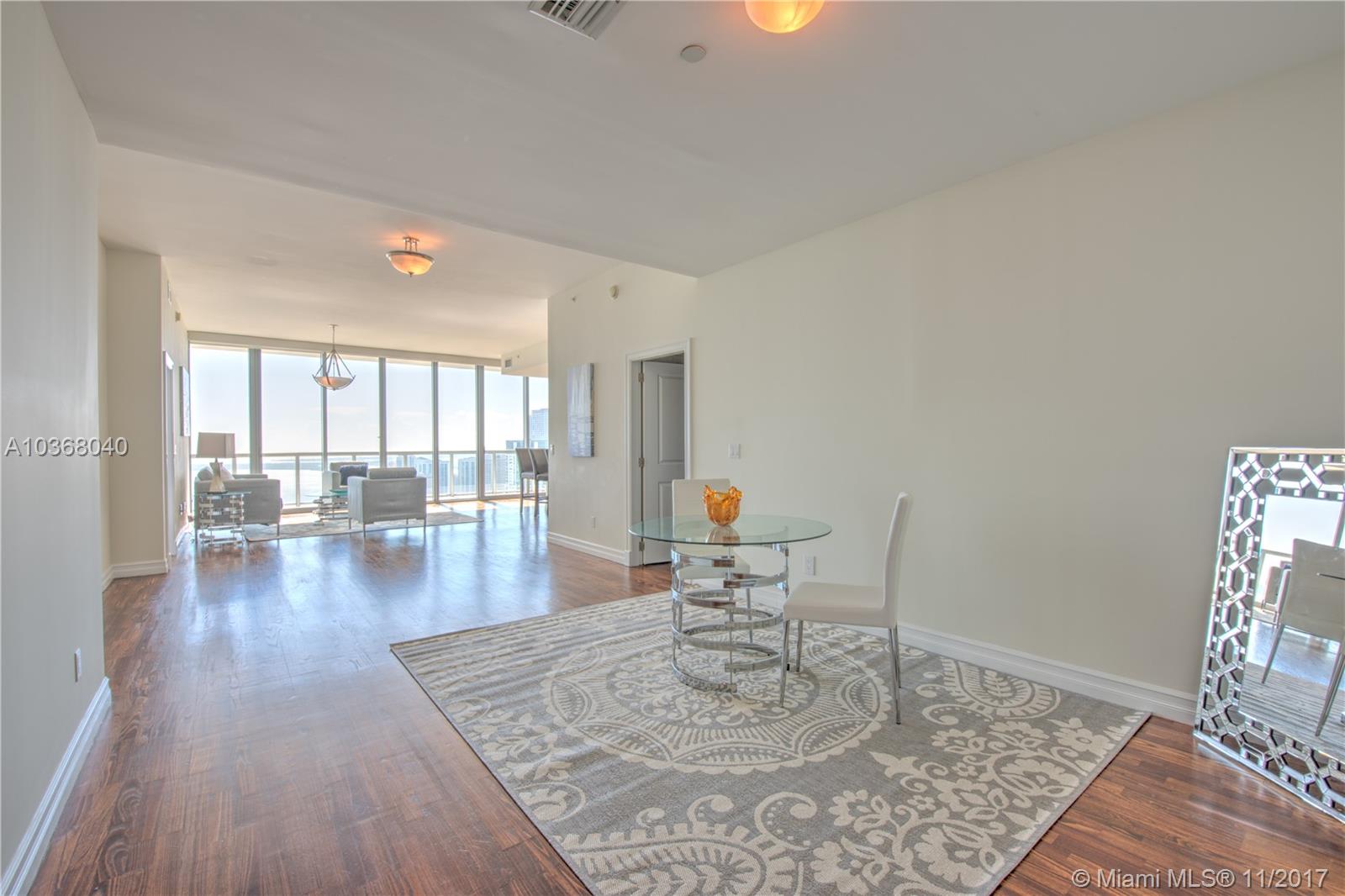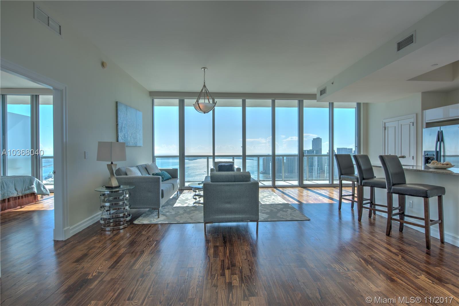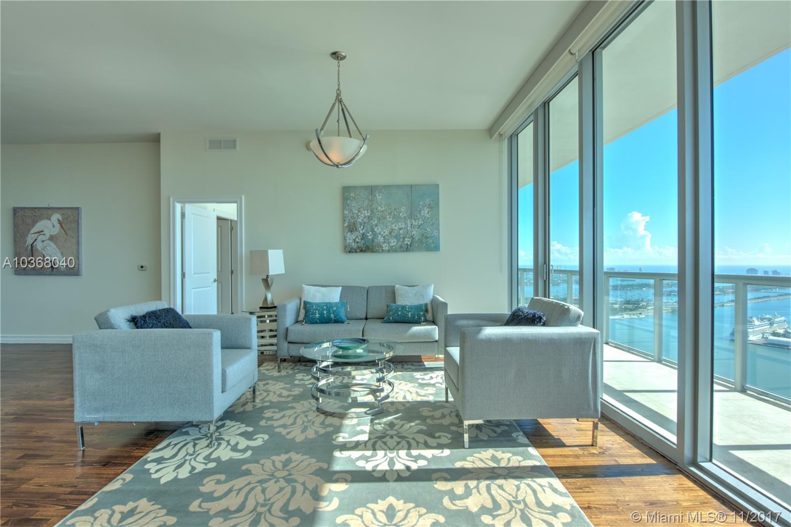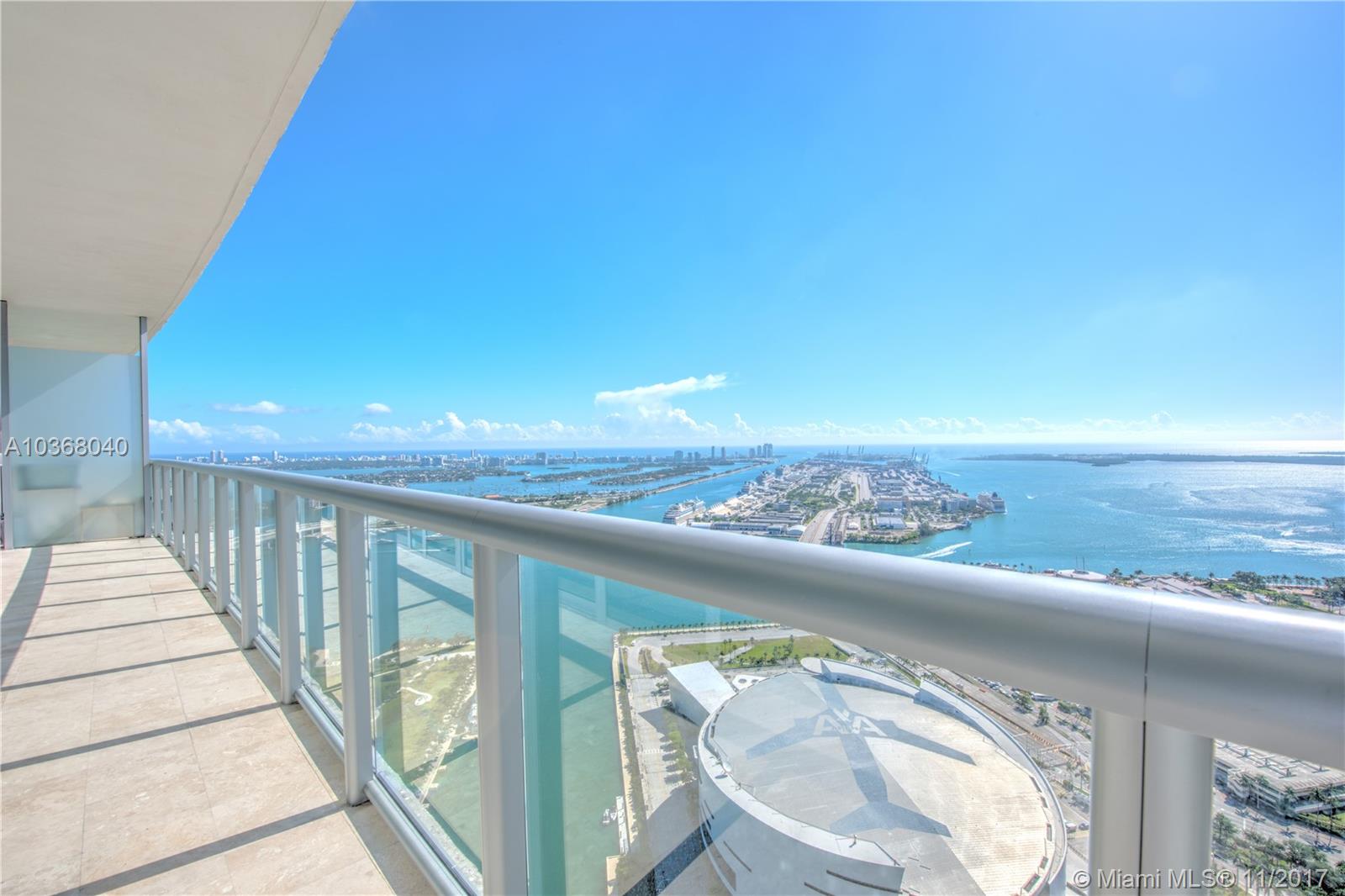 Own one of the Best Views in Miami!!! An incredibly spacious 2 Bed + Den/ 2.5 Bath condo at Marinablue with 1,748 interior square feet, 10-foot high ceilings with floor-to-ceiling windows, 223 square foot balcony spanning the entire width of the unit, stainless steel appliances, wood floors in the living areas, marble floors in the bathrooms, washer/dryer, and breathtaking views of the bay, city, and ocean from the 54th floor. Walk-in closet in both bedrooms. The largest non-penthouse unit in entire building. One-of-a-kind floor plan! Includes 1 assigned parking space located on 4th floor + storage cage. Building amenities include: sunrise & sunset pools, hot tub, fitness center, business center, sand volleyball court, BBQ, 24-hr concierge, 24-hr valet parking, bike storage, and club room.