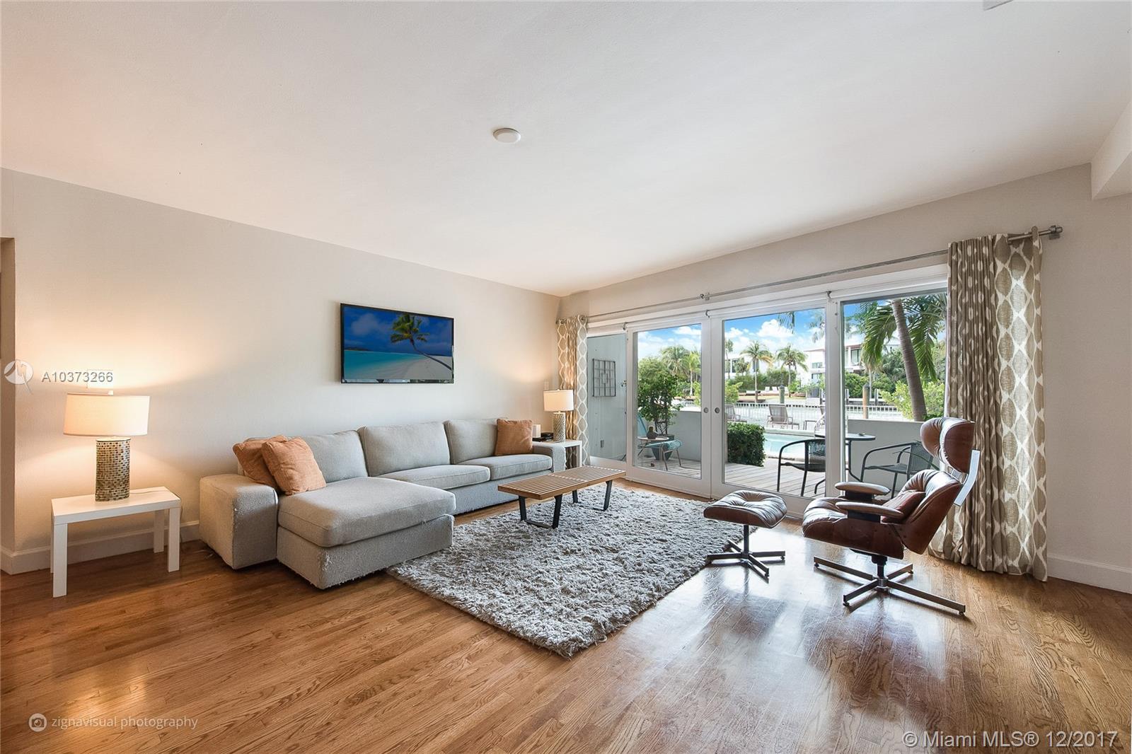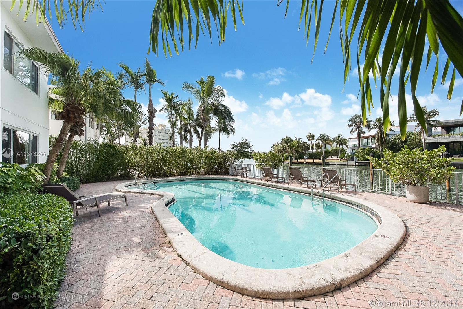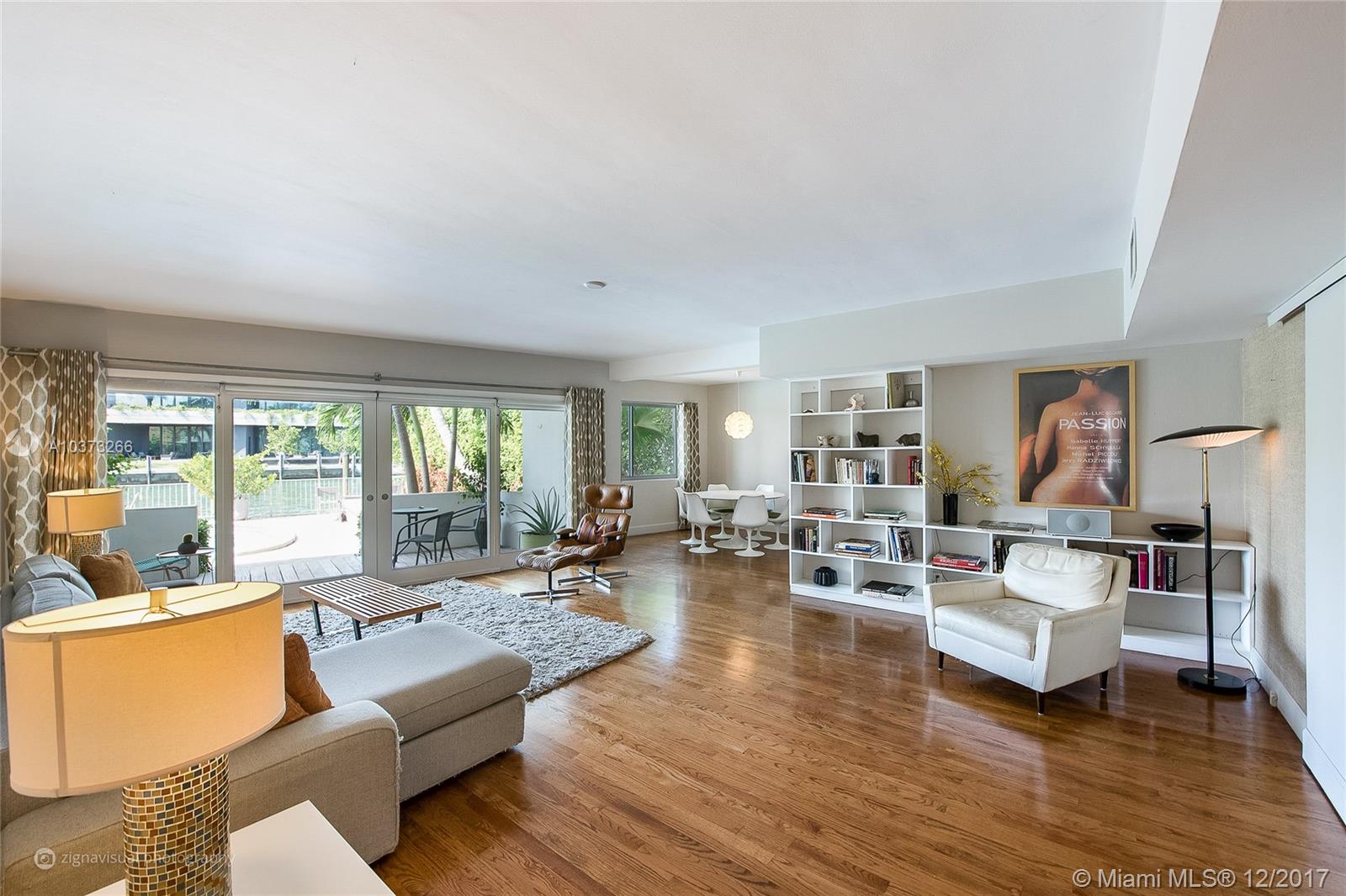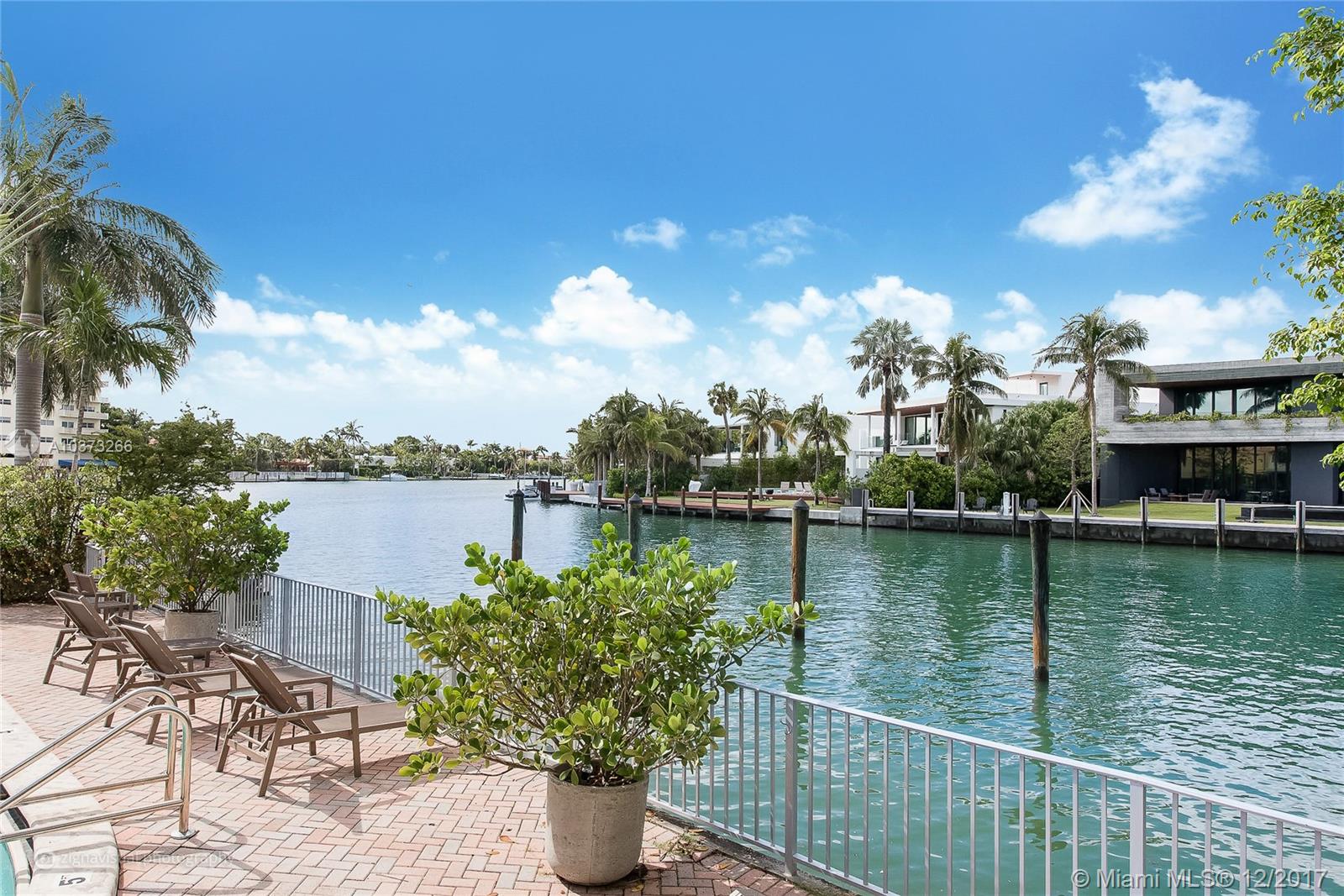 Gorgeous waterfront oasis with the look and feel of a single family home. Enjoy peace and tranquility from your waterfront home. Small 10 unit MiMo building dripping in charm located on one of the most prestigious addresses on Miami Beach. This apartment has it all, hardwood floors throughout, large master overlooking the water with loads of closet space. Windows on three sides, walk out your backdoor to your own patio straight onto the pool deck with views of multimillion homes across the wide canal. Access to the saltwater canal and bay for water sports or just sit by the water and watch the sunset.