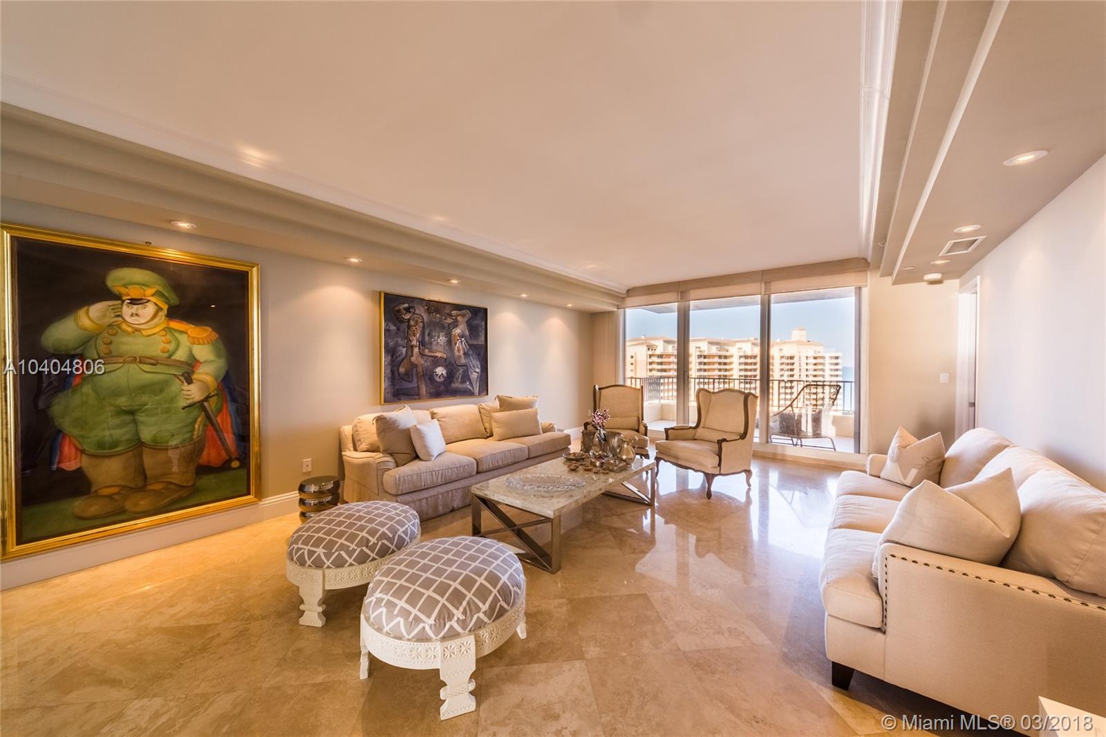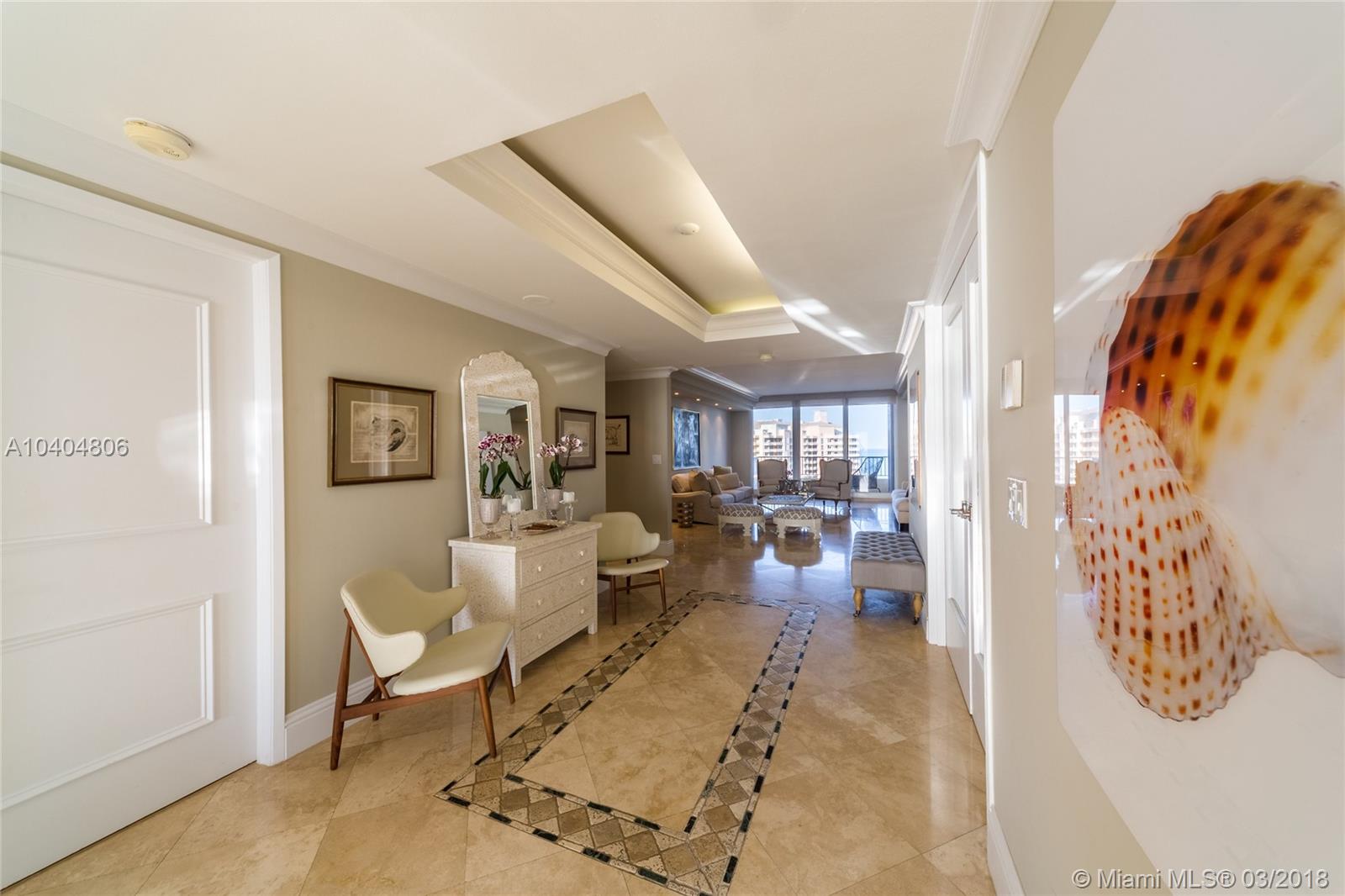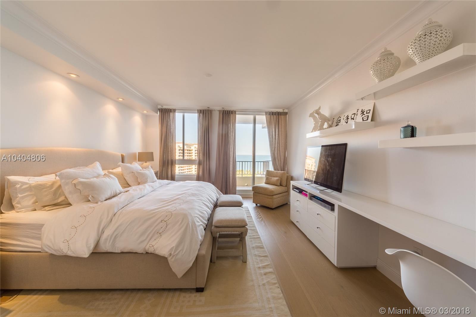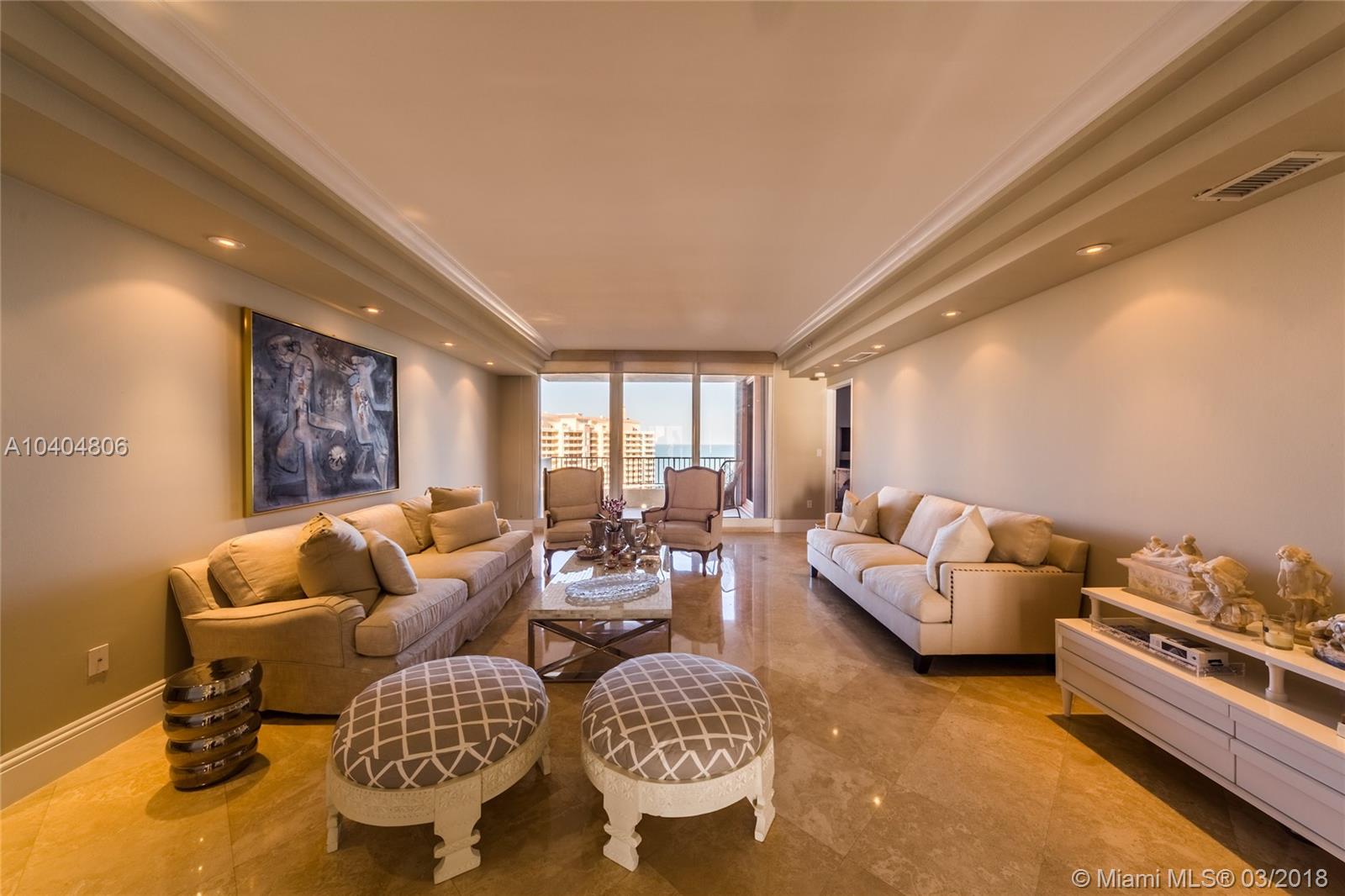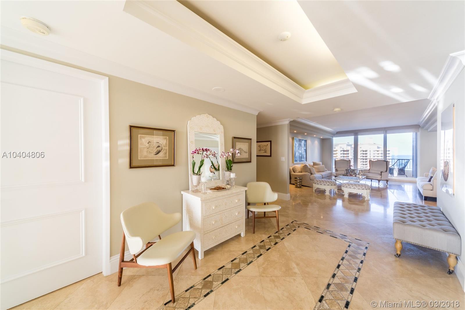 Gorgeous 3 bedroom plus maid quarters, 4.5 baths home with the most spectacular ocean, bay and skyline views everywhere, private elevator direct to flow through unit with forever beautiful sunrises and sunsets. Ample terraces to enjoy the views of the ocean, beach, bay, city and gardens. Kitchen with top Subzero and Miele appliances. Prime beachfront building located steps from the sand. World class amenities, resort style living that include Valet/Concierge, security, several pools, spa, tennis center, gym, restaurant, library, wine cellar, playground, exclusive beach & pool service and much more. Close to the KB shops, restaurants, golf, and the gorgeous beach!