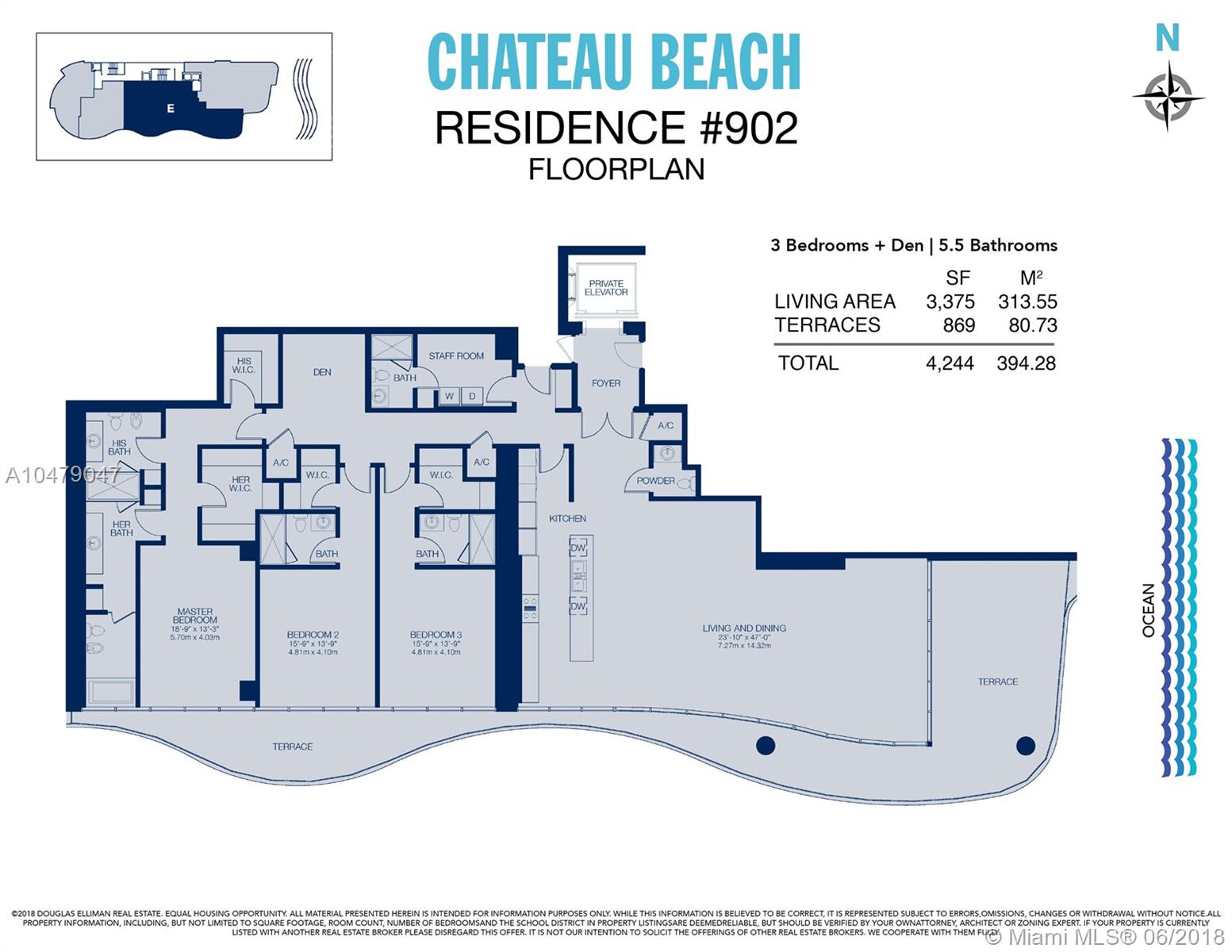 Beachfront perfection at Chateau Beach. Direct ocean southeast corner 3 BD + den / 5.5 BA designer appointed for comfort and elegance. 3,375 square feet of space plus extravagant balconies. Chateau Beach is a boutique condominium with only 84 residences, concierge, private elevator access, theater, cigar and wine lounges, kids club, oceanfront gym, spa and pool and much more.