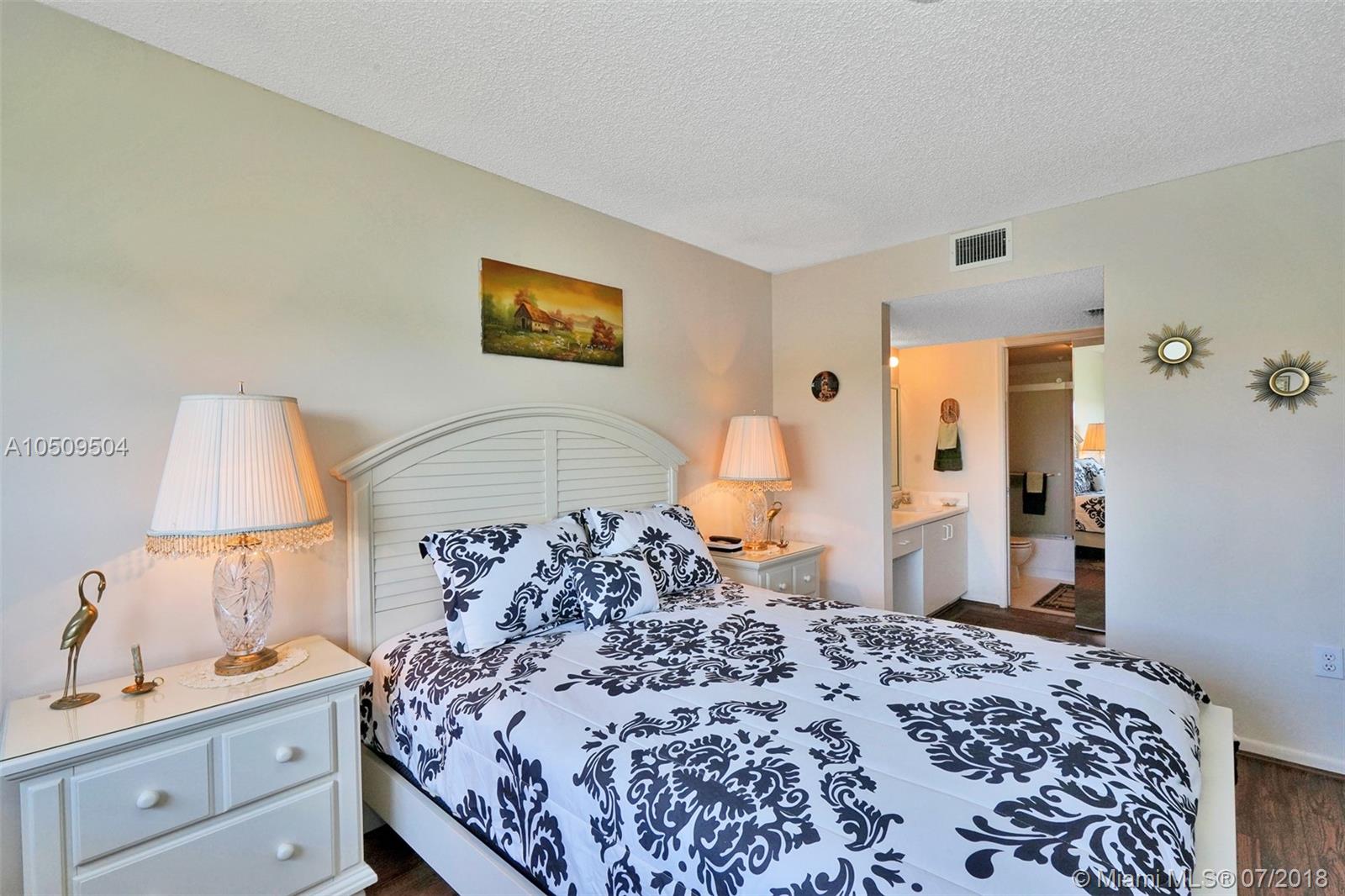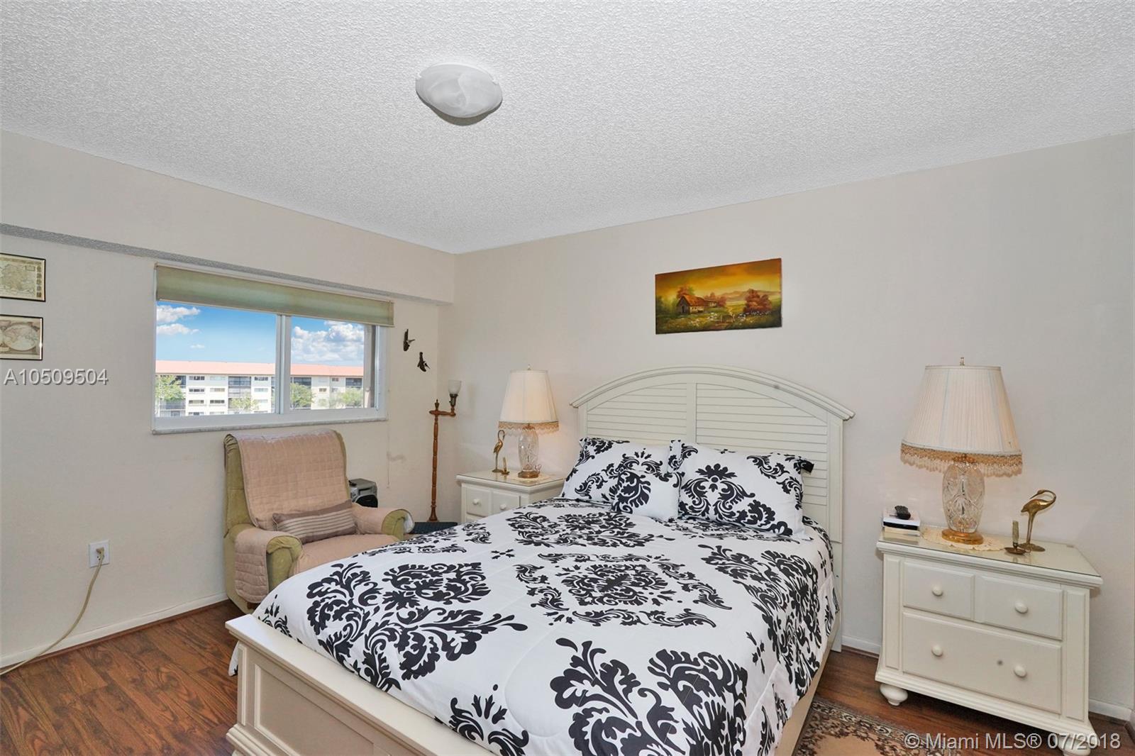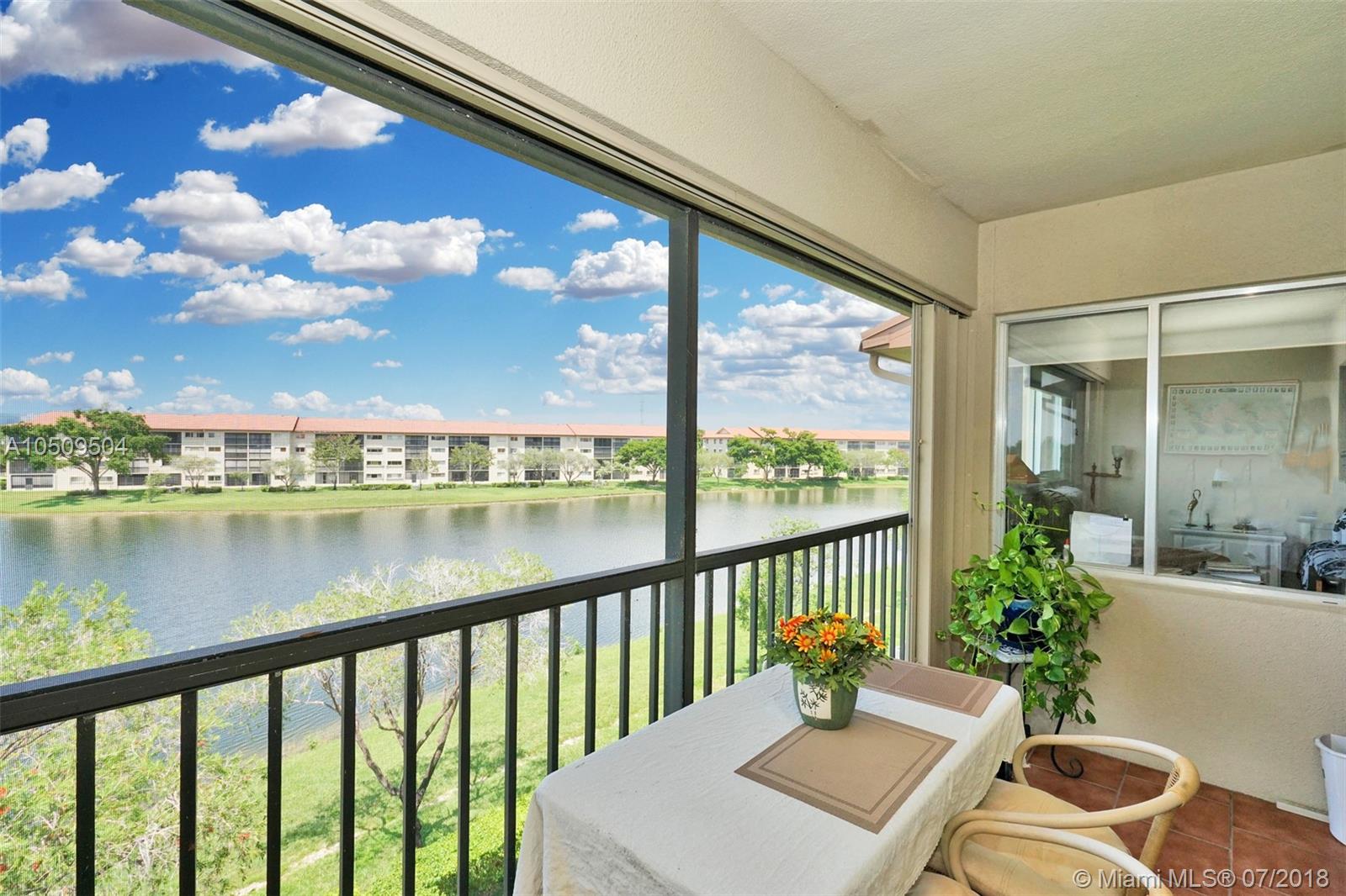 Wow! Don't miss the chance. To live in this 2 bedrooms 1.5 bathroom 4th floor condo. With a western exposure from the patio that has an unobstructed view of the lake and water fountain. The building is located in a Cul De Sac. This unit is extremely well kept and maintained in pristine condition. Laminate wood floors throughout the condo. Stack-able washer and dryer. Added cabinetry in the kitchen. Built in ladder with access to the attic in the master bedroom closet. New ownership must wait 2 years before renting. This condo is in the most exclusive 55 plus community in Pembroke Pines. Resort style living with a million dollar clubhouse, movies,fitness center,transportation,free golf,pharmacy,cafe,24 hour security patrol and more.