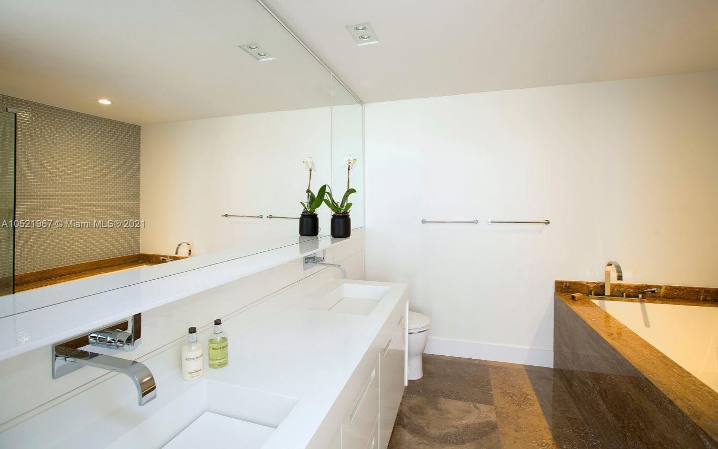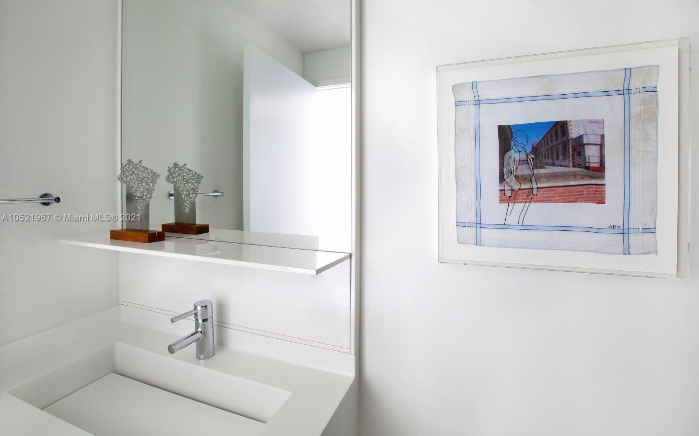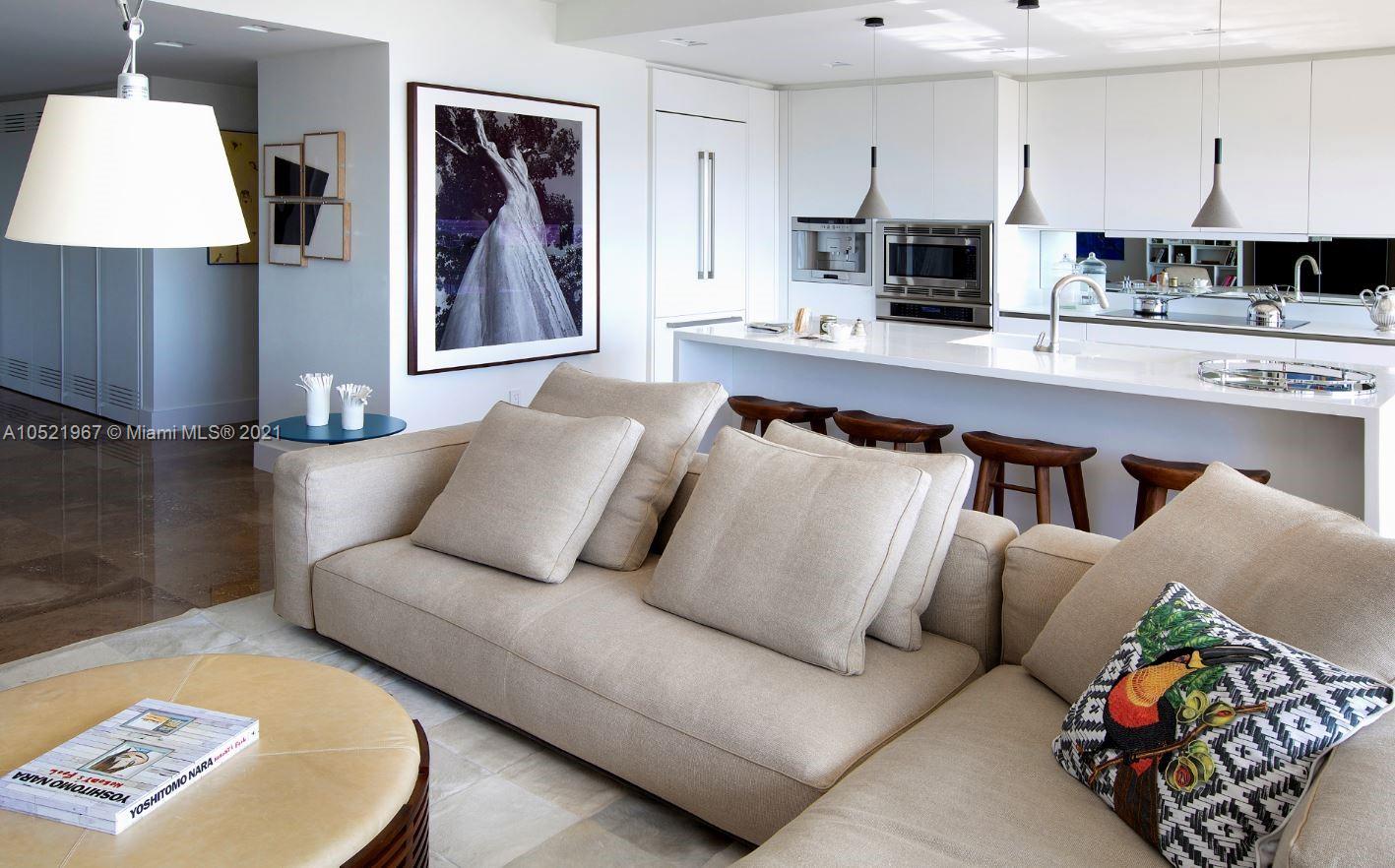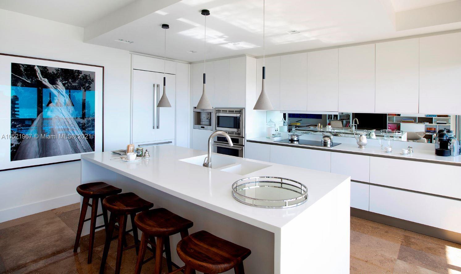 Designed by Cristina Mascarenhas of In Plus New York, this magnificent two-story penthouse sky home features a custom Kitchen, custom bathrooms, wardrobes, doors and built-in's, each provided by ORNARE. Other features include, custom ceiling and lighting work, automated shades throughout and many other fine details. Beautiful southern exposure providing ample natural sunlight with clear views of the ocean and sweeping bay and golf course vistas back-lit by the downtown Miami skyline. A