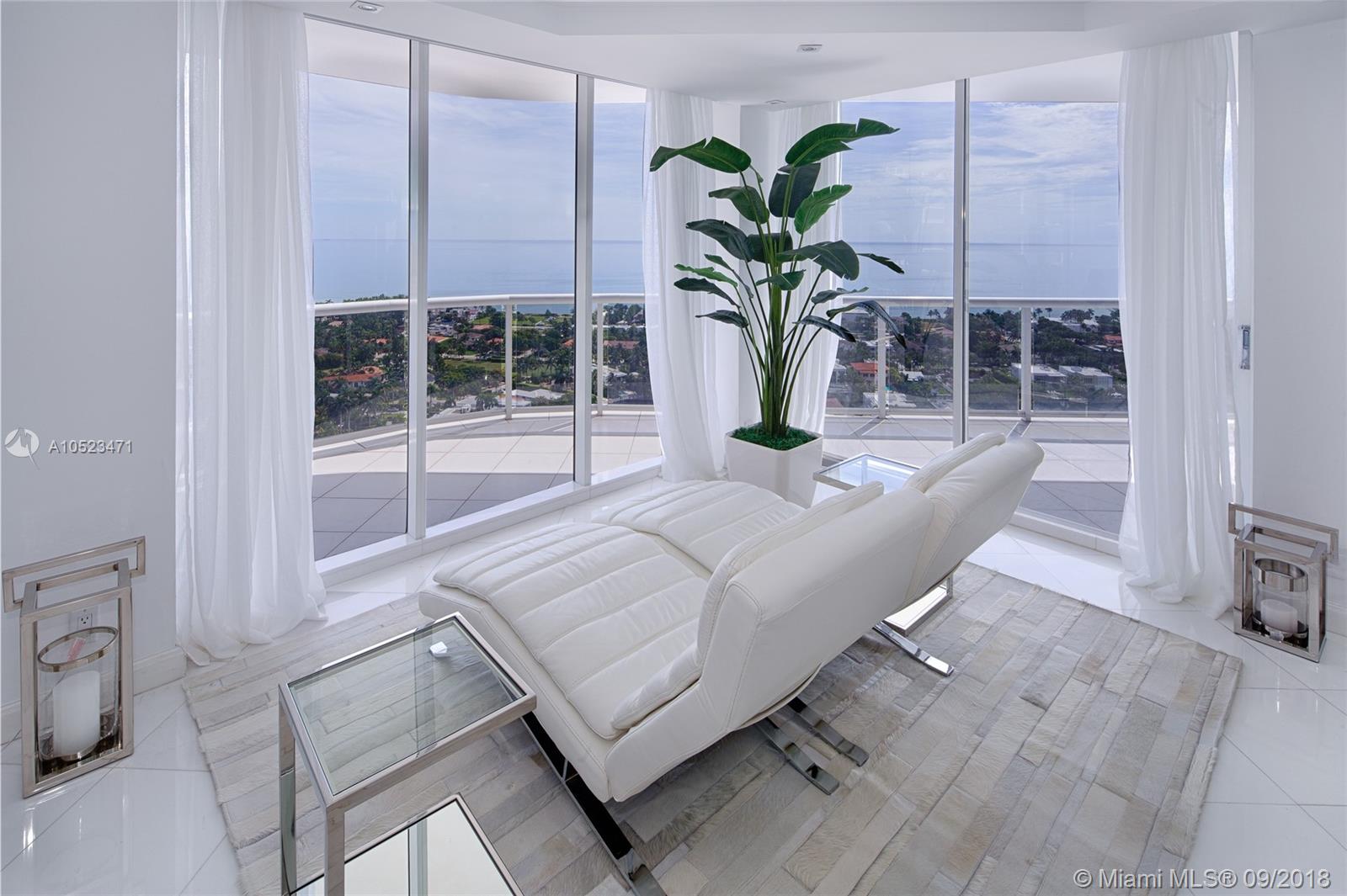 Highly sought after two bedroom PLUS DEN (which may be closed for third bedroom)Biscayne Model apartment. Floor plan attached. Interior features include private elevator entry along with spectacular views of the ocean, intracoastal and Golden Beach from every room. Offered fully furnished turn key if desired-negotiable. Contemporary furnishings from Artefacto along with beautiful white marble floors, motorized shades and drapery, LED lights, new plumbing fixtures, new carpeting in bedrooms, closet interiors, and new A/C. Additional walk in closet in master bathroom. Easy to show and sell!