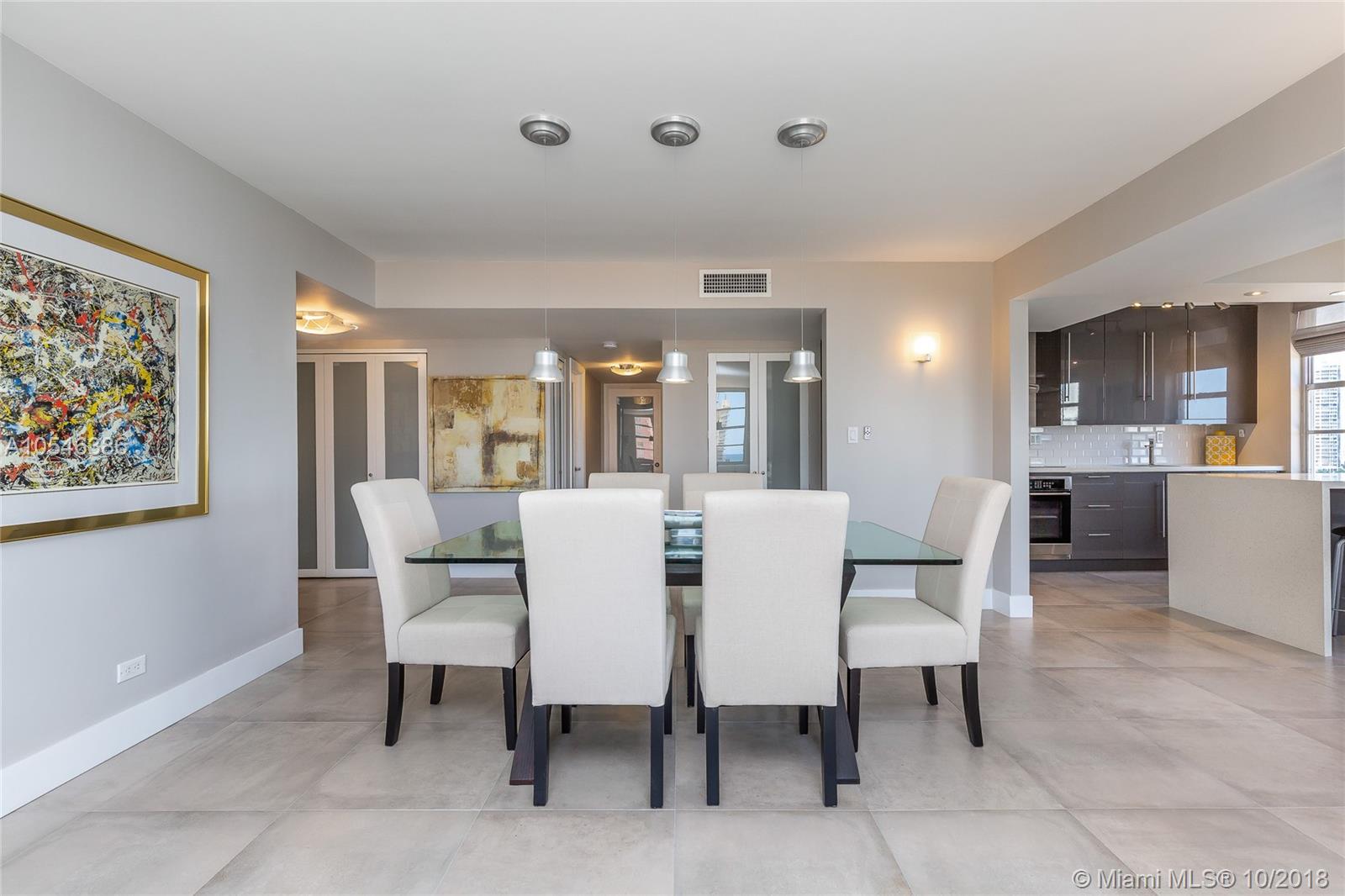 Newly renovated gorgeous corner unit with magnificent intracoastal and city views. Custom closets, european state of the art kitchen with quartz countertops, stainless steel appliances, flat glass cooktop, LED light, recessed lighting, porcelain tile floors throughout. Dual vanity in both bathrooms. Entire unit designed by Detailed Designs Interiors LLC. Every square inch of this unit has been remodeled. It is a must see! Sunny Isles Beach (Florida's Riviera) has an A+ school district. You can also walk to several parks and houses of worship. Minutes walk to beach and international shops, and 5 star restaurants.