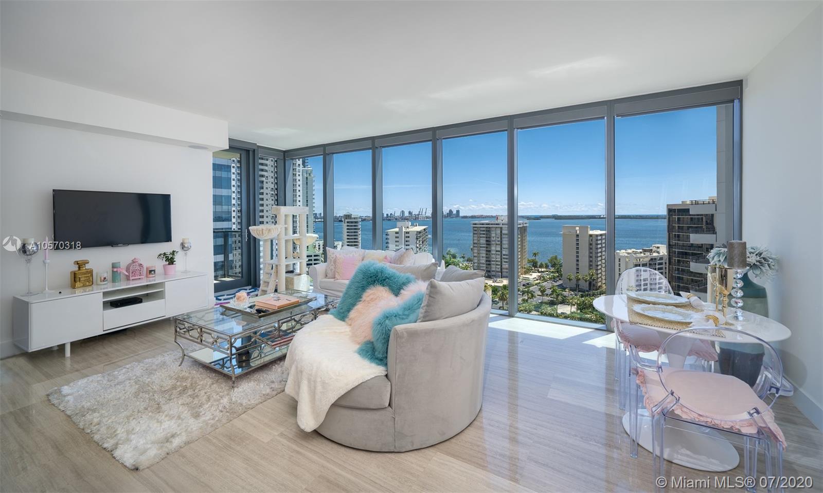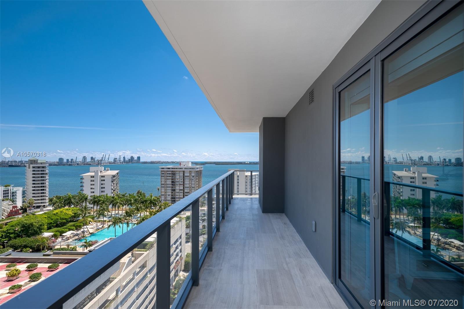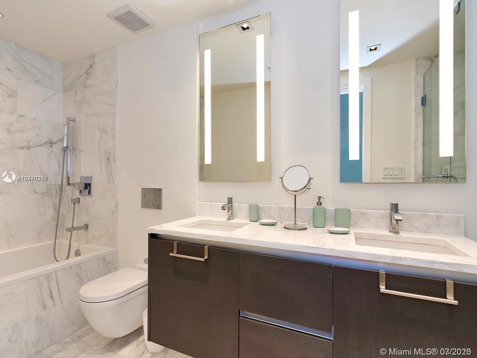 Freshly developed 2BR/2.5BA corner unit w/spectacular water and city views. Flow thru marble flooring, custom closet in master bedroom, and expansive terraces with summer kitchen. SMART IHOME system (integrated audio speakers & video / lighting system) and Bluetooth/fob controlled front door (no keys required). Eco-friendly kitchen with Italian glass cabinetry, marble countertops and top-of the line appliances. Infinity-edge pool w/resort-style poolside food & beverage services, gym and spa deck w/ panoramic views of Biscayne Bay and Downtown Miami. 24/7 concierge, valet, pet walker, complementary bikes, nanny service and much more.