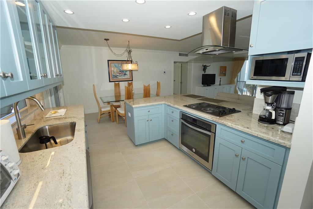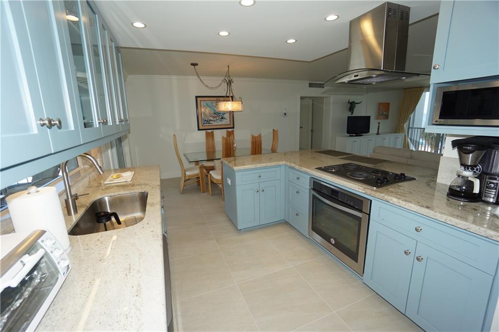 Substantially renovated Unit with light colored porcelain tile in the living room, and Dining area. Impact windows have been installed throughout. Balcony has been added to living area giving over 1400 SQ/FT approx. of total space under air, and 24 foot of floor to ceiling Impact sliders cover the whole East wall of the living area, looking over the ocean. Kitchen area has been opened to living area making a large airy and bright living area. New cabinets, tops, appliances have been carefully selected to give a beach ambiance like no other. Also a large circular balcony is just on the West side of your dining area for those lovely cool winter evenings. Sold turnkey.