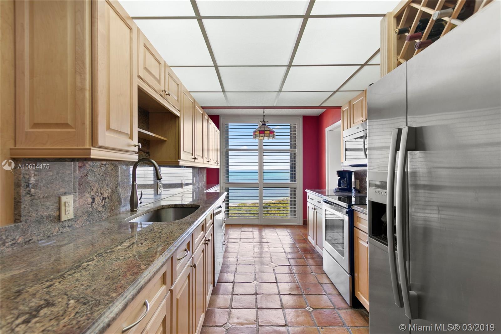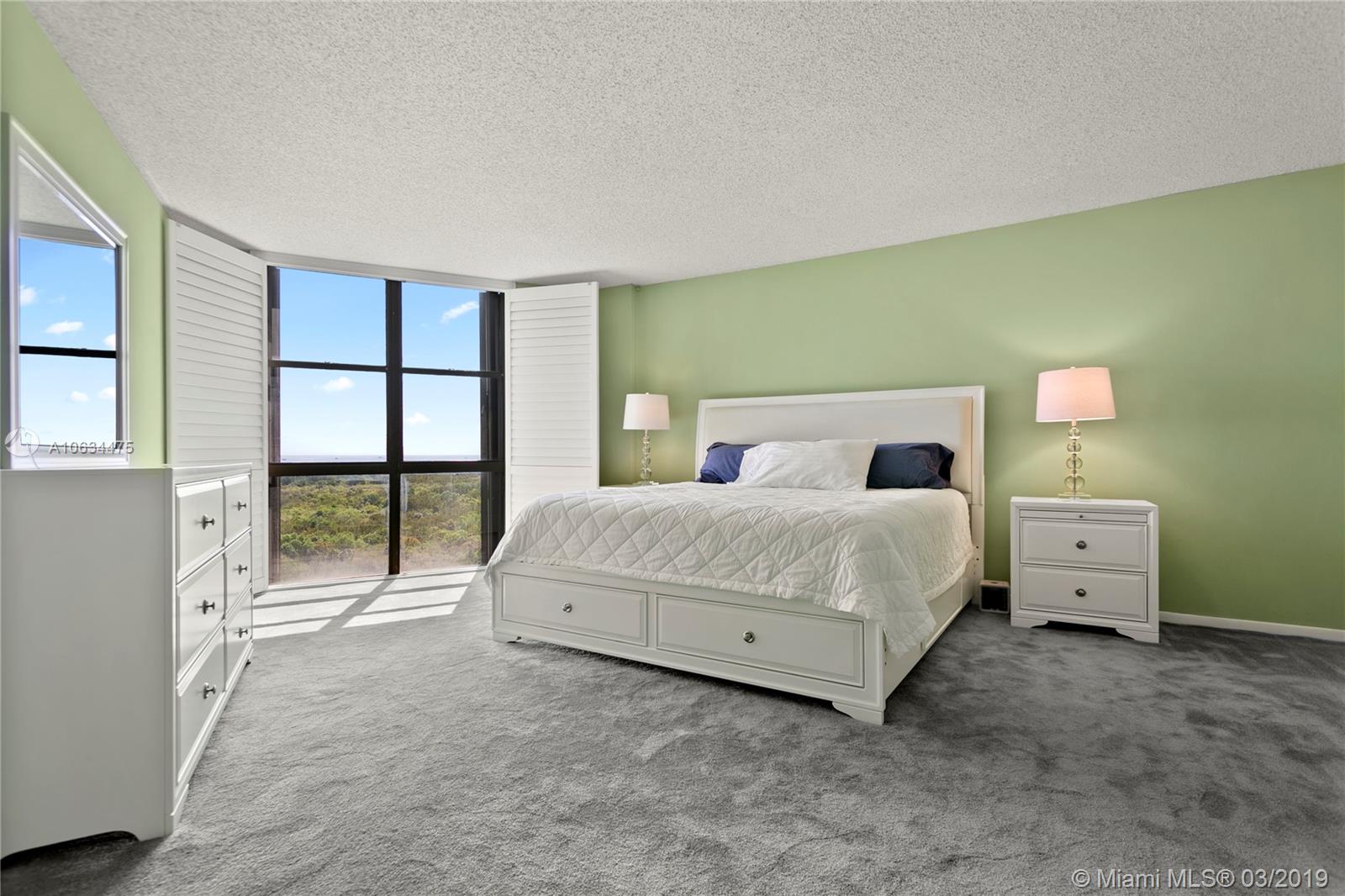 Private corner unit in exclusive location. Southeast exposure with abundance of natural light and unobstructed panoramic views of the ocean and bay. Enjoy breathtaking sunrises and sunsets from anywhere within the apartment. Renovated kitchen with stainless steel appliances. Tile throughout and carpet in the bedrooms. Premium parking space. Easy access to all facility amenities. Available to show at your convenience .