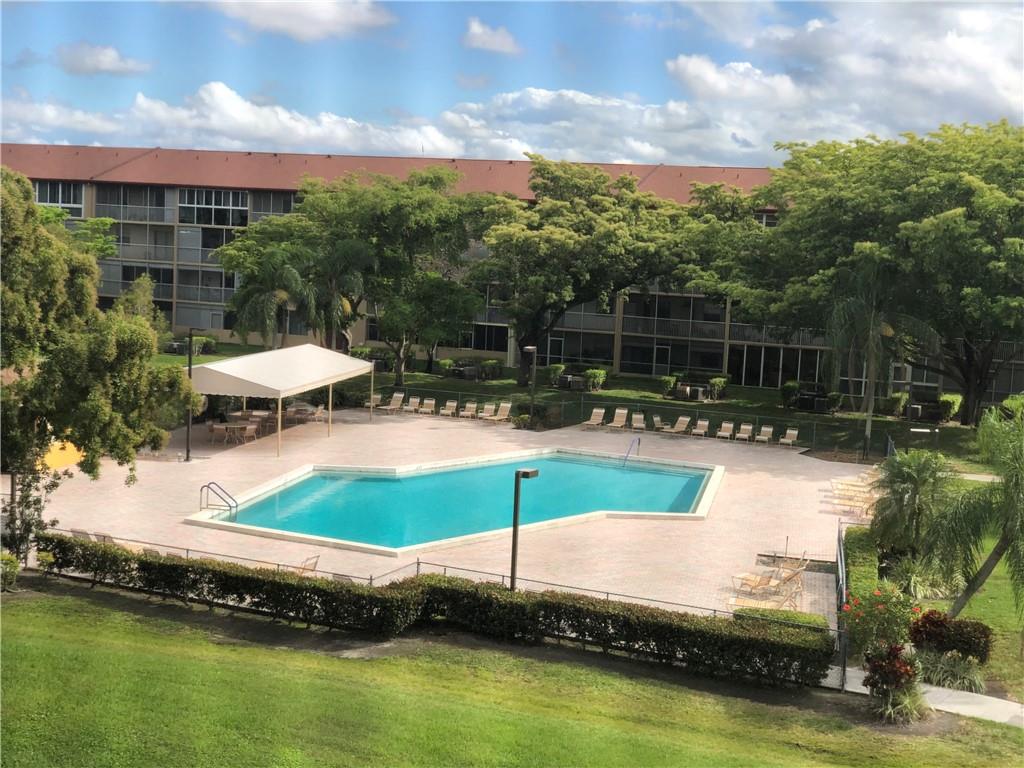 Spacious 1 bedroom 1 bath "C Special Model" with a gorgeous and relaxing view of the pool from the large, screened, balcony. This unit features tile floors, good size kitchen with lots of cabinets and pantry. Conveniently closed to the elevator and the laundry room. Century Village is a very popular 55+ community that offers: Transportation, amenities, pools, tennis, clubhouse, golf, security, etc. Total association fees: $425/month, water, insurance, cable, included. Home owner must own the property a minimum of 2 years before renting .