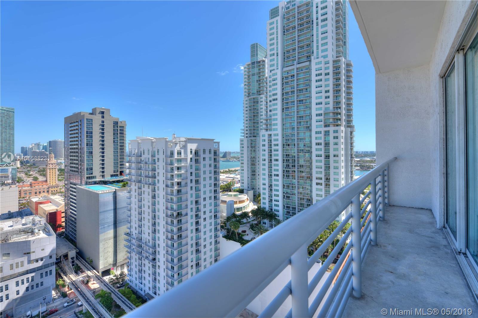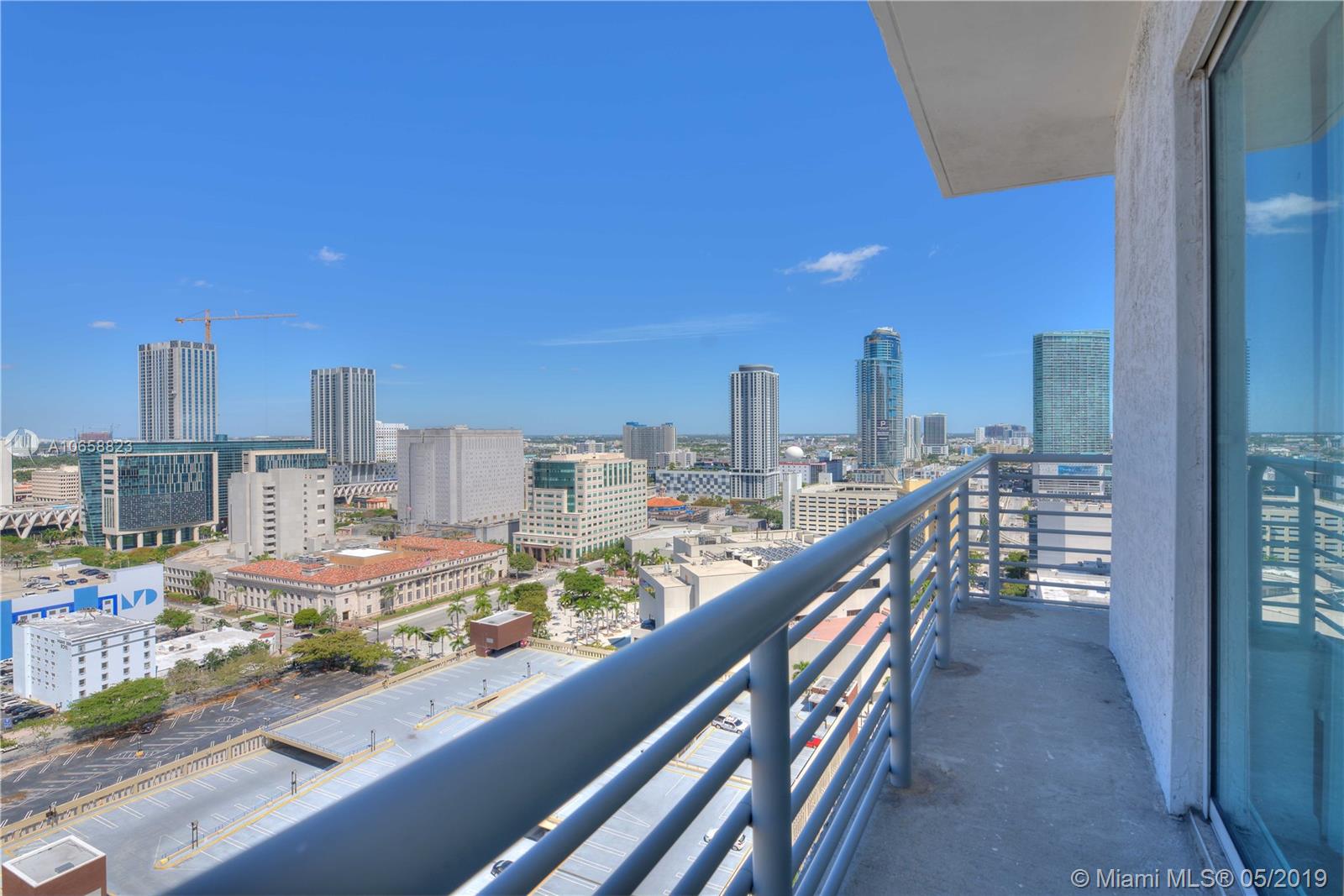 Corner, high floor, 10ft high ceilings, spacious 2 bed, 2 full bath with beautiful NW views. Home features bright white Italian kitchen cabinets, SS appliances, modern fixtures, roman bath, NEW washer/dryer, NEW A/C and split bedroom floorplan (both bedrooms enclosed). Floor to ceiling windows give tons of light! All windows are impact resistant, energy efficient, and sound reducing. Building amenities include rooftop pool, sauna, public WiFi, full gym, large community room with pool table, 24-hour security, and management on site. Maintenance fee includes water, basic cable, and internet. Located steps away from metro (attached to building), Bayside Market, Airlines Arena and Miami Dade College, shopping, dining, nightlife, and more. Pet friendly, well kept...true Downtown living!
