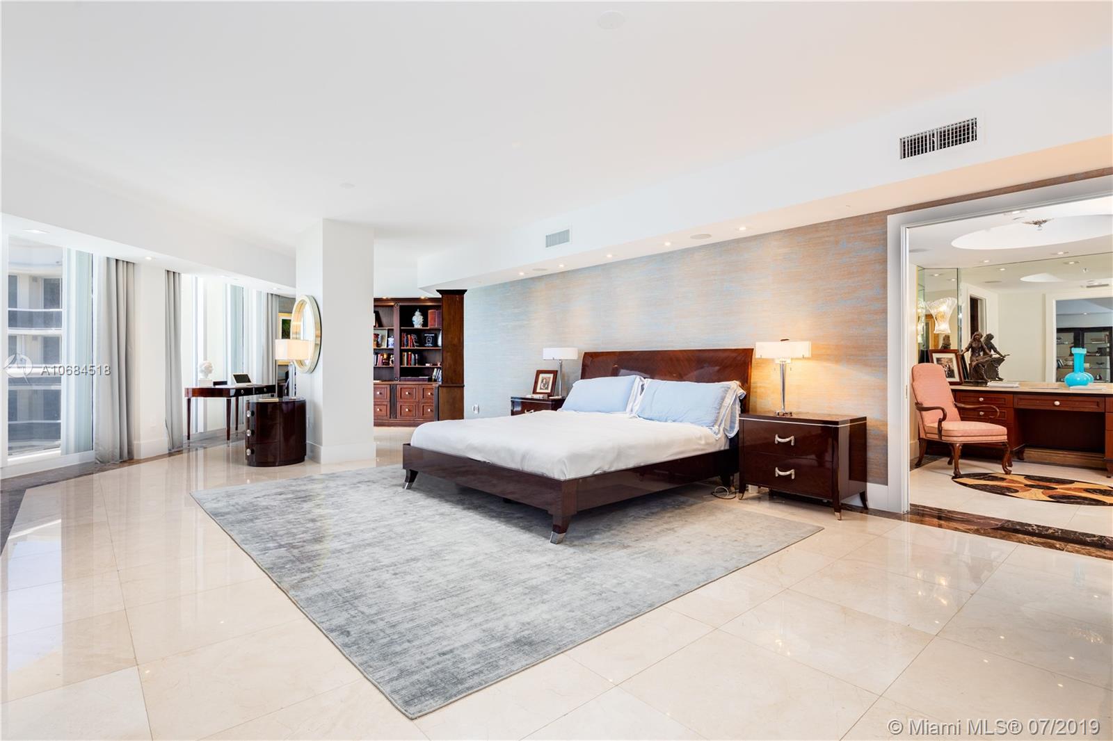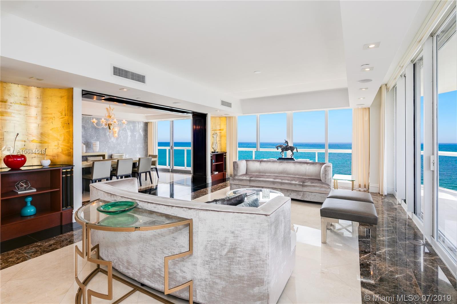 One-of-a-kind unit at the luxury Solimar in Surfside. Owner combined 3 units from the developer and into one for a spacious 6 bedroom, 5 bathroom, 2 half bath, and 6,230 sf unit. Take private elevator to foyer entrance and immediately be greeted by panoramic ocean views with flow-through layout. Unit offers large living room, dining room, family room, library, private office, balconies, maid's quarter, bar & entertainment area, and master suite with large walk-in closet. Building has 5 star amenities including 24 hour security, valet, pool + beach service, gym and unit includes 220 sf cabana. Great location across from the Bal Harbour Shops and adjacent to the shops of Harding Ave.