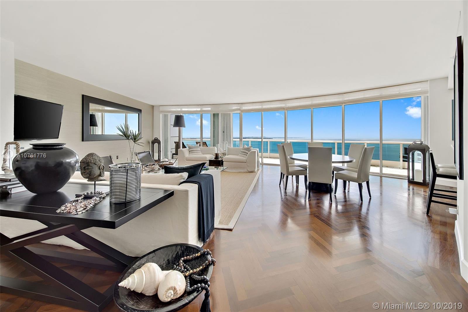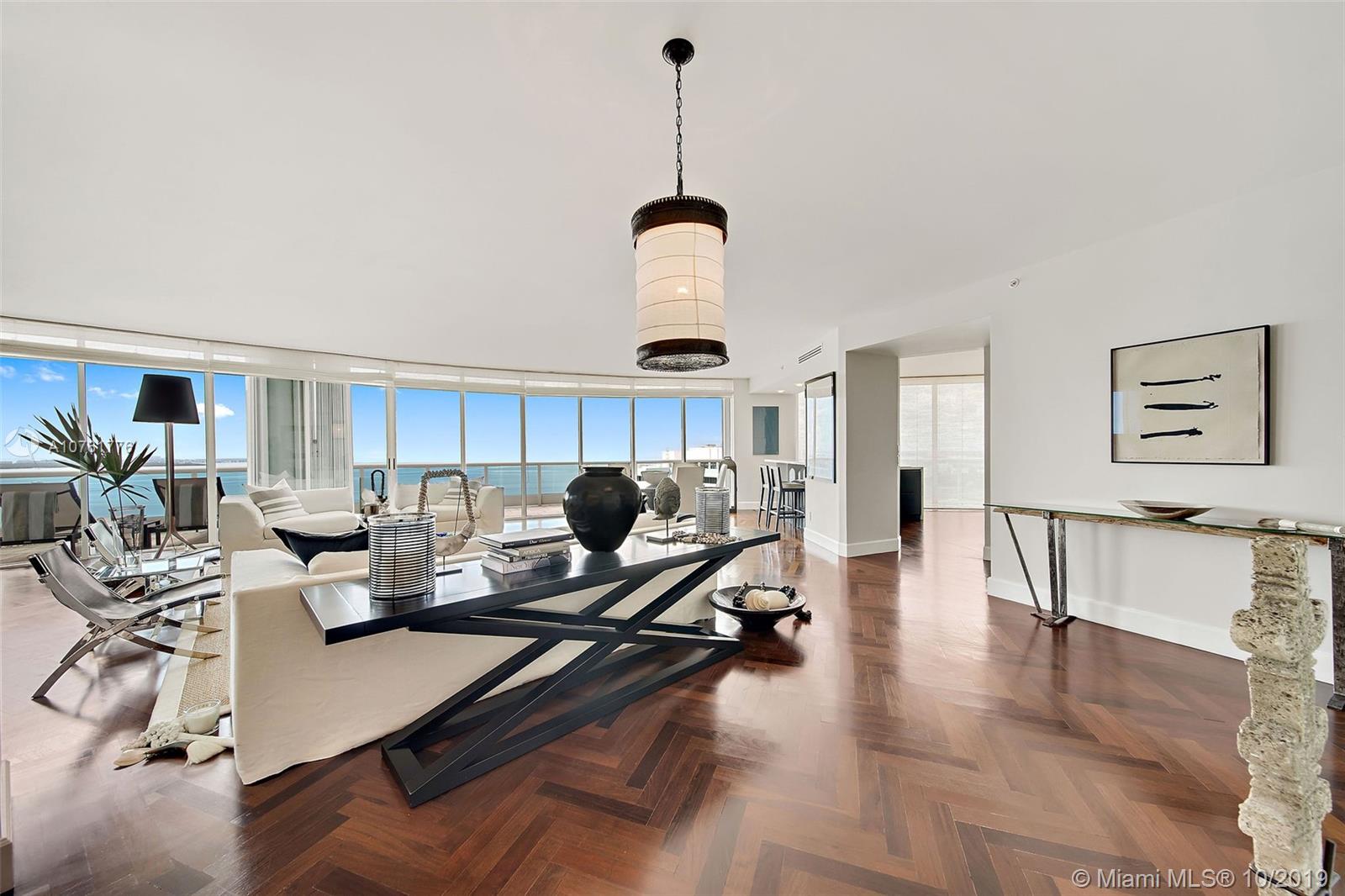 Stunningly upgraded residence features a kitchen that has been opened to the oversized family and dining rooms. Incredible views of glistening Biscayne Bay greet you in your private elevator foyer. Rich elements such as mahogany herringbone-patterned floors blend beautifully with contemporary finishes such as Mia Cucina Italian lacquered cabinetry, stainless steel appliances and Neolith Italian porcelain countertops in the kitchen. All rooms offer water views and have access to a giant wrap-around balcony. Masterfully designed furniture is available for an additional price for a completely turnkey opportunity. Three parking spaces in a covered secured garage and a storage unit convey with the property.