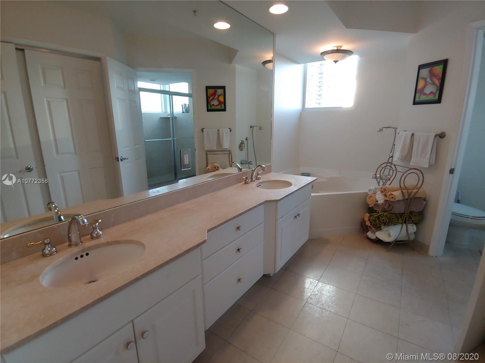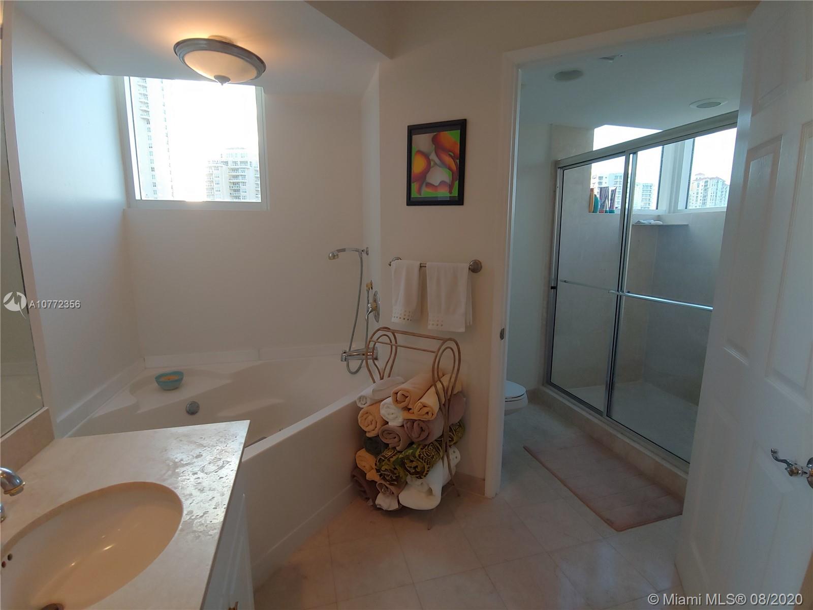 Enjoy the spectacular water views from this spacious 2 bed/2.5 bath unit. Features 1870 sq ft with tiled floors, renovated kitchen with top of the line appliances, large living room, easily converted to an additional bedroom, office or den, private storage room, ac unit located outside the unit, 2 parking spaces included with unit! Enjoy the 5-star amenities of a private resort on 24hr guard gated acres surrounded from 2 sides by the water, 2 story spa & health club, private marina, 4 tennis courts & 2 pools. Fantastic location, 5 minutes from the beach, walking distance to Aventura Mall and Founders Park, minutes to Gulfstream casinos and major highways