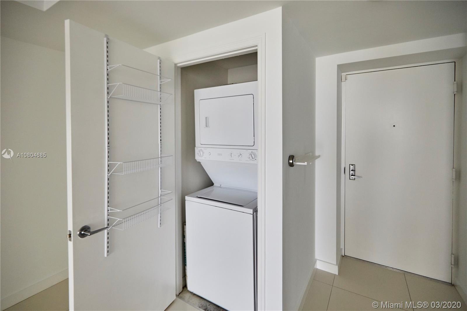 Largest one-bedroom plus den floor plan in the building. Western facing with beautiful unobstructed views of the Miami River and sunsets. Walk-in closet in master. Tiled step-in shower, jetted tub, and dual sinks in large bathroom. Unit upgrades: 5-stage osmosis water filtration system, Nest thermostat, motorized shades in living/bedroom, tiled balcony, upgraded lighting, ceiling fans in living/dining and bedroom, 18x18 white porcelain flooring tile throughout living spaces, tile back-splash behind cook-top, dimmer switches added in dining/kitchen/entry/living/bedroom, NEW dishwasher. The best upgrade is the addition of custom cabinetry and bar height counter-top which expands the kitchen into an eat-at breakfast bar. Unit includes one parking located on level 4 of the 10 story garage.