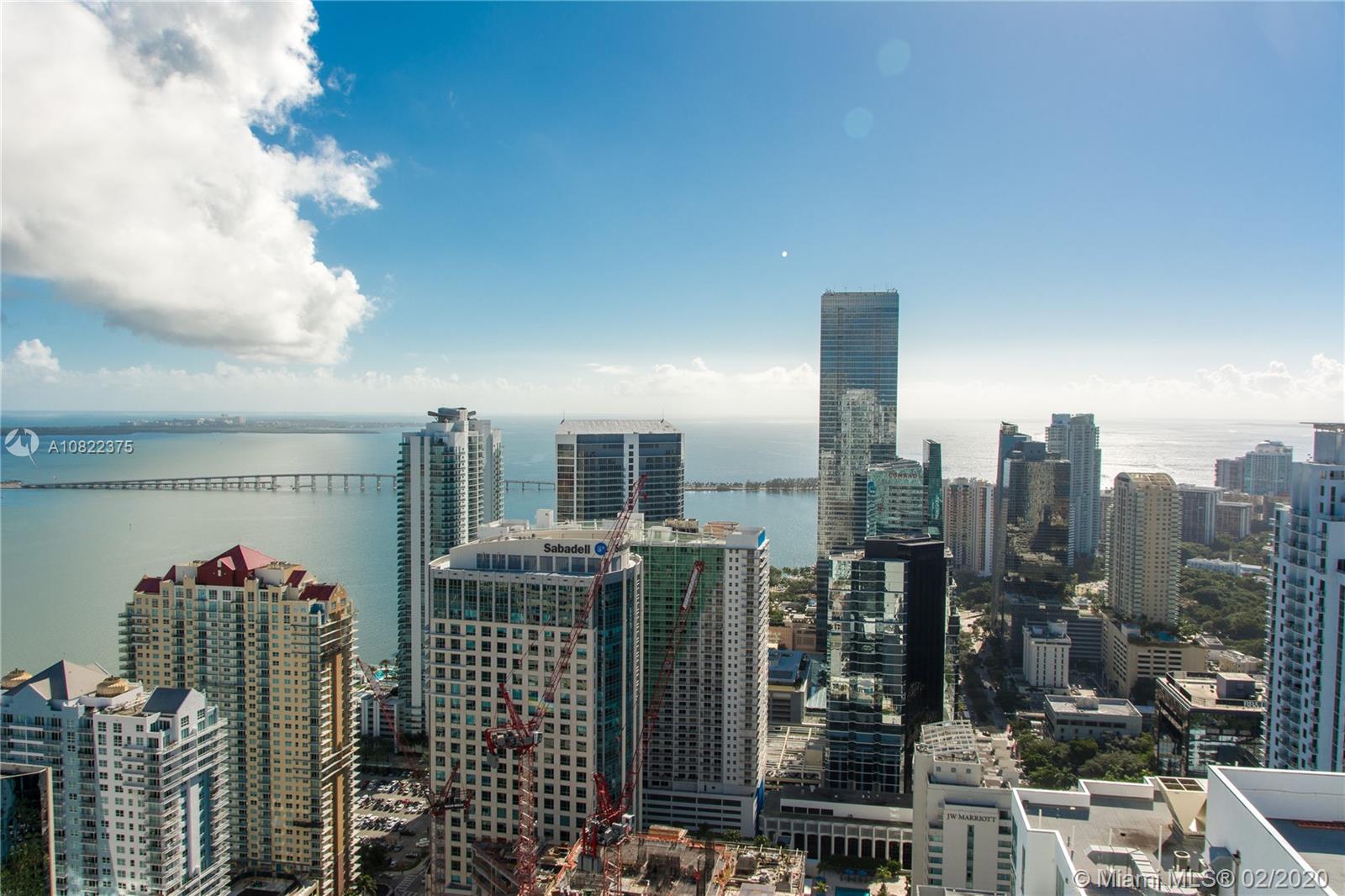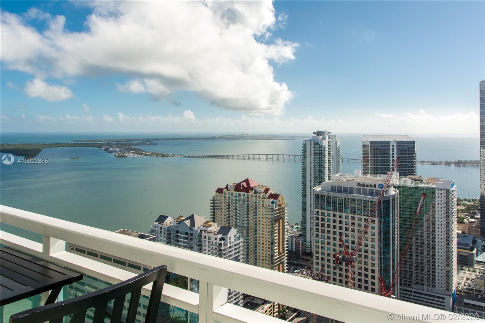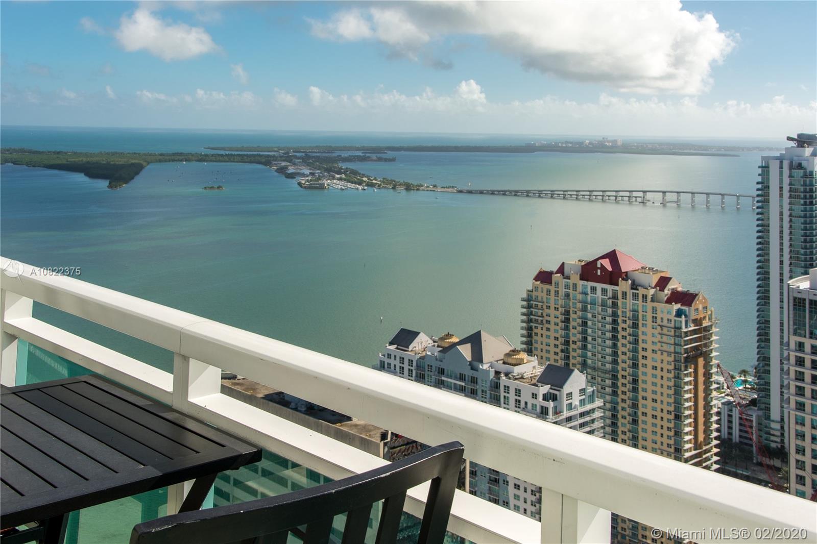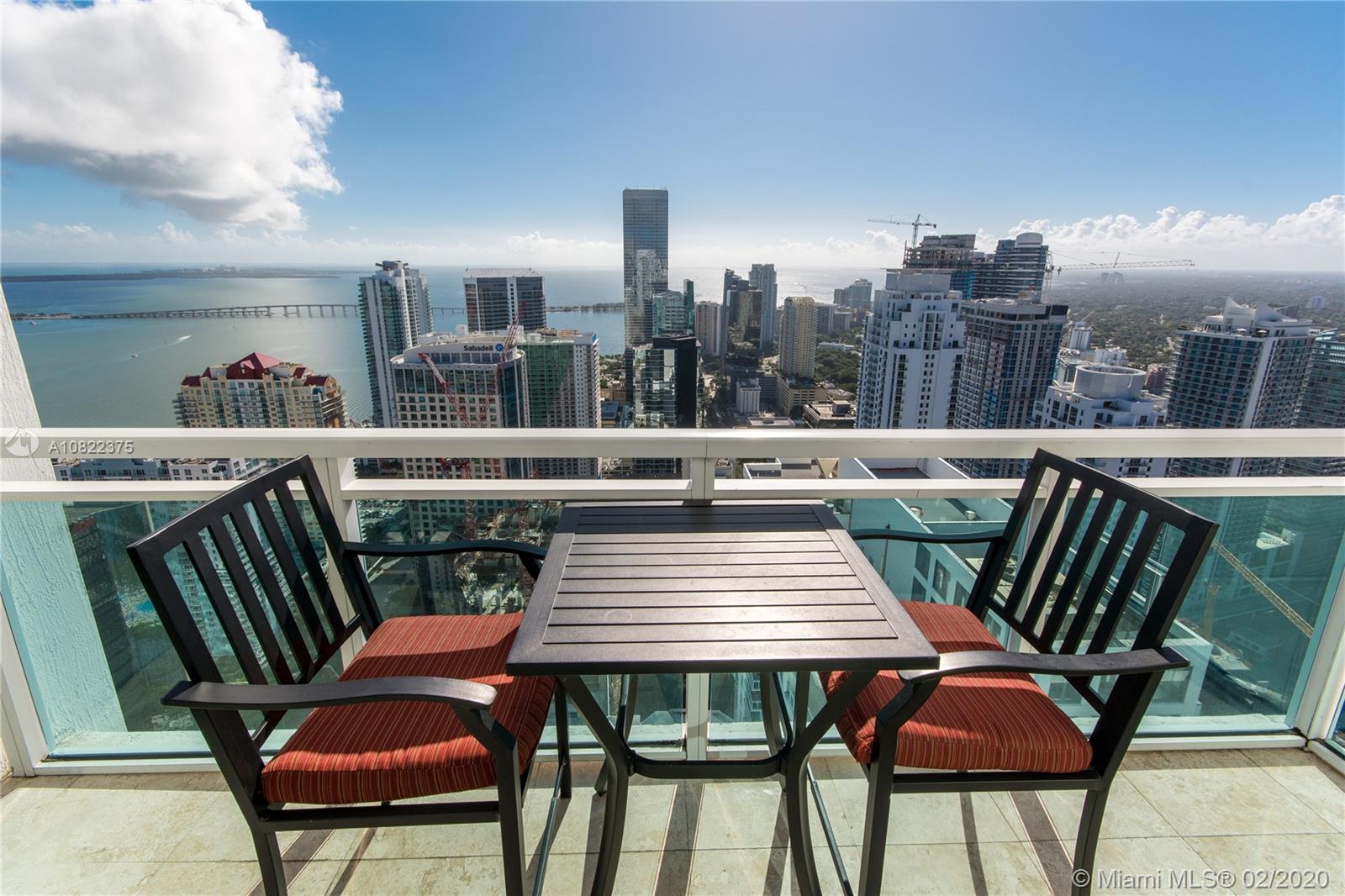 Spectacular Furnished 1bed/1bath on 53rd Floor of Plaza Brickell. Gorgeous SE Bay Views. 10 Ft Ceilings, upgraded GE Monogram stainless appliances, granite counters/espresso cabinetry, drapes/blackout shades, 44" Wall mounted HD Plasma, designer sectional Couch, gorgeous light fixtures, Saturnia marble flooring on balcony. Assigned Space on 1st Floor of garage (lowest floor)! One of the lowest HOA's in Brickell!