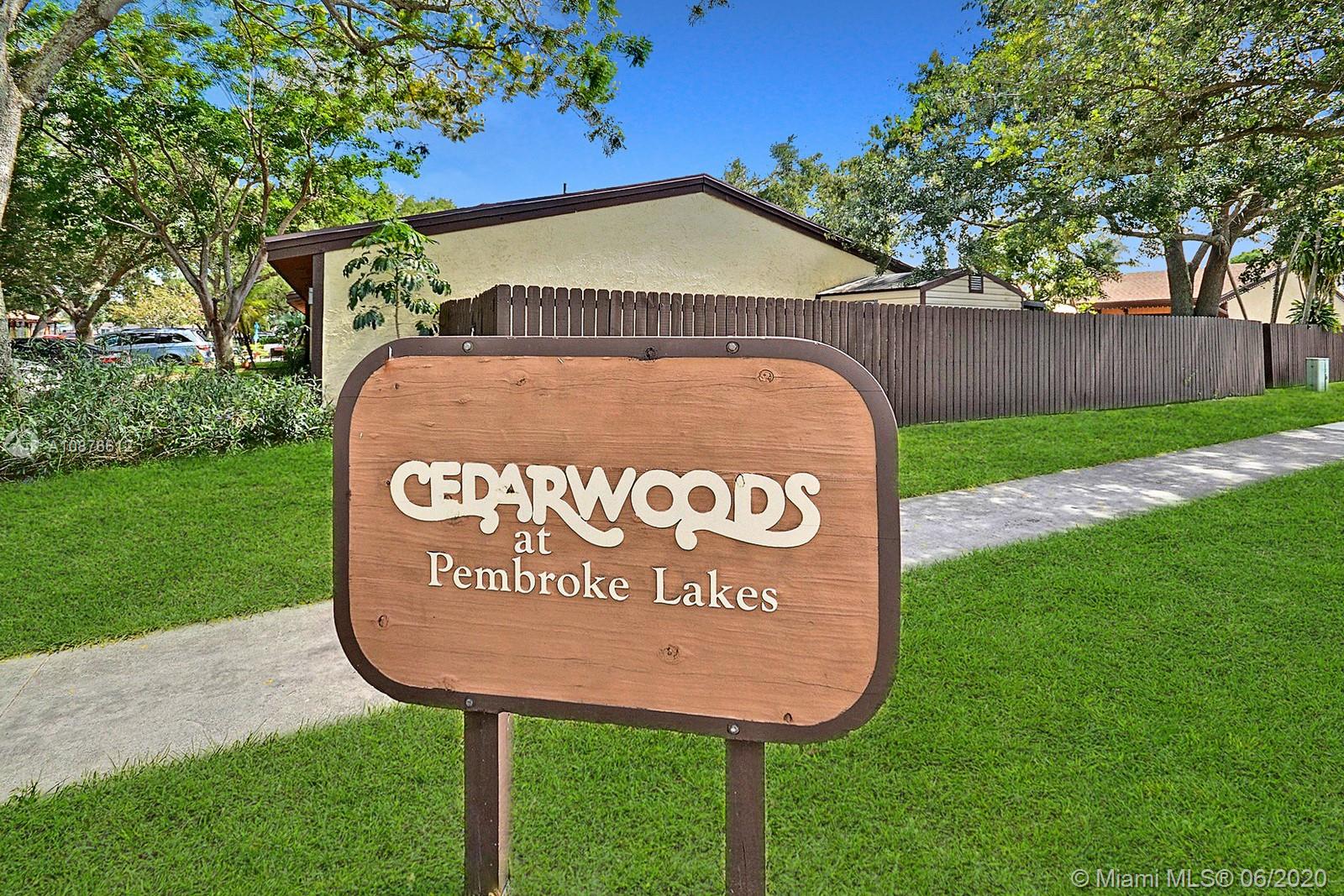 SPACIOUS CORNER TOWNHOME IN CEDARWOODS AT PEMBROKE LAKES FEATURES HIGH CEILINGS, SPACIOUS GALLEY STYLE KITCHEN OFFERS TONS OF CABINETS. SPLIT BEDROOM PLAN, UDATED MASTER SUITE WITH MODERN WOODLIKE PLANK FLOORING, WALK IN CLOSET AND ACCESS TO THE PRIVATE COVERED PATIO. ENSUITE MASTER BATH WITH UPDATED VANITY AND TILE. LARGE PRIVATE FENCED YARD WITH DECK IS PERFECT FOR PETS AND FOR ENTERTAINING, PRETTY LOCATION NEAR THE LAKE. CEDARWOODS IS A CHARMING WELL-MAINTAINED COMMUNITY WITH MATURE TREE-LINED STREETS IN THE DESIRABLE CENTRAL LOCATION OF PEMBROKE LAKES. ENJOY PROXIMITY TO RESTAURANTS, SHOPS, I-75, AND TO MEMORIAL WEST HOSPITAL.
