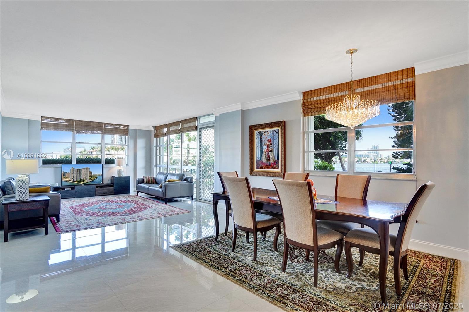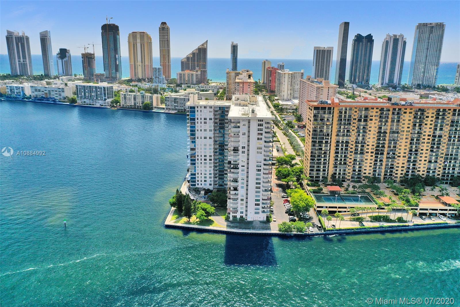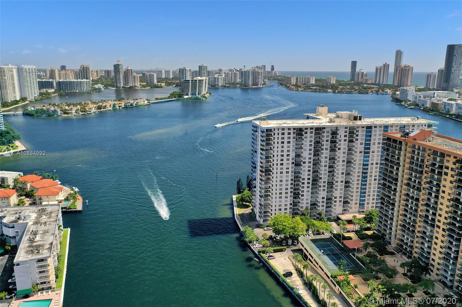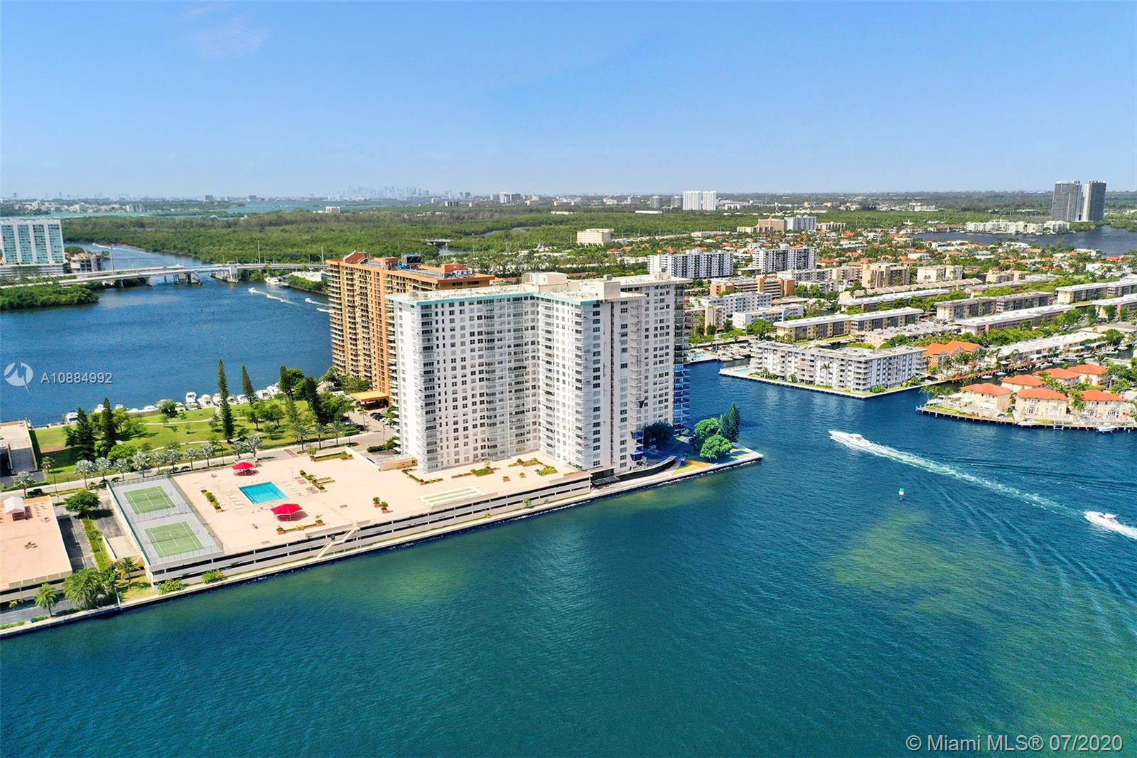 Spectacular light-filled corner unit with WATER VIEWS from every window! This 3 bedroom, 3 full bathroom unit has 9' high ceilings and an expansive floor plan with PORCELAIN tile and wood floors, a newly renovated kitchen with soft-close shaker-style cabinets, QUARTZ countertops, Samsung STAINLESS STEEL appliances, an office nook, lots of closets and huge WALK-IN CLOSETS with custom cabinetry, NEWER A/C, and a split-bedroom floor plan for the utmost privacy for your guests. A private park in front of the unit makes this unit a peaceful retreat and gives it a homey feel, unlike any other condo. LOW HOA fees! IDEAL LOCATION - 10 min walk(or take shuttle) to Sunny Isles Beach, 10 min drive to Aventura mall, close to Gulfstream!