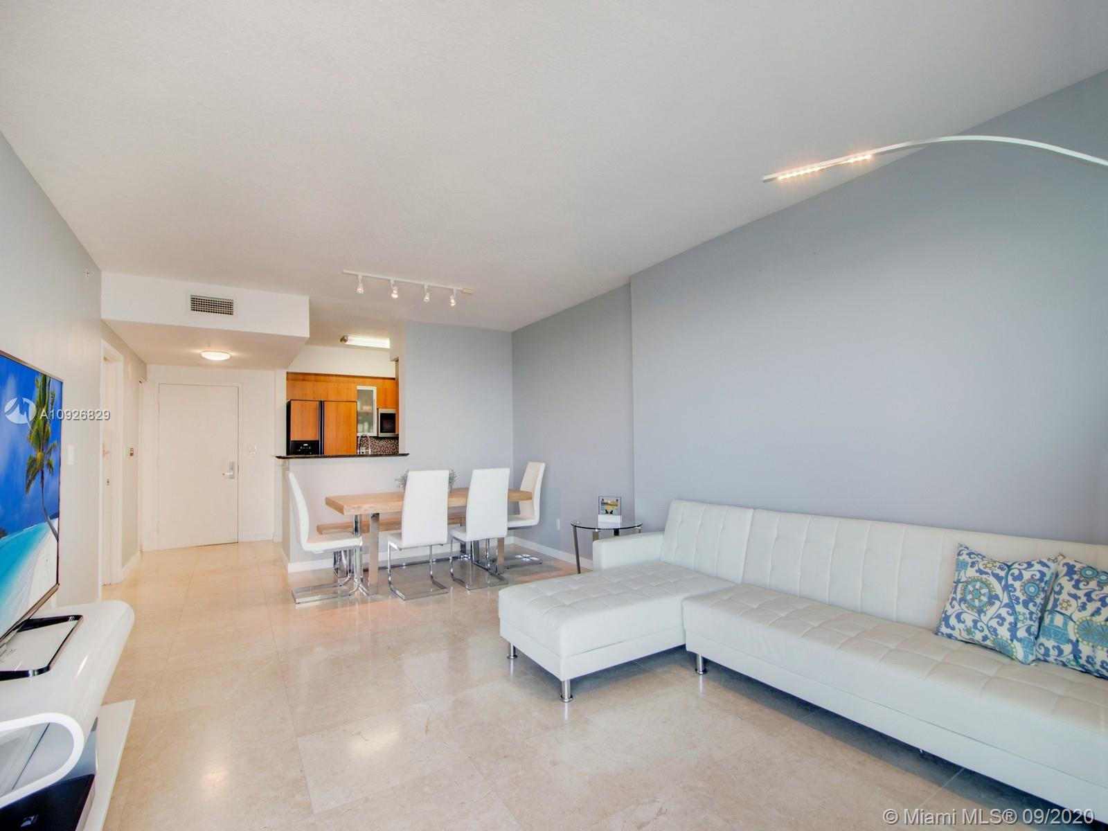 Welcome to Miami. Home to international business, Miami Beach, nightlife and the Florida Keys. This 846 square-foot one bedroom one bath home has stunning views of Biscayne Bay. Watch the cruise ships enter and leave port; watch dolphins playing; watch amazing fireworks for New Year’s Eve and Fourth of July all from the comfort of your own home. This contemporary apartment boosts 24“ x 24“ marble tiles throughout, 8 foot ceilings, blackout shades in the bedroom, Whirlpool appliances, whirlpool washer and dryer and impact resistant sliding doors and window. Luxurious lobby with 24 hour door attendants , two pools, hot tub, two gyms and a sauna complete your new retreat!