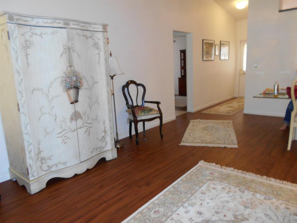Much sought after VILLA; 1 fl., patio to the no. side and 18x10 porch on the back facing what looks like a preserve, deep w/ green area w/trees . Fees incl. upcoming re roof, and new fencing.impact windows @ back patio sliders, gated entry system. Hallway separates the 2 Bedrooms. Close to shopping, PBIA air port, I-95 & Turnpike. Beaches 15-20 min.