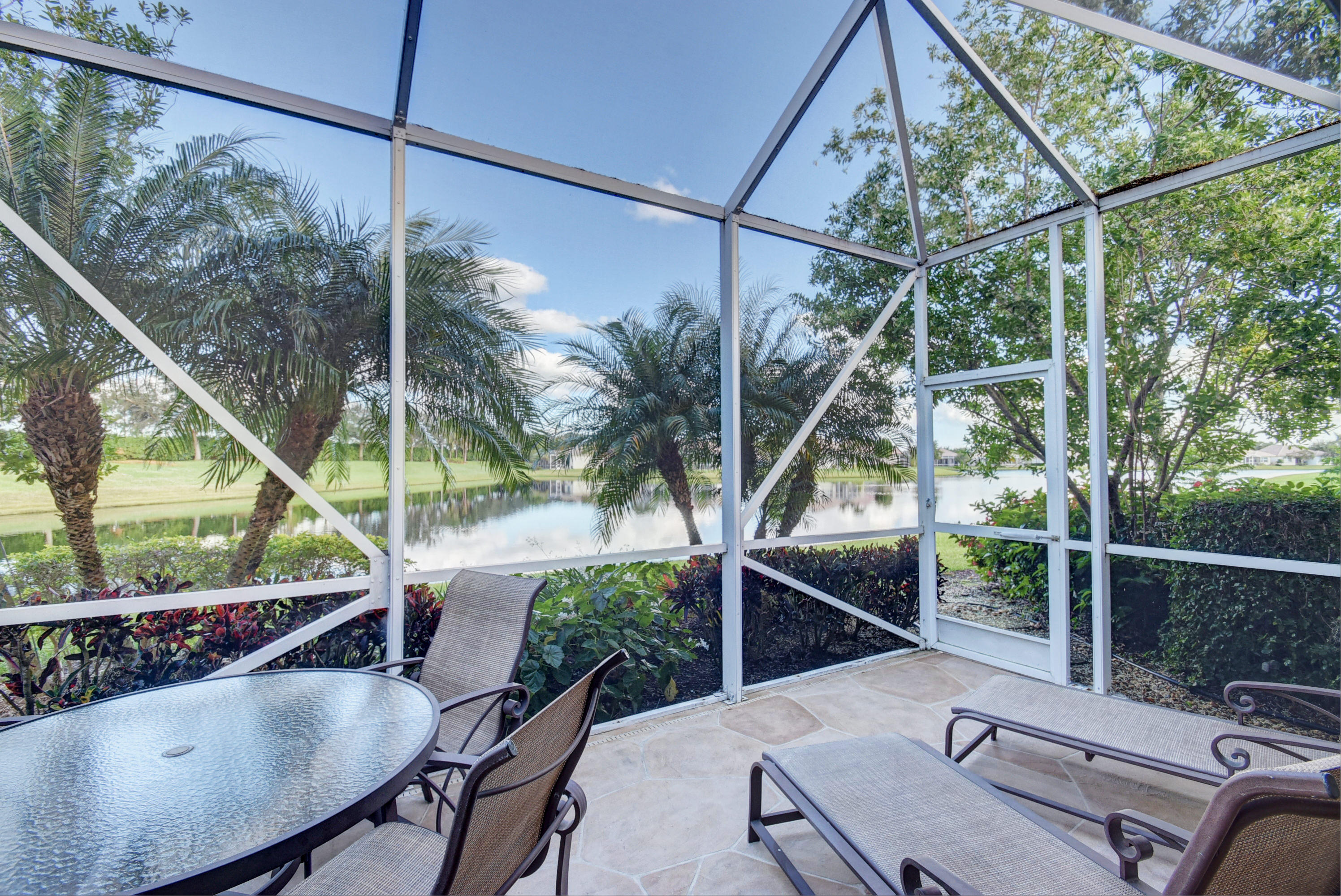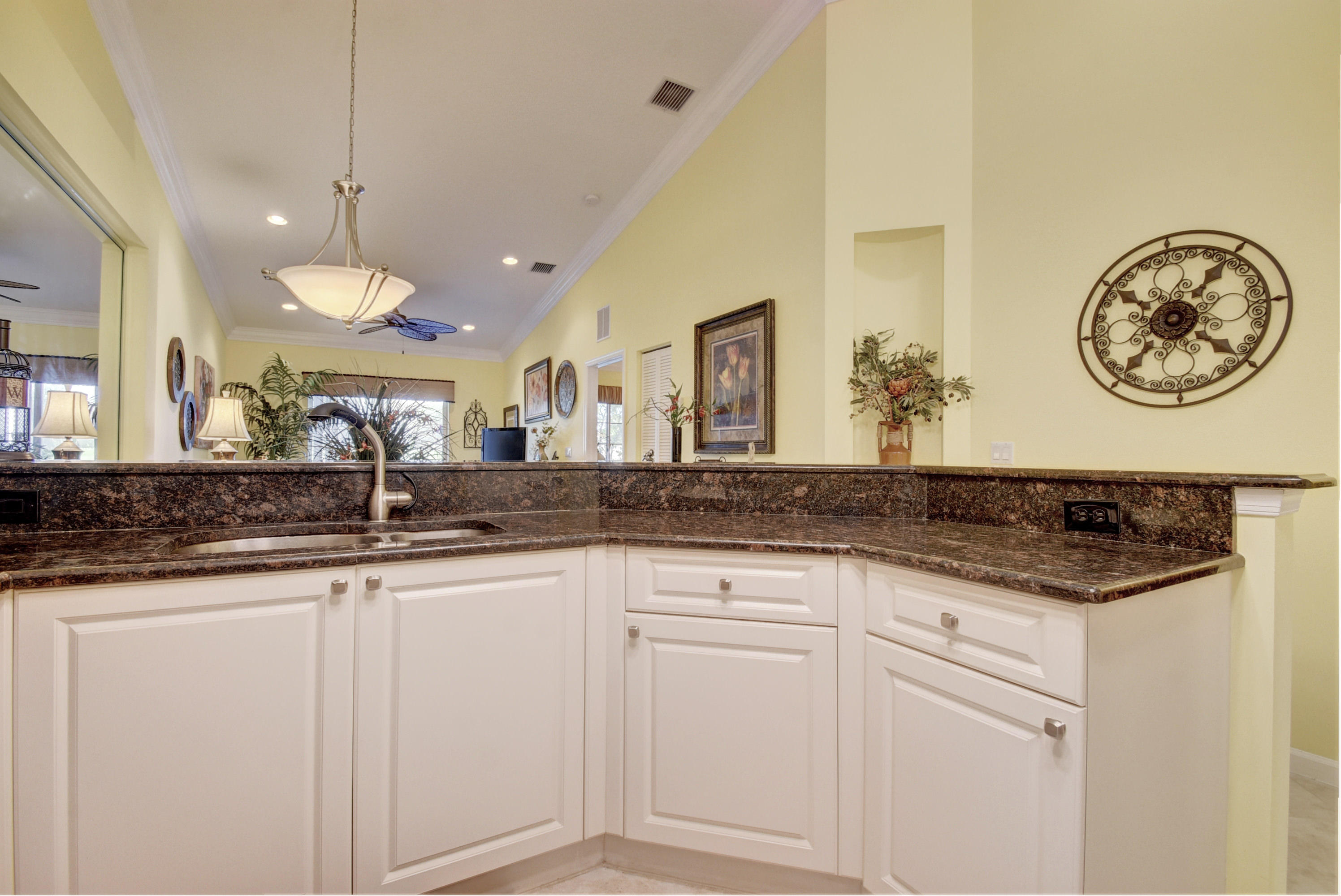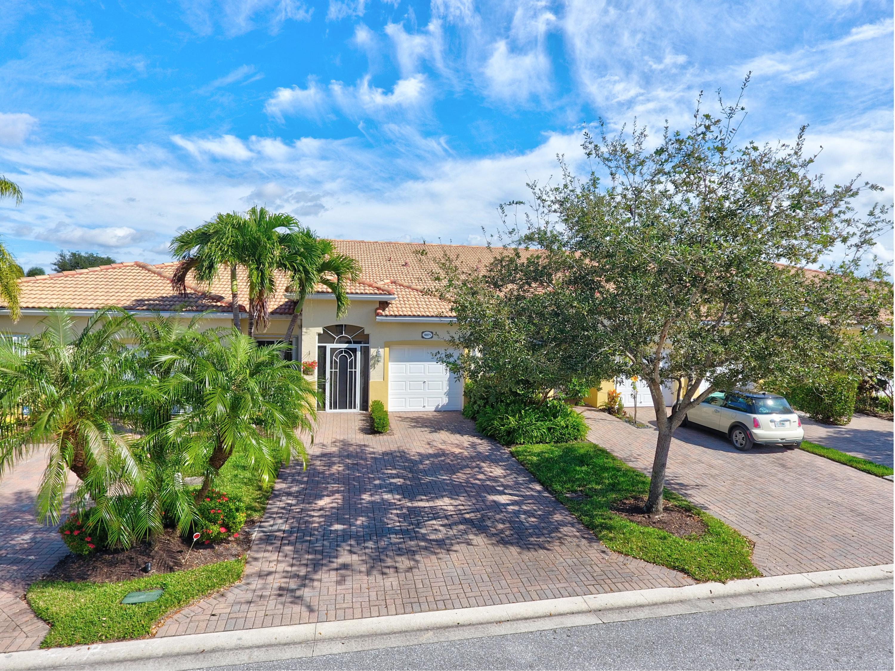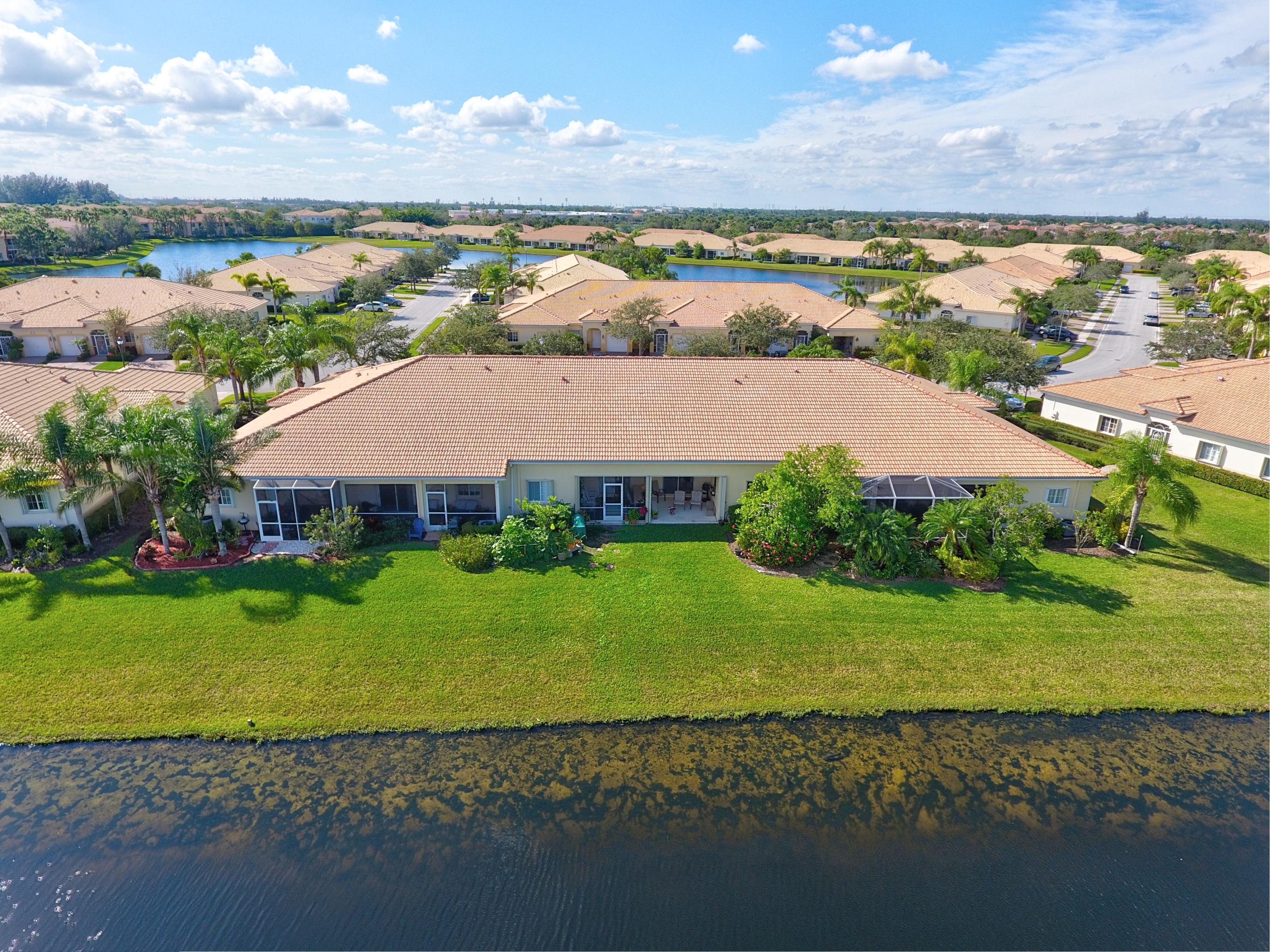 Wow...Stunning 2 bedroom villa plus den/office/formal dining room; fexible space. Enjoy viewing the glistened sun-lit lake while enjoying a barbecue or winding down at the end of a long day. No expense has been spared in this well maintained home. Crown moldling throughout, freshly painted interior,Tile on diagonal in living areas - laminate in bedrooms. Separate Laundry room makes this villa unique to others. W/D NOT In GARAGE! Designer window treatments, Upgraded ceiling fans and custom mirrors add to this home's uniqueness.Kitchen has Granite countertops and SS appliances. Master bath has granite & frameless shower door.Built ins in all closets for easy organizing. Serene Lake view with screened in back patio. No neighbors in back! And Accordian Shutters! Furniture is negotiable