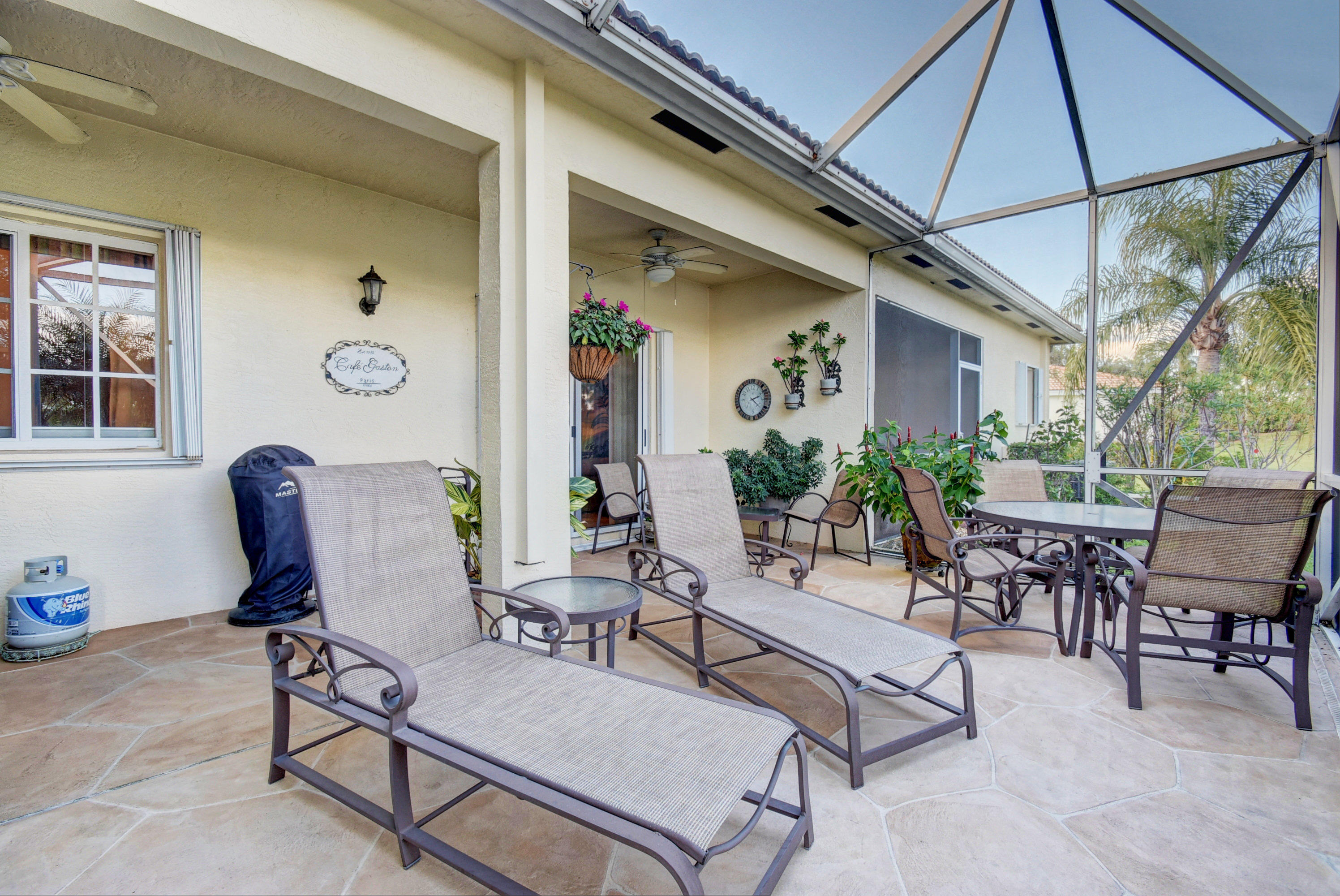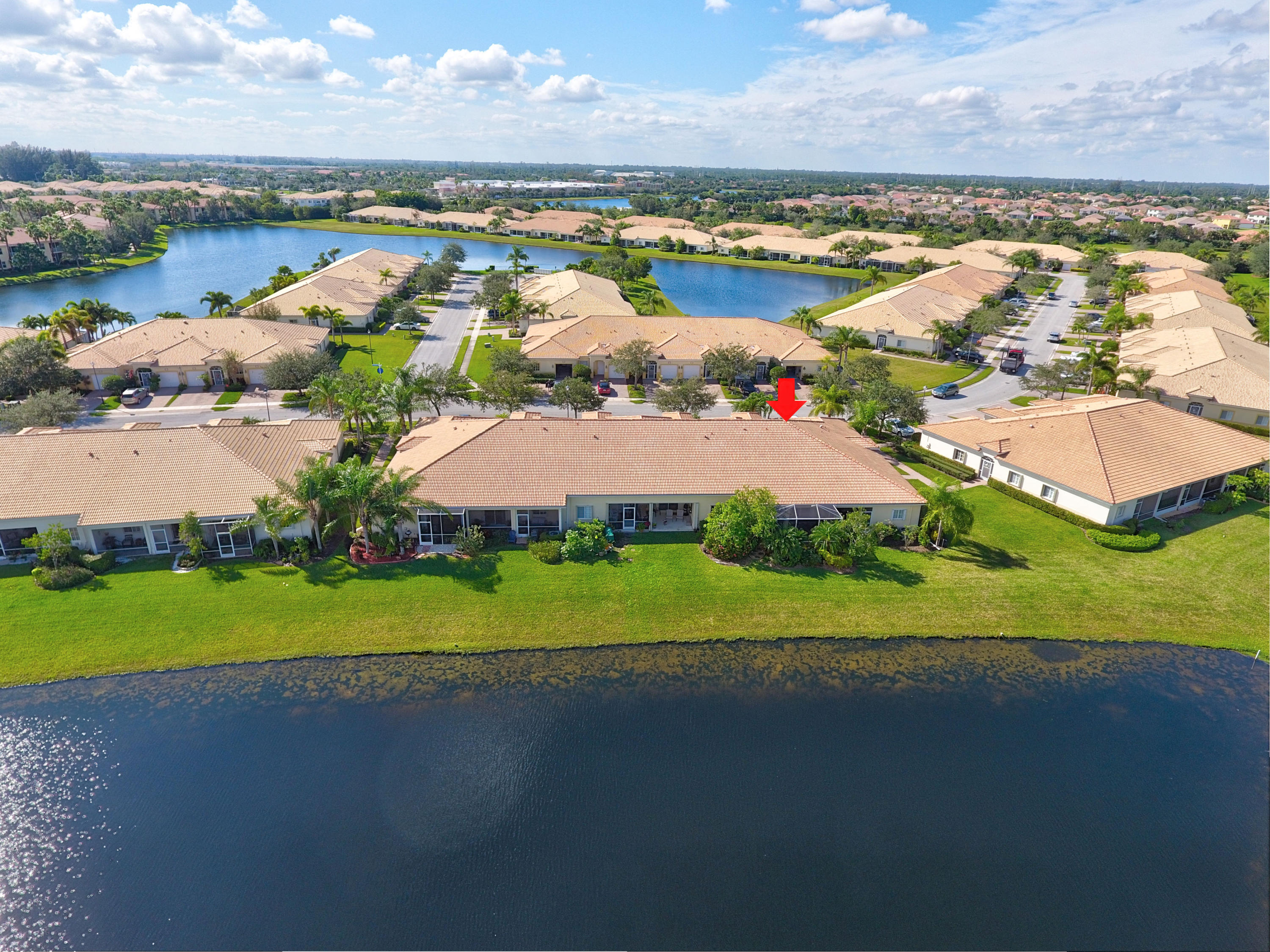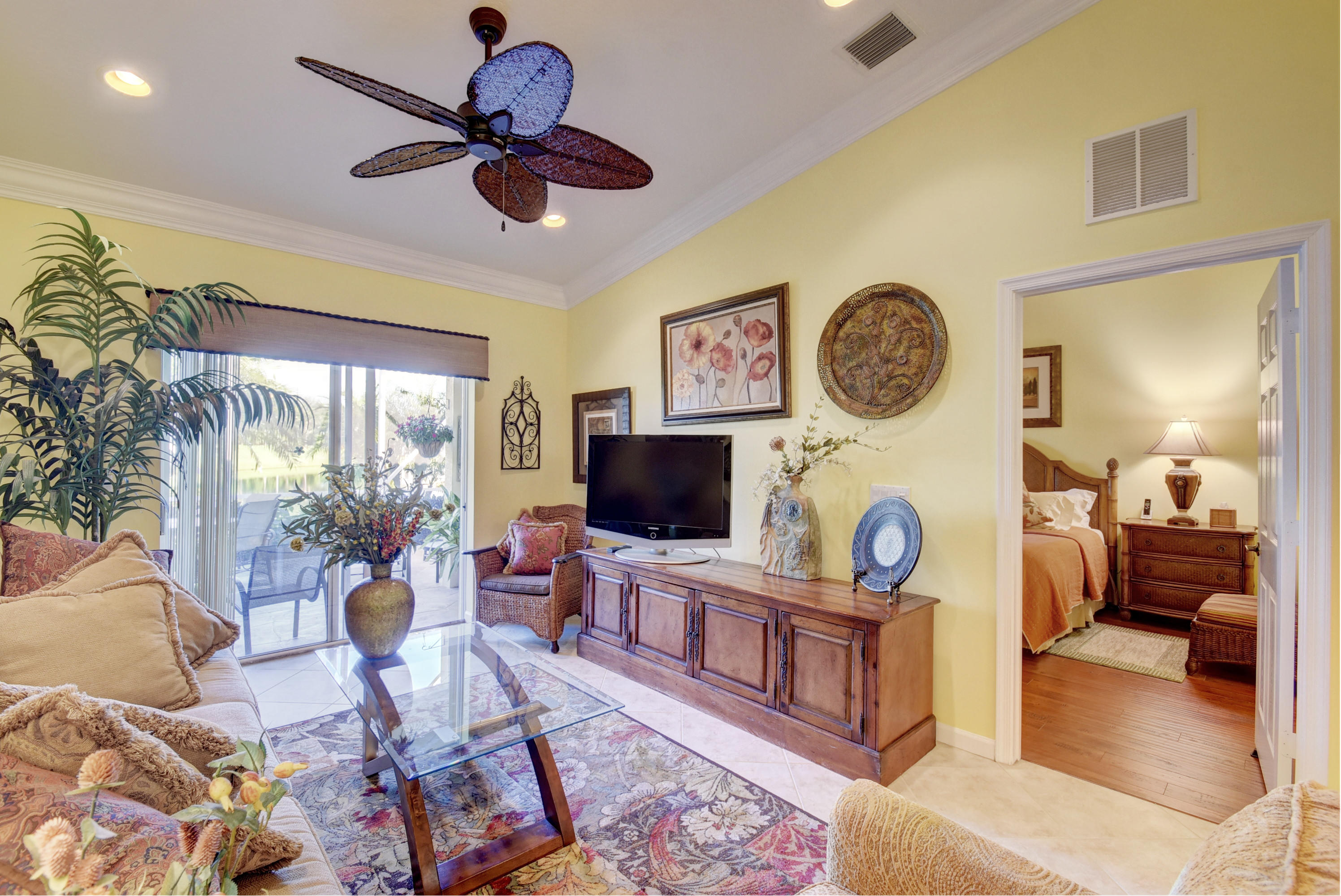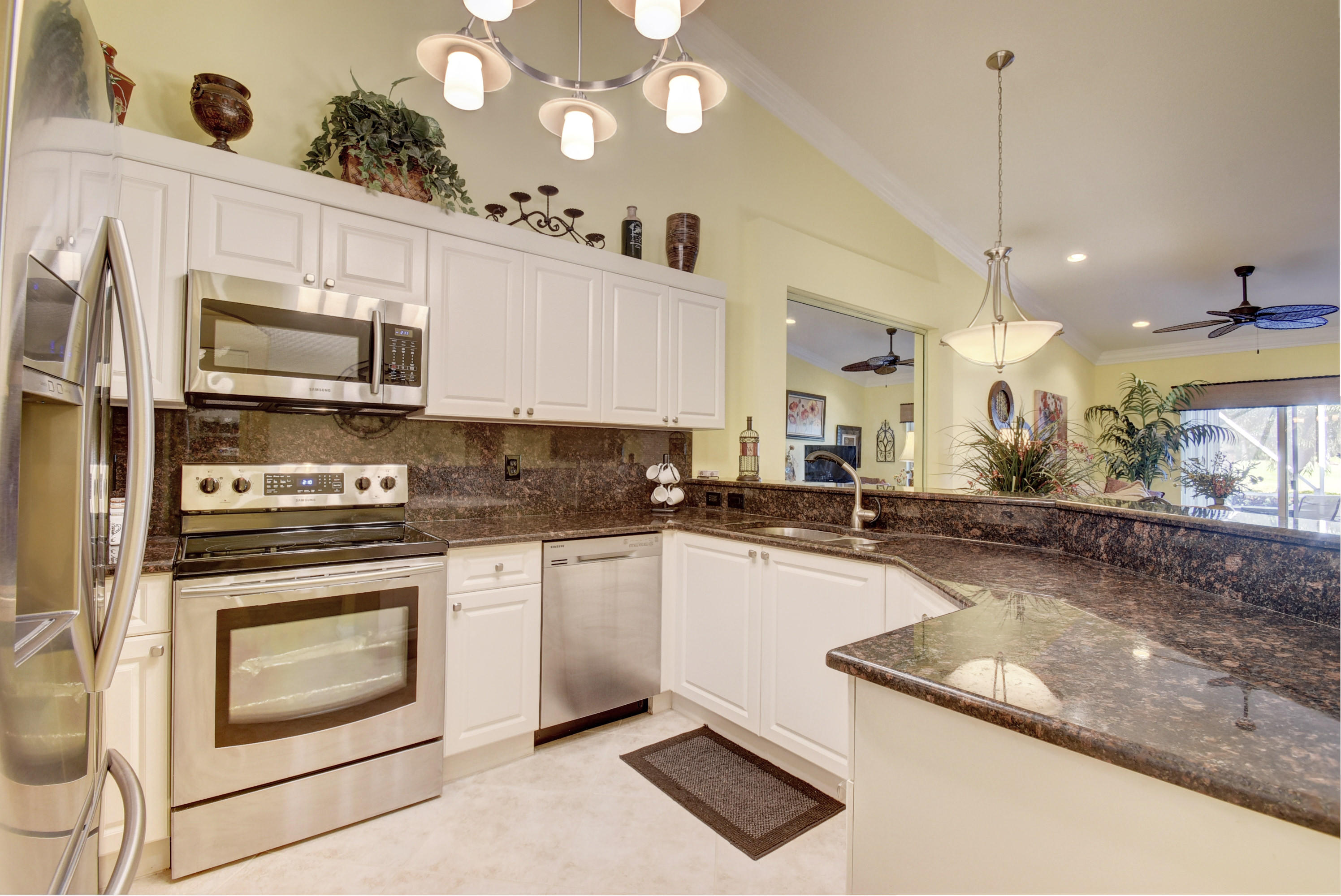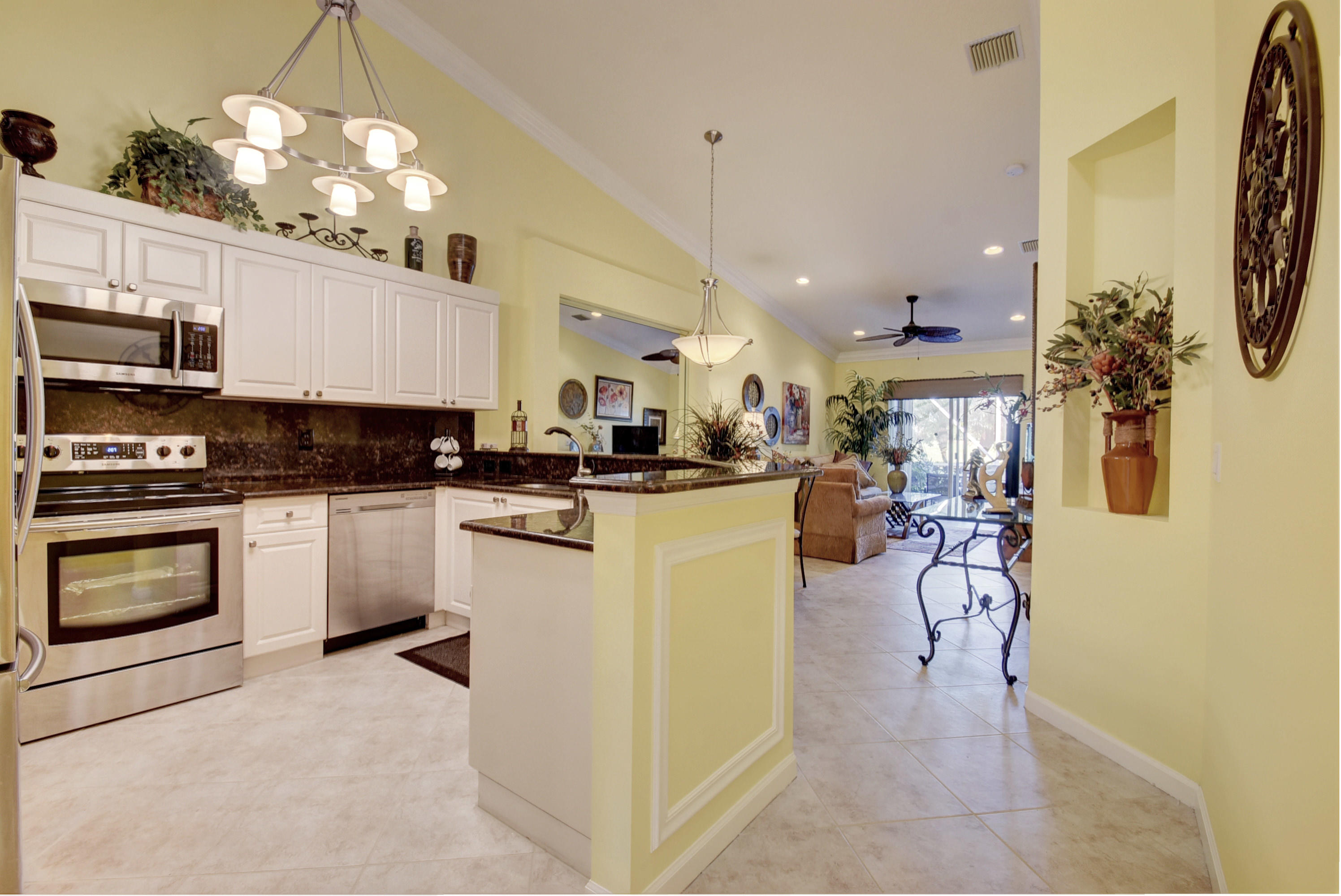 Wow...Stunning 2 bedroom villa plus den/office/formal dining room; fexible space. Enjoy viewing the glistened sun-lit lake while enjoying a barbecue or winding down at the end of a long day. No expense has been spared in this well maintained home. Crown moldling throughout, freshly painted interior,Tile on diagonal in living areas - laminate in bedrooms. Separate Laundry room makes this villa unique to others. W/D NOT In GARAGE! Designer window treatments, Upgraded ceiling fans and custom mirrors add to this home's uniqueness.Kitchen has Granite countertops and SS appliances. Master bath has granite & frameless shower door.Built ins in all closets for easy organizing. Serene Lake view with screened in back patio. No neighbors in back! And Accordian Shutters! Furniture is negotiable