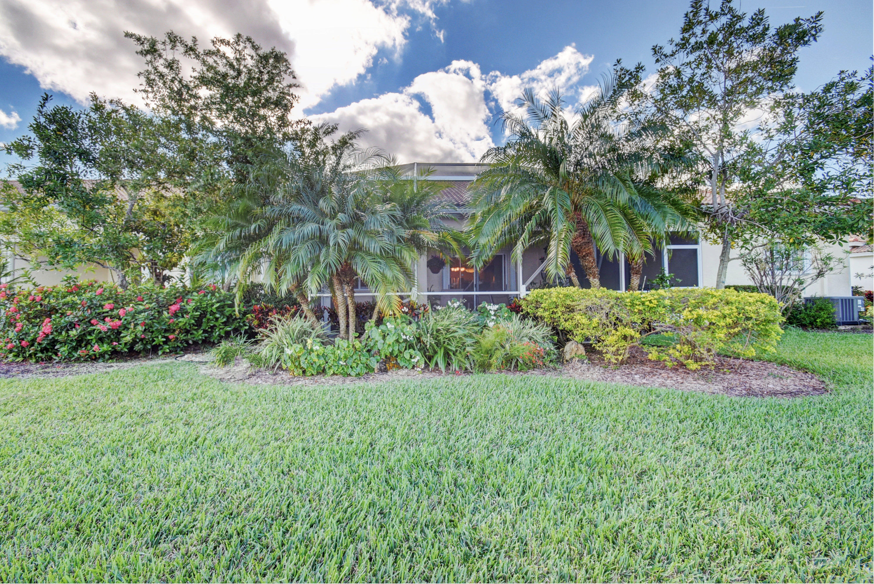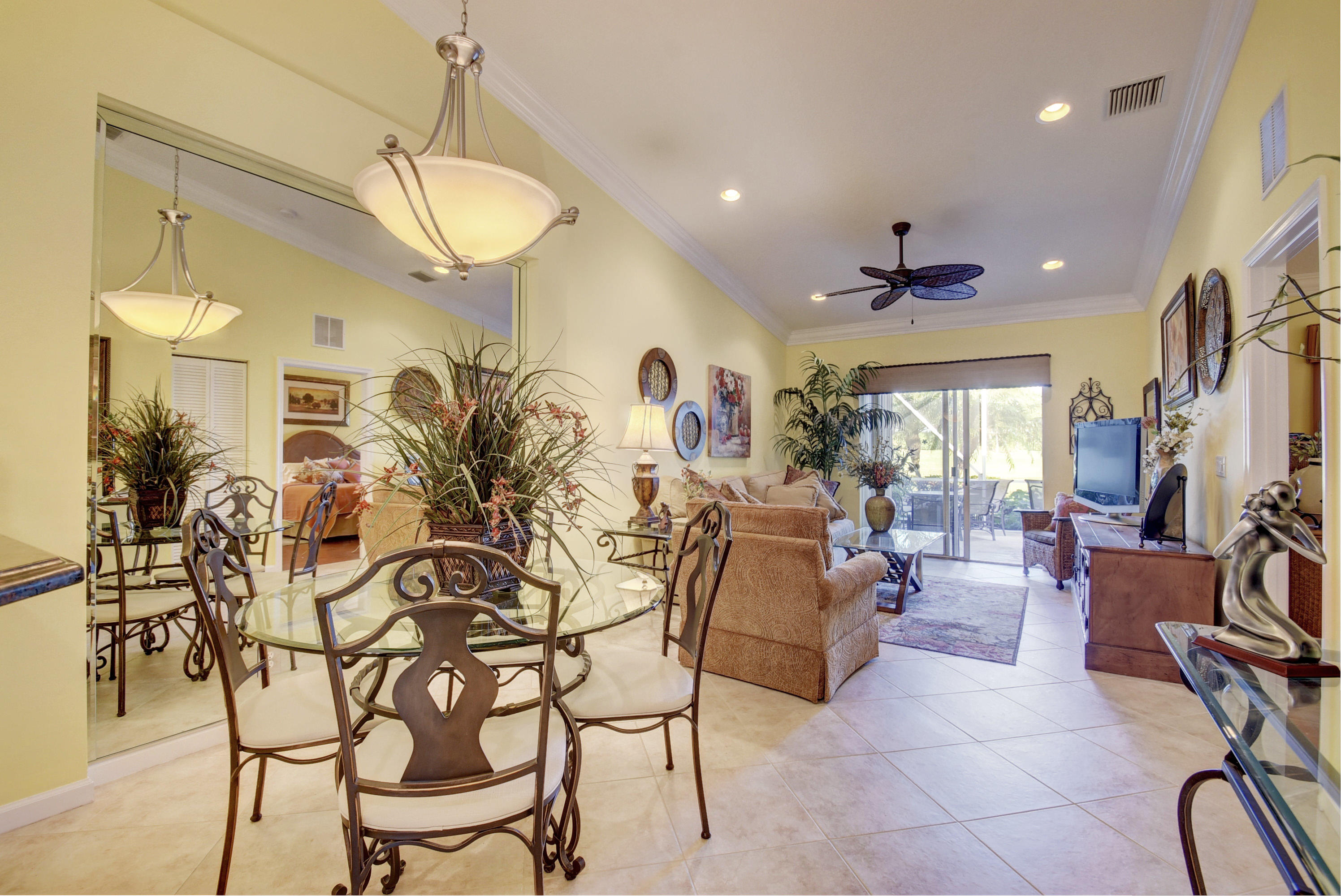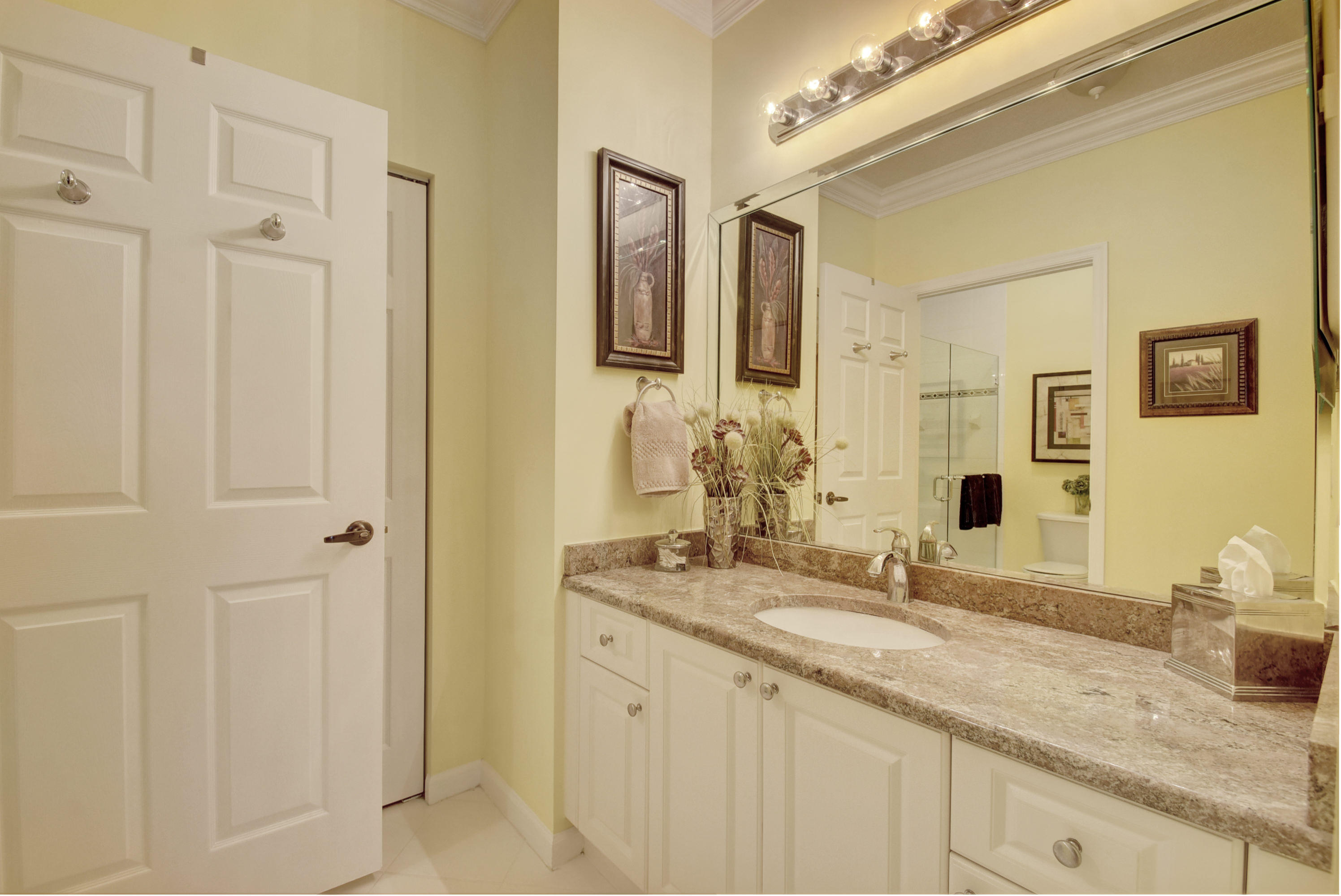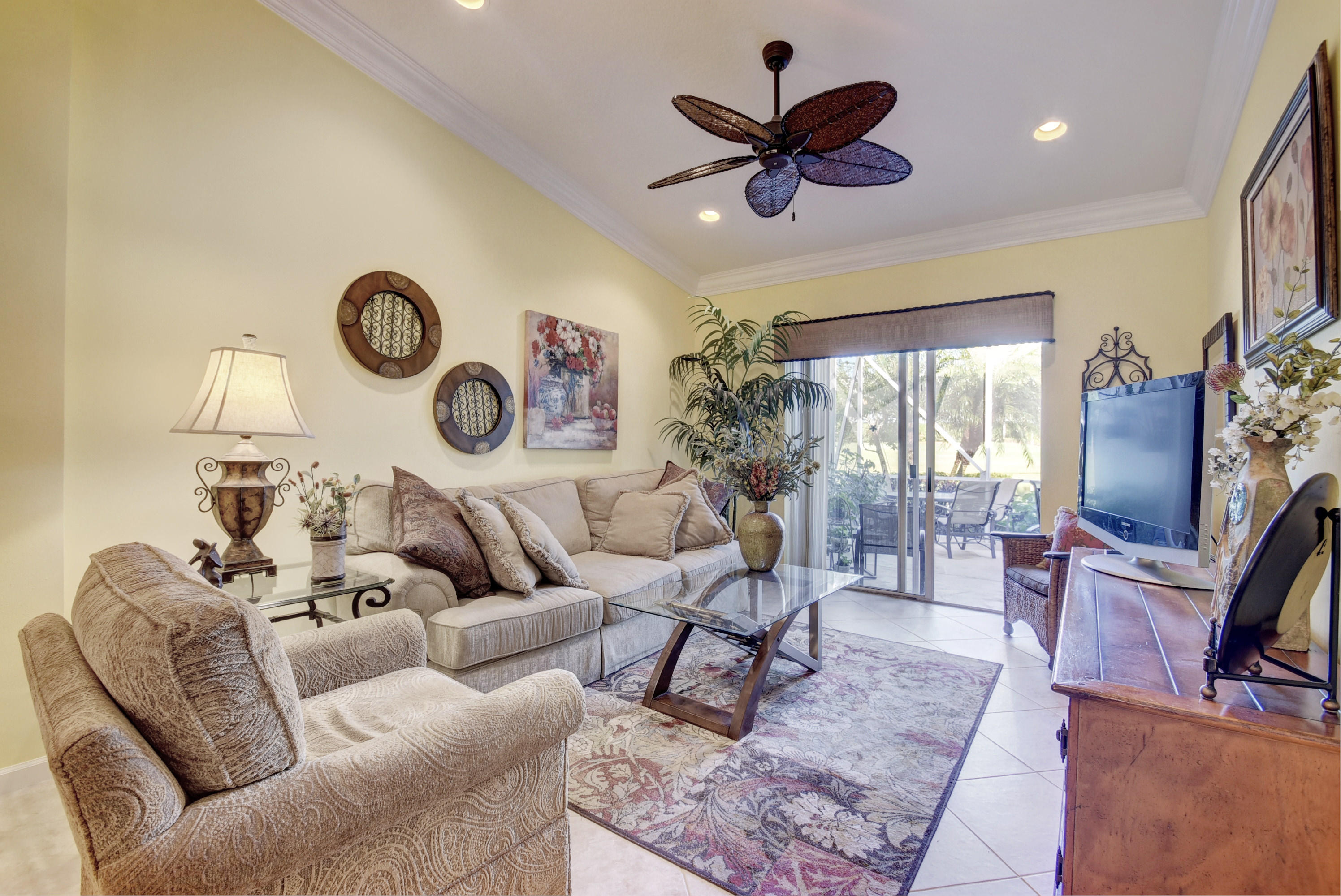 Wow...Stunning 2 bedroom villa plus den/office/formal dining room; fexible space. Enjoy viewing the glistened sun-lit lake while enjoying a barbecue or winding down at the end of a long day. No expense has been spared in this well maintained home. Crown moldling throughout, freshly painted interior,Tile on diagonal in living areas - laminate in bedrooms. Separate Laundry room makes this villa unique to others. W/D NOT In GARAGE! Designer window treatments, Upgraded ceiling fans and custom mirrors add to this home's uniqueness.Kitchen has Granite countertops and SS appliances. Master bath has granite & frameless shower door.Built ins in all closets for easy organizing. Serene Lake view with screened in back patio. No neighbors in back! And Accordian Shutters! Furniture is negotiable