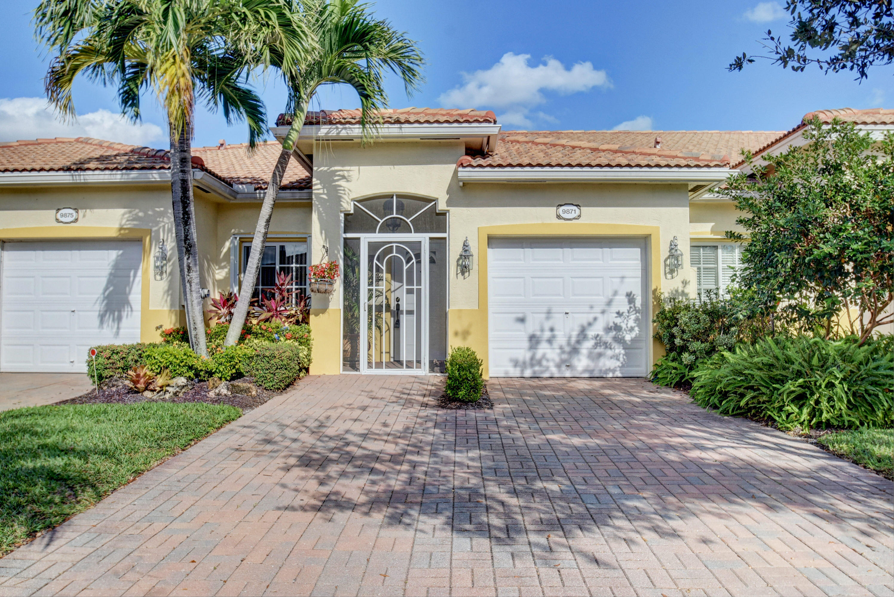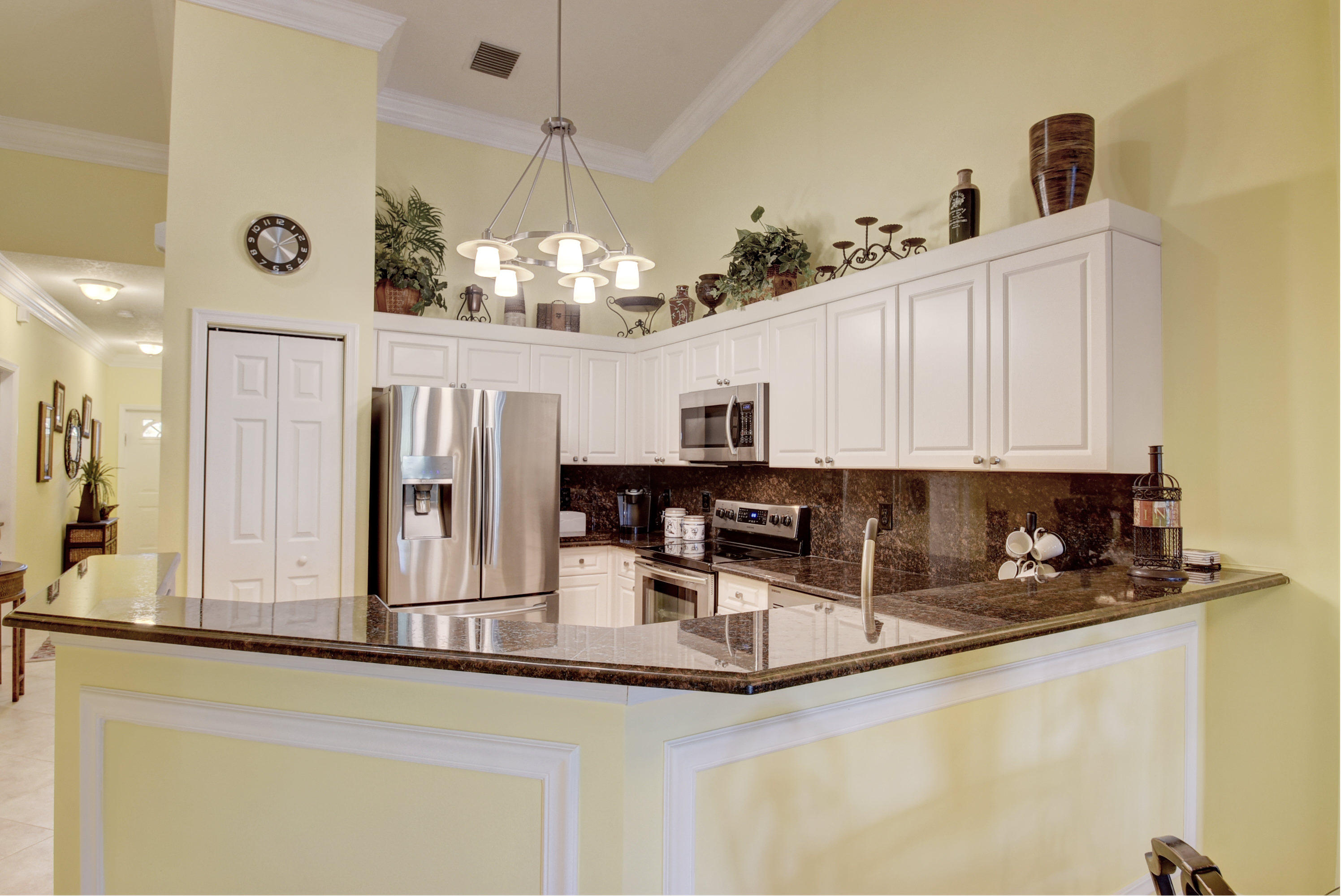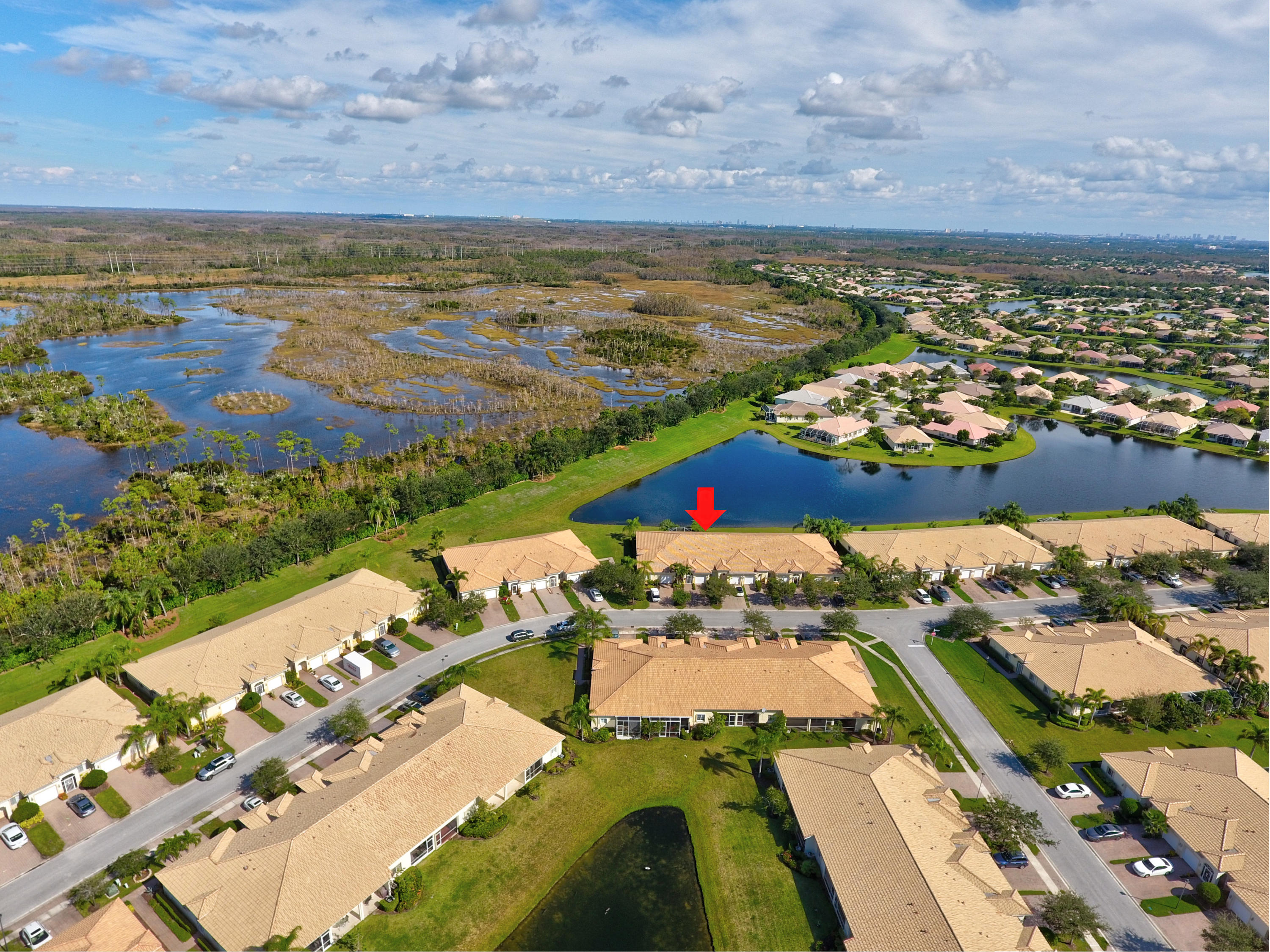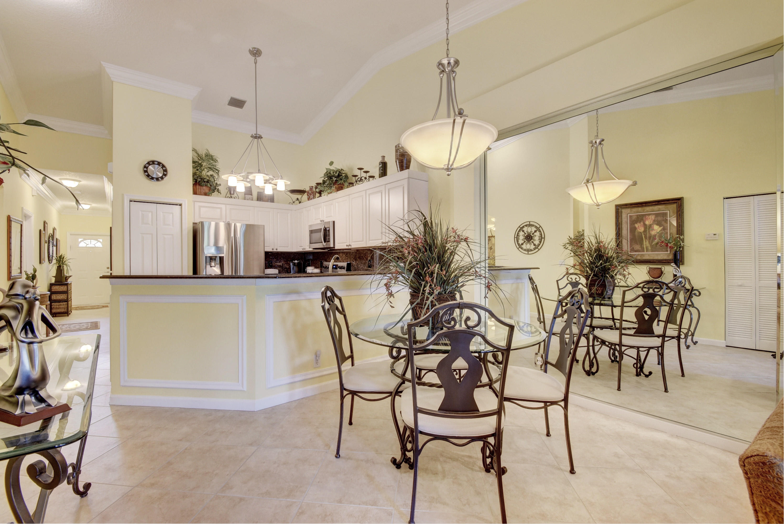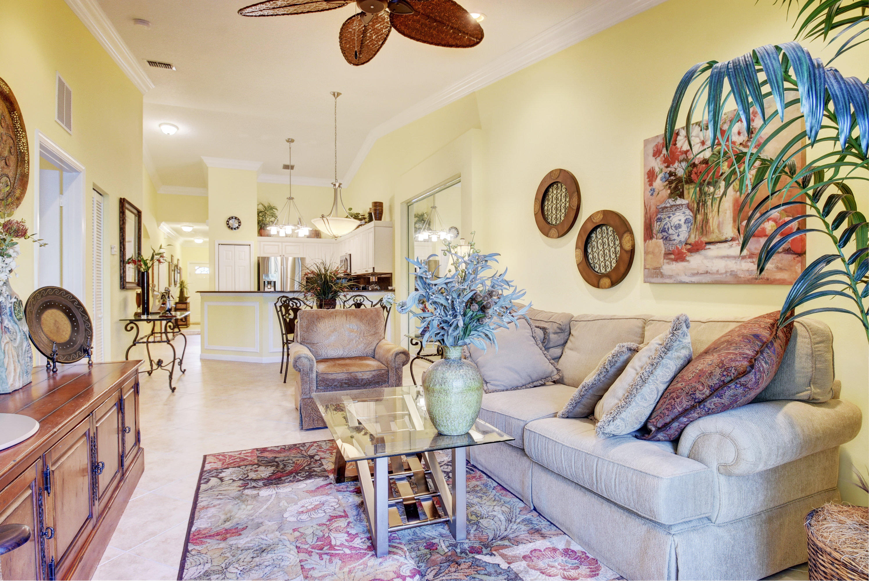 Wow...Stunning 2 bedroom villa plus den/office/formal dining room; fexible space. Enjoy viewing the glistened sun-lit lake while enjoying a barbecue or winding down at the end of a long day. No expense has been spared in this well maintained home. Crown moldling throughout, freshly painted interior,Tile on diagonal in living areas - laminate in bedrooms. Separate Laundry room makes this villa unique to others. W/D NOT In GARAGE! Designer window treatments, Upgraded ceiling fans and custom mirrors add to this home's uniqueness.Kitchen has Granite countertops and SS appliances. Master bath has granite & frameless shower door.Built ins in all closets for easy organizing. Serene Lake view with screened in back patio. No neighbors in back! And Accordian Shutters! Furniture is negotiable