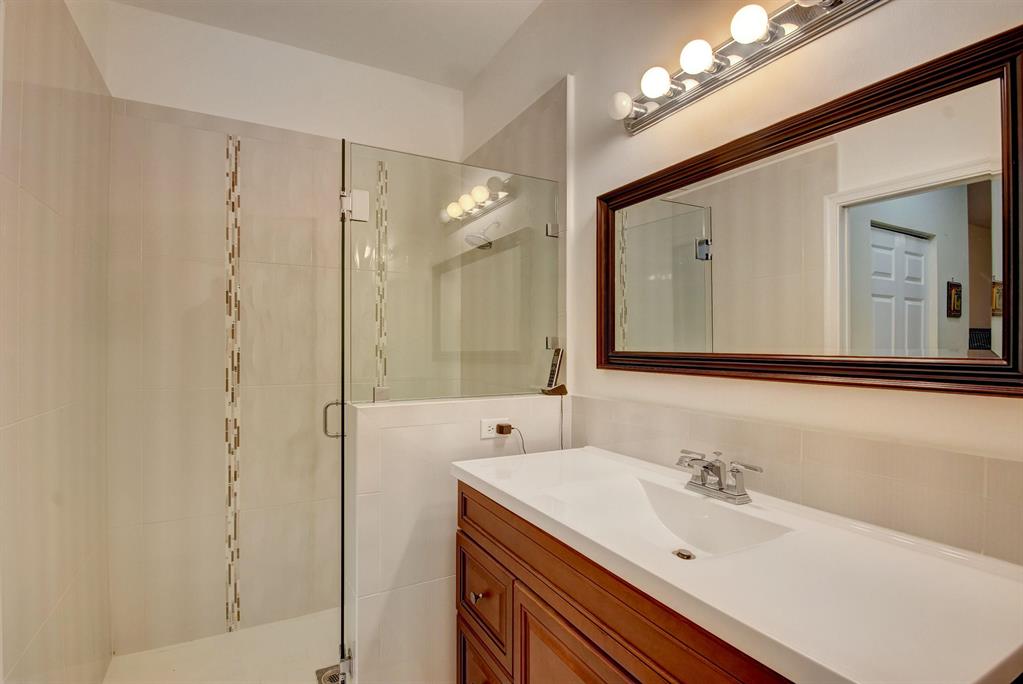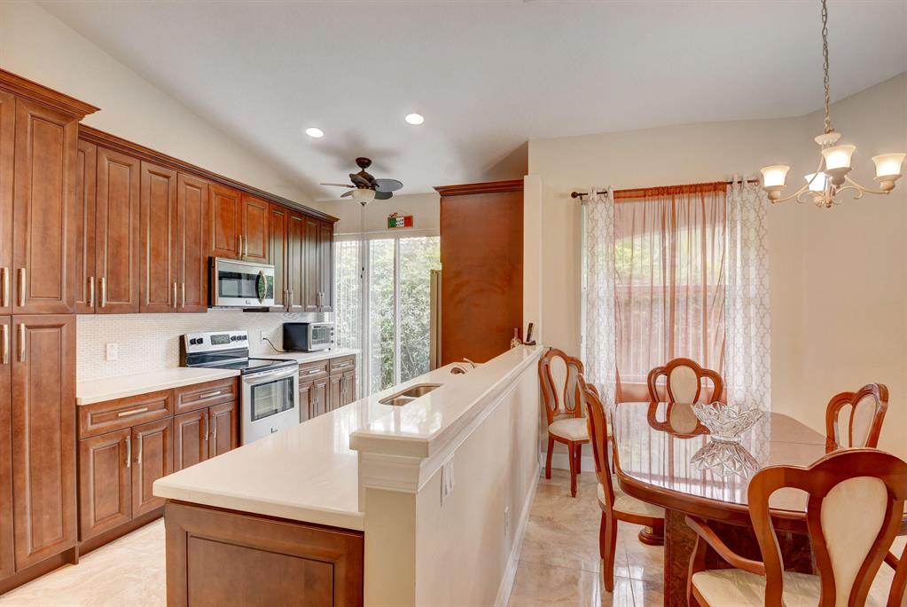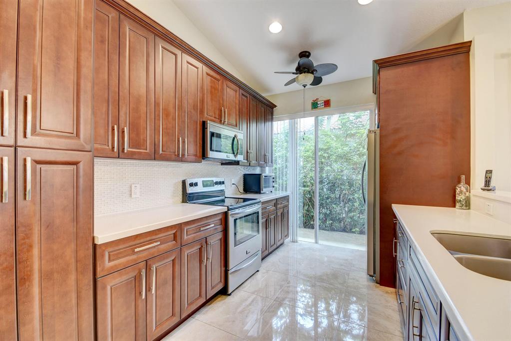 Corner Villa with a private side gated entrance 3 bedroom 2 bath 2 car garage and a large paver driveway. This home has been updated from the floors, bathrooms, newer AC and kitchen. No carpet! Large 24'' porcelain tile floors greet you as you enter this home. Stunning solid wood kitchen cabinets with pull out drawers and soft touch doors adorned with a stylish tiled back splash. Stainless steel appliances and beautiful bright white Corian counter tops! Owners opened the wall to the living room creating an opened floor plan. The volume ceilings make this home feel very large. The bathrooms are updated with new all vanities and gorgeous tiled floors and walls. The master bedroom has a walk in closets. Bathroom walk in shower.