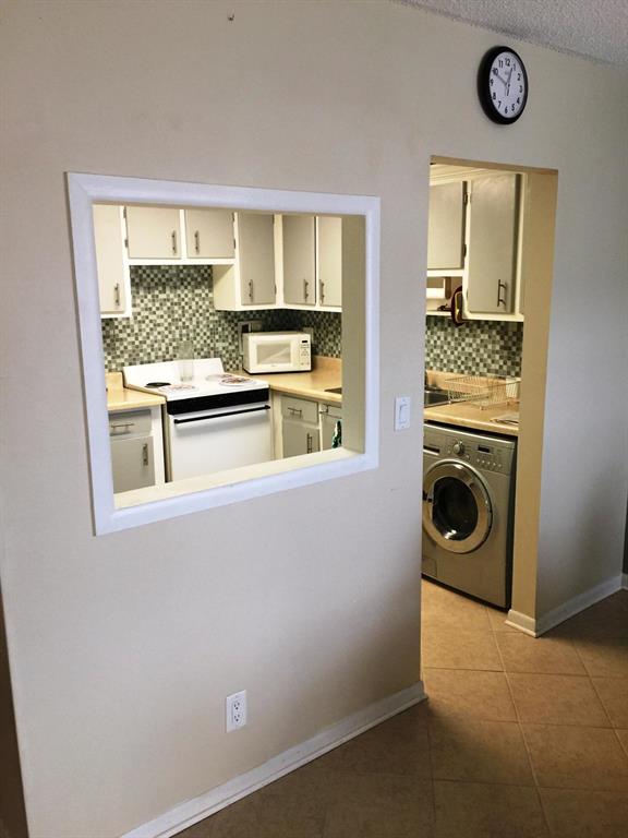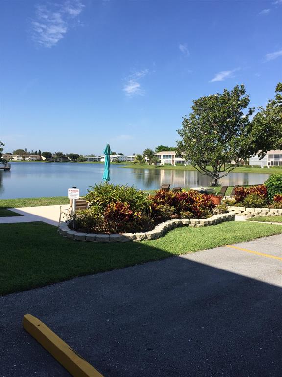 Century Village has so much to offer! Clubhouse, pools, secure gated community, active lifestyle. Lovely, updated 1st floor lakeside condo. Tranquil unobstructed view. Plexi-glass enclosed terrace is perfect for taking in the view. Light & bright. 1 bedroom with 1 1/2 baths, ceramic tile in living area, carpeted bedroom with custom outfitted closets. Contemporary kitchen with ceramic glass backsplash, double SS sinks and built-in full size combo washer/dryer. Decorative ceramic tile detailing in full bath with step in shower. Additional 1/2 bath as well. Partially furnished. Owner has relocated for quick closing.