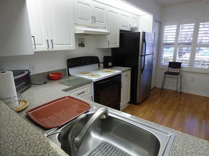 Very clean 1st floor unit. Newest section. Back door to pool. Redone kitchen, Laminate floors in kitchen and foyer. Bathroom tub& shower redone. New high toilets. New patio frame. Hurricane shutters throughout. Tankless hat water. Newer air cond. Plantat ion shutters. park in front. HOPA comm.Million dollar clubhouse, 2 fitness centers, 24 hr security, 8 swimming pools, bus transportation, tennis, movies, theatre, shows, billiards, pharmacy, cafe, golf, and much more. Near Pembroke Gardens and the mall.