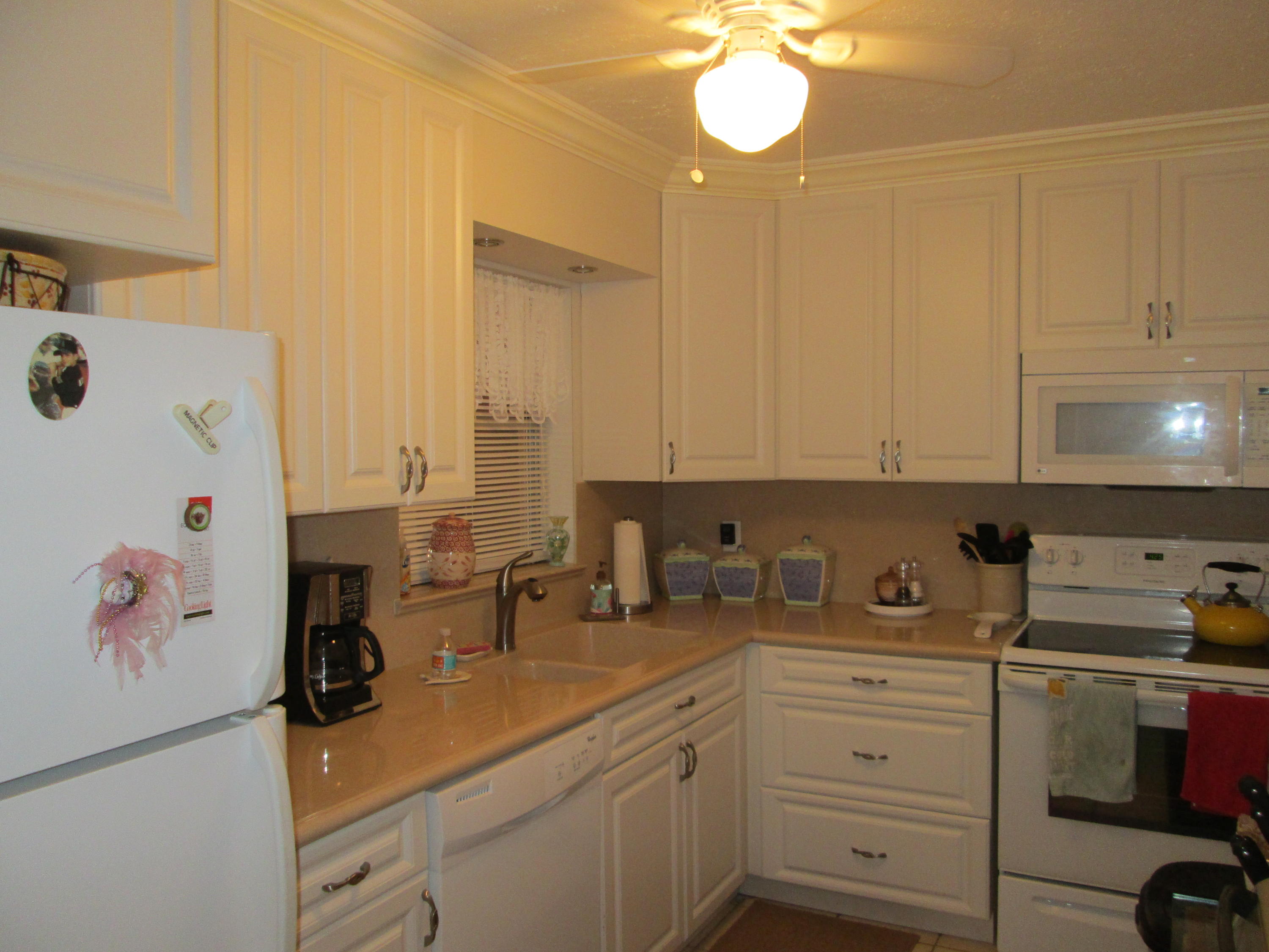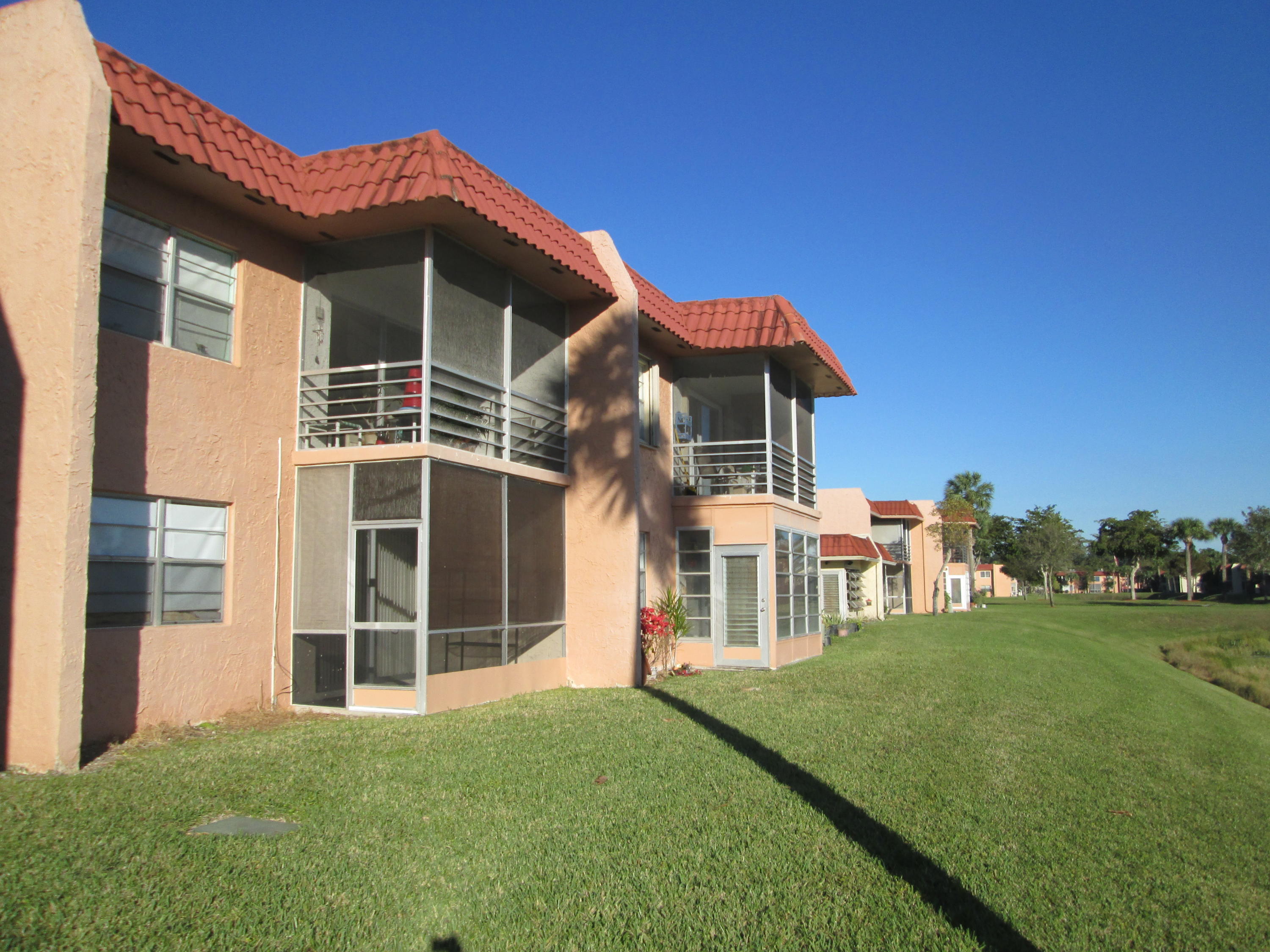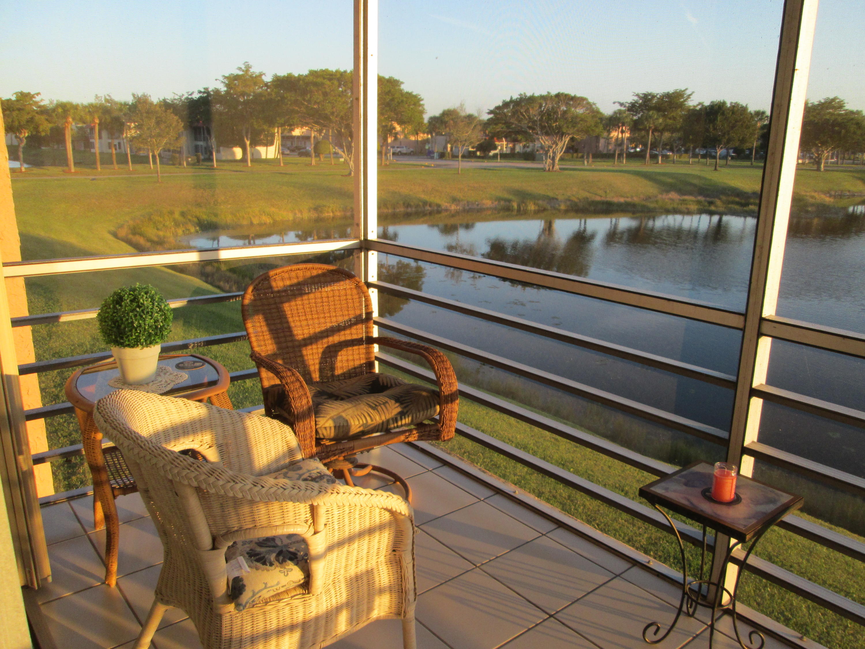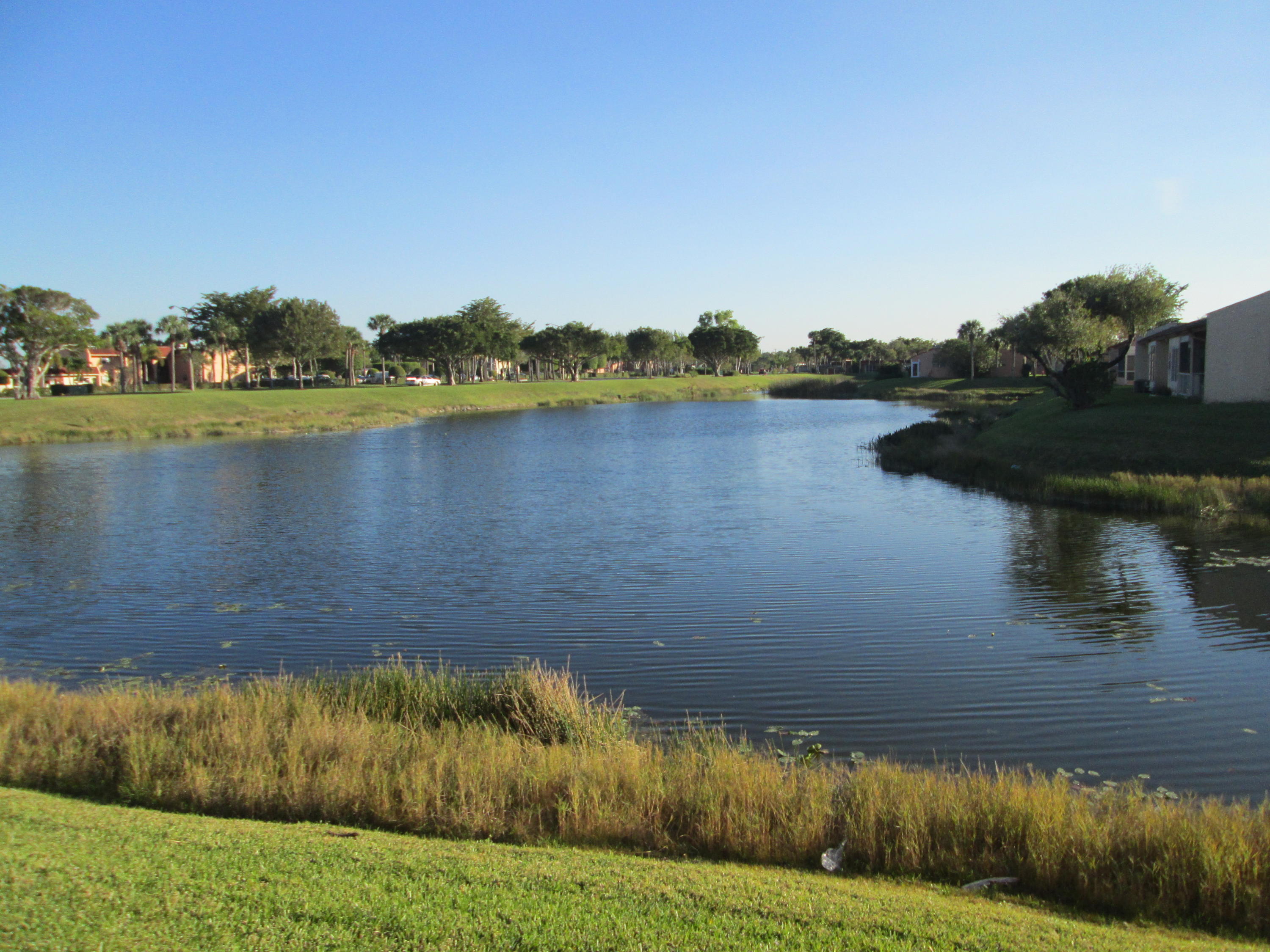 Stunning updated 2/2 with Lake view. New wood cabinets, solid surface molded counter, dbl crown molding in kit, appliances 1 yr old, raised panel doors w/new hardware, crown molding in master BR, new vent fans, Accordion Shutters and all new screening on patio. Front loading W/D. New knock down ceilings. (no popcorn) All tile floors. Short walk to Clubhouse. 24/7 guard gated active community w/full time social director. Courtesy Bus 2 days a wk to grocery, malls, shops etc. Close to shopping and approx. 15 min to downtown WPB, Kravis Center and City Place.