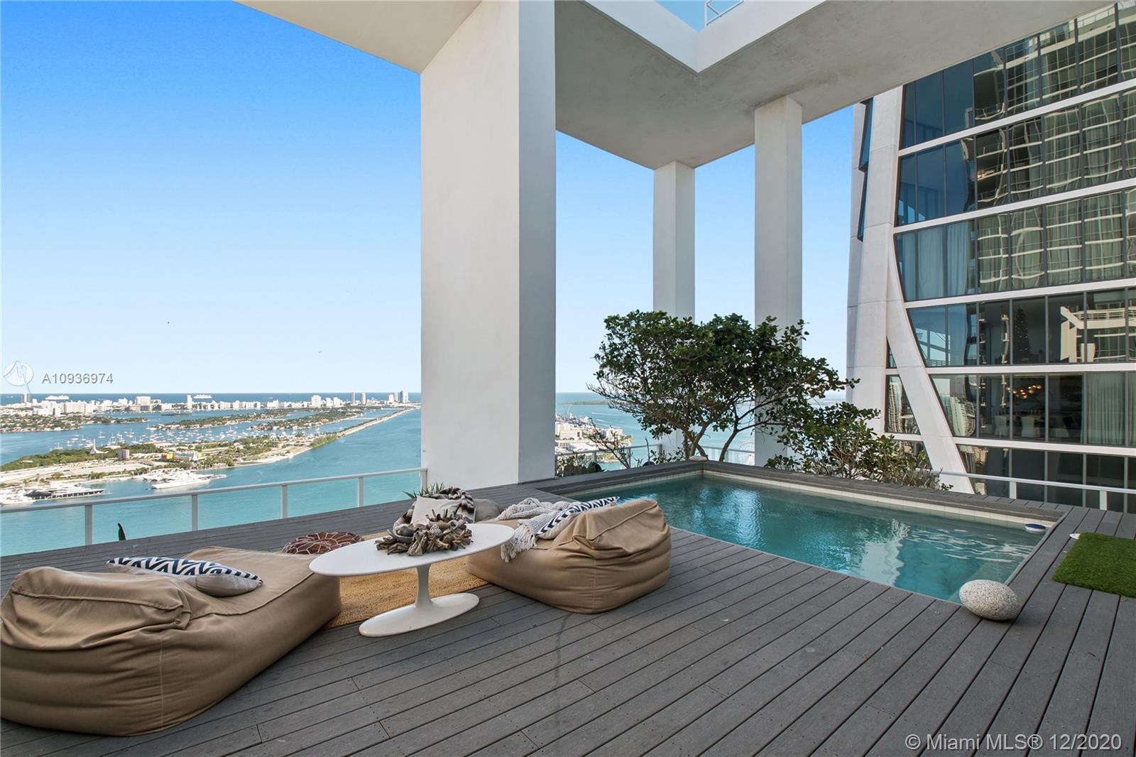 One of a kind 3-level Penthouse. Featuring 24- ft ceilings, private rooftop, plunge pool + 360° panoramic views of Miami skyline, Biscayne Bay, South Beach and Atlantic Ocean. This amazing unit of 5,247 sq.ft (as per owner, see floor plans) was designed by Oppenheim Architecture + Design with 5 bedroom/ 5.1 bathrooms, 2 master suites with private bathrooms, 2 TV rooms, 2 open kitchens, & 4 parking spaces . Enjoy resort style amenities with a 24 hour concierge, valet parking, fitness center and spa. Walking distance to Adrienne Arsht Center, museums & restaurants. Definitely one of the best penthouses in all Miami!