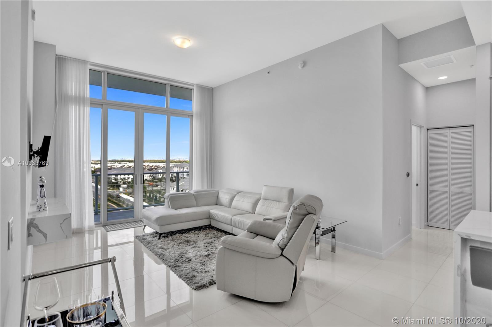 Fully Renovated PENTHOUSE For Sale in Midtown Doral. This 2 Bedrooms/2 Baths unit features High ceilings with porcelain tile floors. Modern designer kitchen with quartz countertops, new Bosch and Samsung stainless steel appliances, and European finishes. Bathrooms remodeled with quartz countertops and fresh tiles. NEW washer and dryer. Soundproof panels. No Expense Spared! Large balcony with private views of the Miami skyline. Two assigned parking spaces. Low HOA! TURN KEY ready.