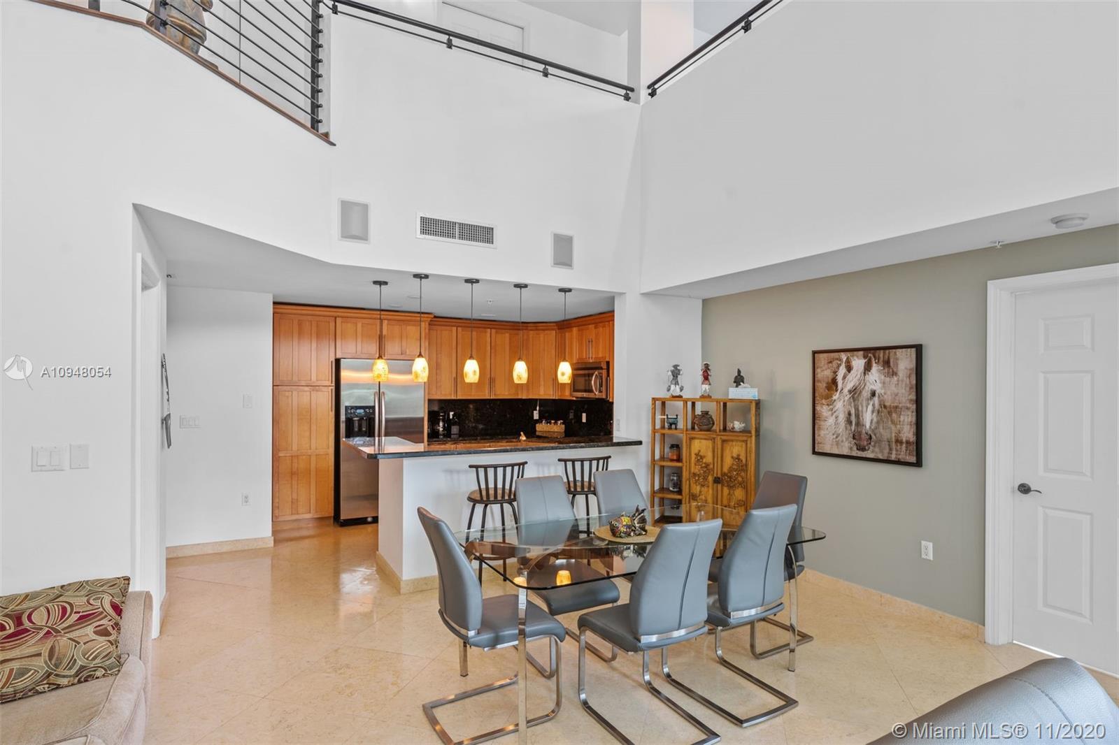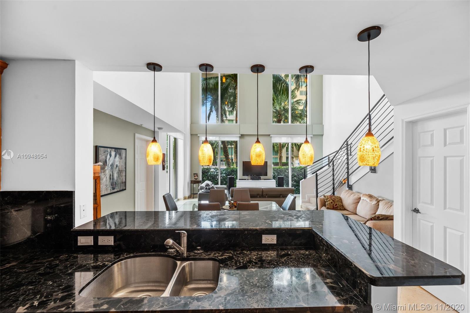 Exceptional, rarely available 2-story corner townhouse with pool, lake, & golf course views. This fully updated 2/2.5 condo has large private outdoor terrace leading to pool. Dramatic 20 ft. vaulted ceilings throughout spacious living area, & floor to ceiling impact windows maximize your views & natural light. Fully equipped modern kitchen is perfect for entertaining with granite countertops, SS appliances and wood cabinetry. Marble and Brazilian hard wood floors. Convenient 2nd floor laundry room & 2 assigned parking spaces plus valet. Amenities include 24 hr. sec., business center, theater, tennis, spa & fitness center, jogging path, heated pool, billiard & party room. Walk to the beach, coffee and shops. Maint. INCLUDES cable/internet, H2O/sewer/trash/appliance contract. Broker remarks.