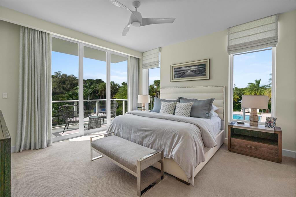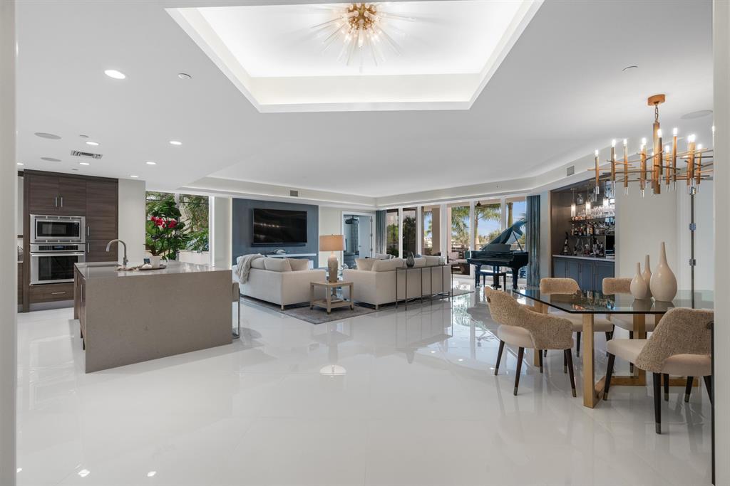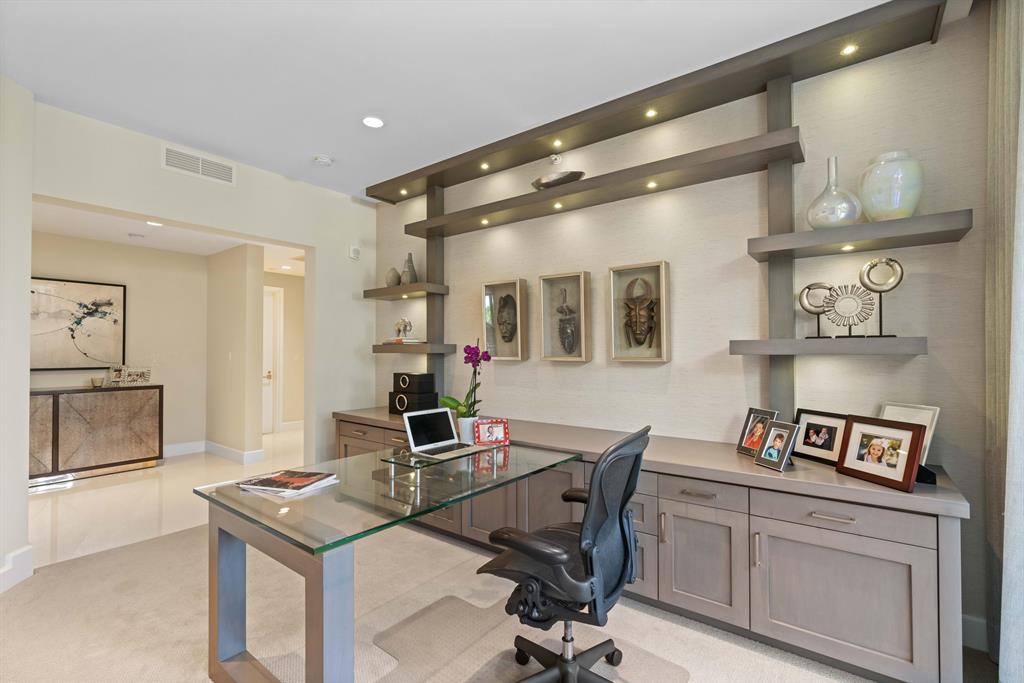 Sold furnished, this beautifully designed Decorator's Unlimited home features long marina views, a privately-keyed elevator, 725 sf of tiled, covered terraces with glass balcony rails, 10' ceilings in living areas (including custom drapery pockets and lighting soffits) and master suite, custom built-ins in the study, great room and home theater. The main living areas feature 48″ square porcelain tile flooring and the kitchen and baths include custom architectural grade cabinets. All appliances are Thermador with both the kitchen refrigerator and dishwasher being paneled. The kitchen island features quartz countertops w/waterfalls, and an island workstation with ample seating. The master suites are gracious with his and her walk-in closets that included custom built-ins and lighting.