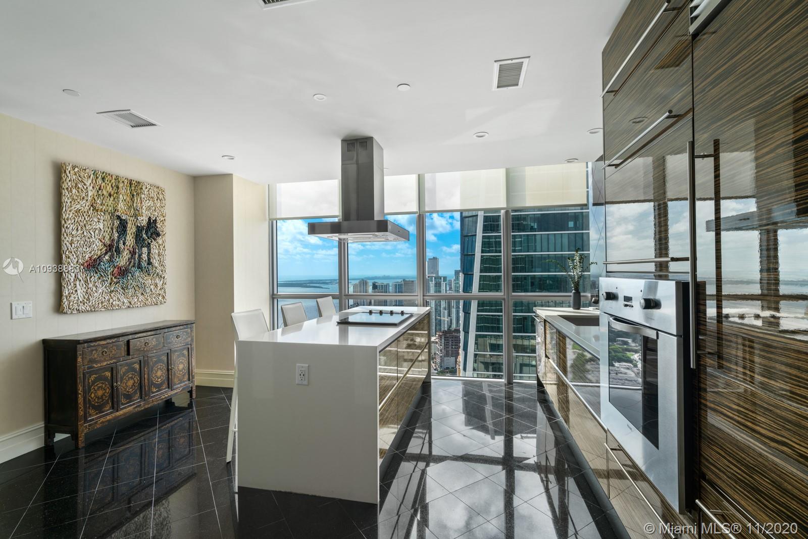 Views, Views and Views from this unique south corner residence at Marquis. Enter the foyer through a private elevator and enjoy expansive views of Biscayne Bay, Miami Beach and the Miami Skyline from its bright and open double wide living room with floor to ceiling glass windows. Professionally remodeled, this residence has been converted into a 1-bedroom master suite that connects to a second room perfect for a home office, gym or lounge. Custom kitchen has Viking appliances, cream leather wallpapers, black marble floors and backsplash, with walk-in pantry. Marquis offers the ultimate lifestyle with unparalleled access to the Design District, the Adrienne Arsht Center, Museum Park, the American Airlines Arena, Joe’s Stone Crab, Miami Airline Terminals, and Metro Mover station.